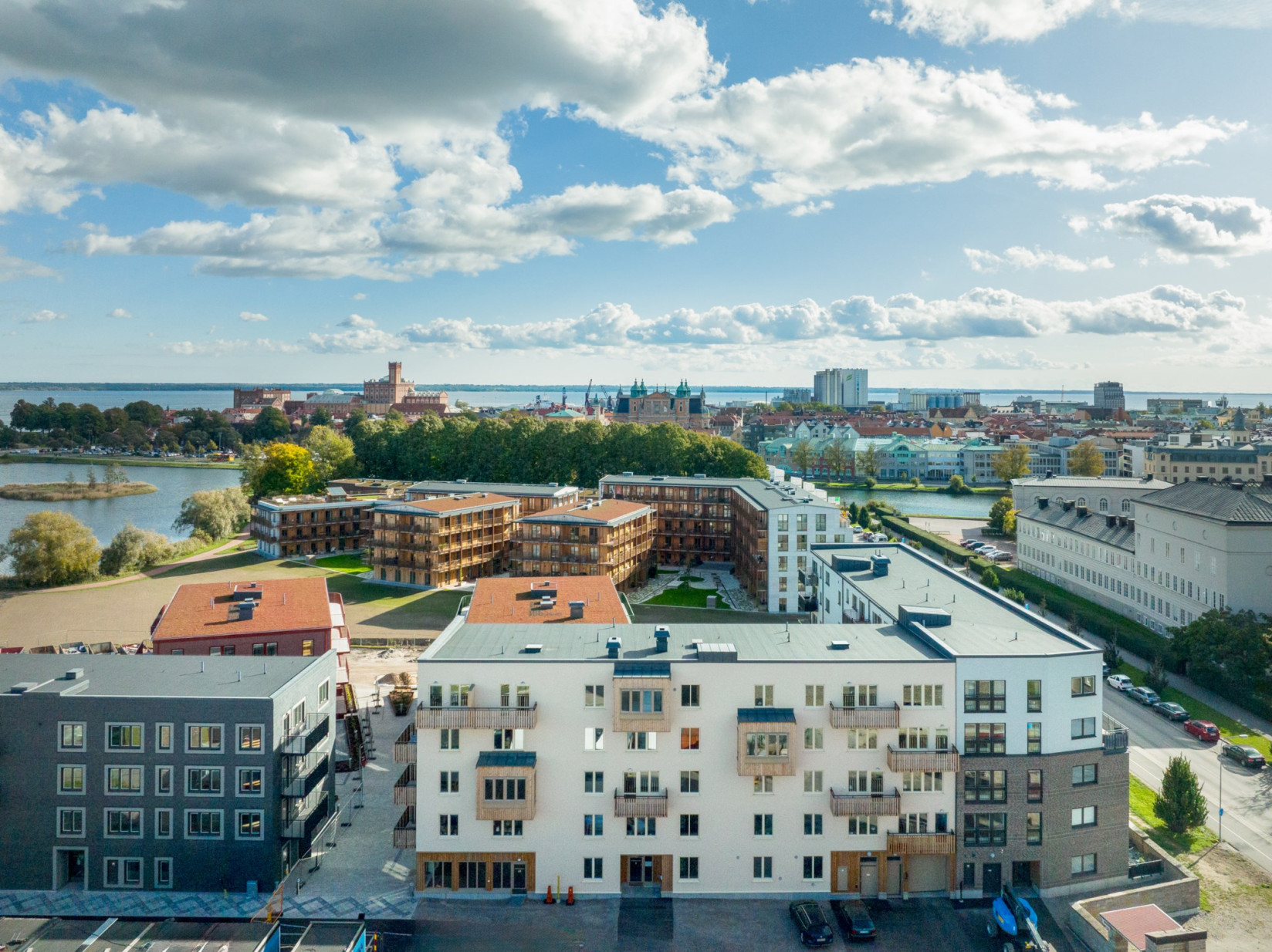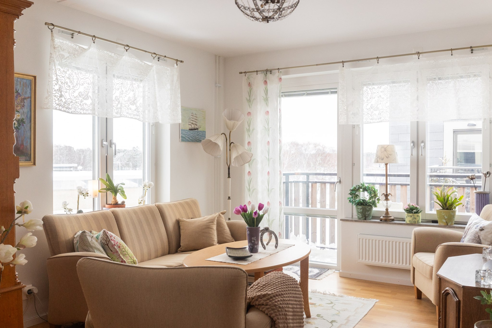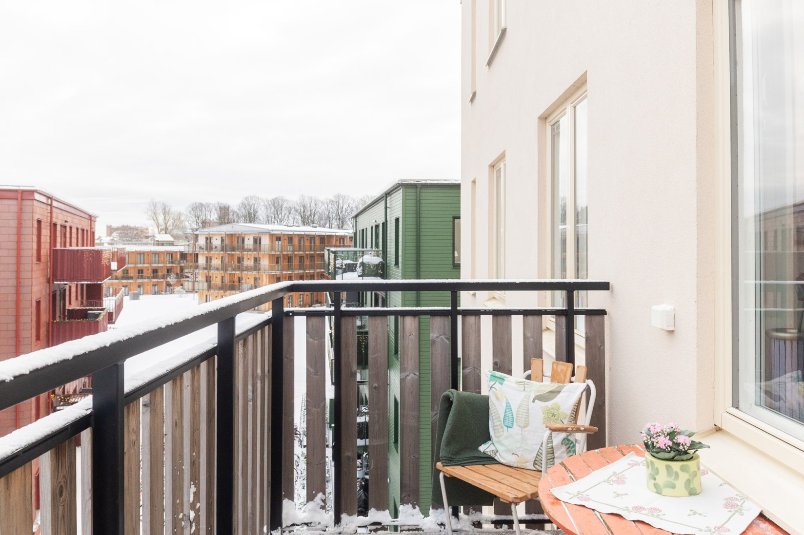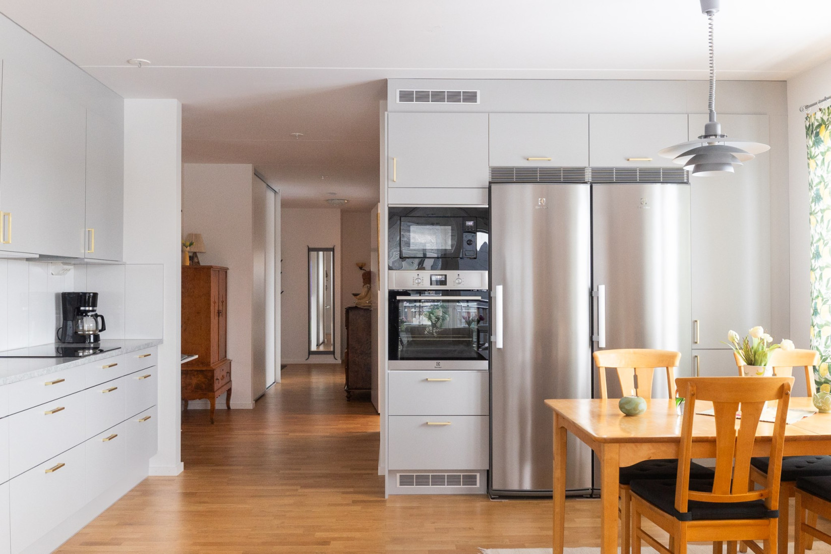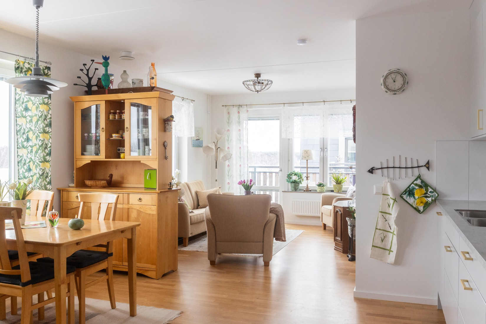 Från hallen öppnar bostaden upp sig mot kök och vardagsrum i en öppen planlösning som bjuder in till umgänge. Här breder ett luftigt och flexibelt sällskapsrum ut sig med utsikt över Fredriksskans och Lindöfjärden. Det är lätt att se både middagar med vänner och lugna kvällar i soffan ta form här. Från vardagsrummet nås den generösa balkongen, en plats som förlänger rummet och förstärker känslan av rymd och frihet.