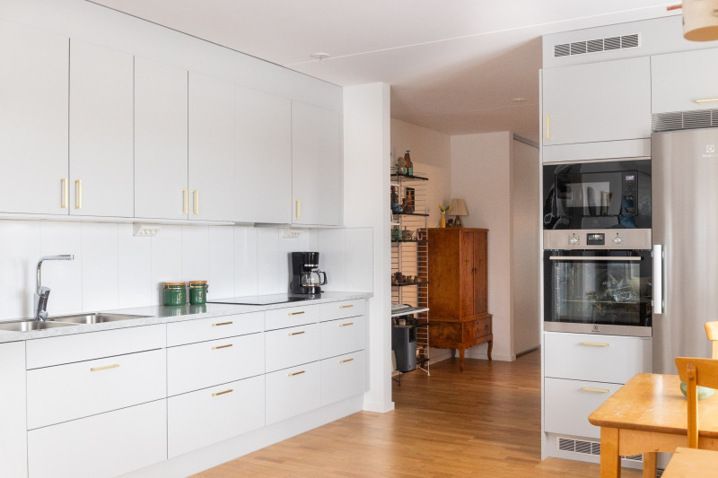 Köket går i en modern och tidlös stil där ljuset får ta plats genom flera fönster. Den maskinella utrustningen är komplett med inbyggnadsugn och mikro, induktionshäll, fläkt, hel kyl och frys samt diskmaskin – allt samlat i en lösning som gör matlagningen både inspirerande och smidig.