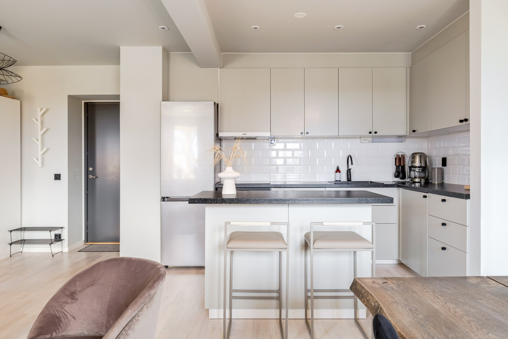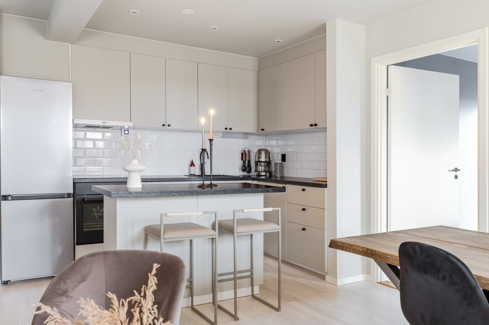 På Bruksgatan 1 ligger kök och vardagsrum i en öppen planlösning fokuserat på socialt och trivsamt umgänge. Ytan är stor har plats för stort middagsbord, soffbord, tv-möbel och fåtölj. Dessutom finns en köksö som bidrar till att rummen sluter samman på ett bra sätt, den erbjuder dessutom bra förvaring. Tack vare stora fönsterpartier är rummet ljust och köket är utrustat med kyl/frys, integrerad diskmaskin, ugn, spishäll och fläkt.