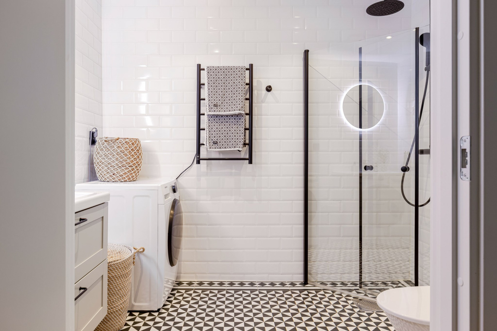 Helkaklat badrum i mycket gott skick. Utrustning i form av dusch, kombinerad tvättmaskin/torktumlare och kommod med handfat.