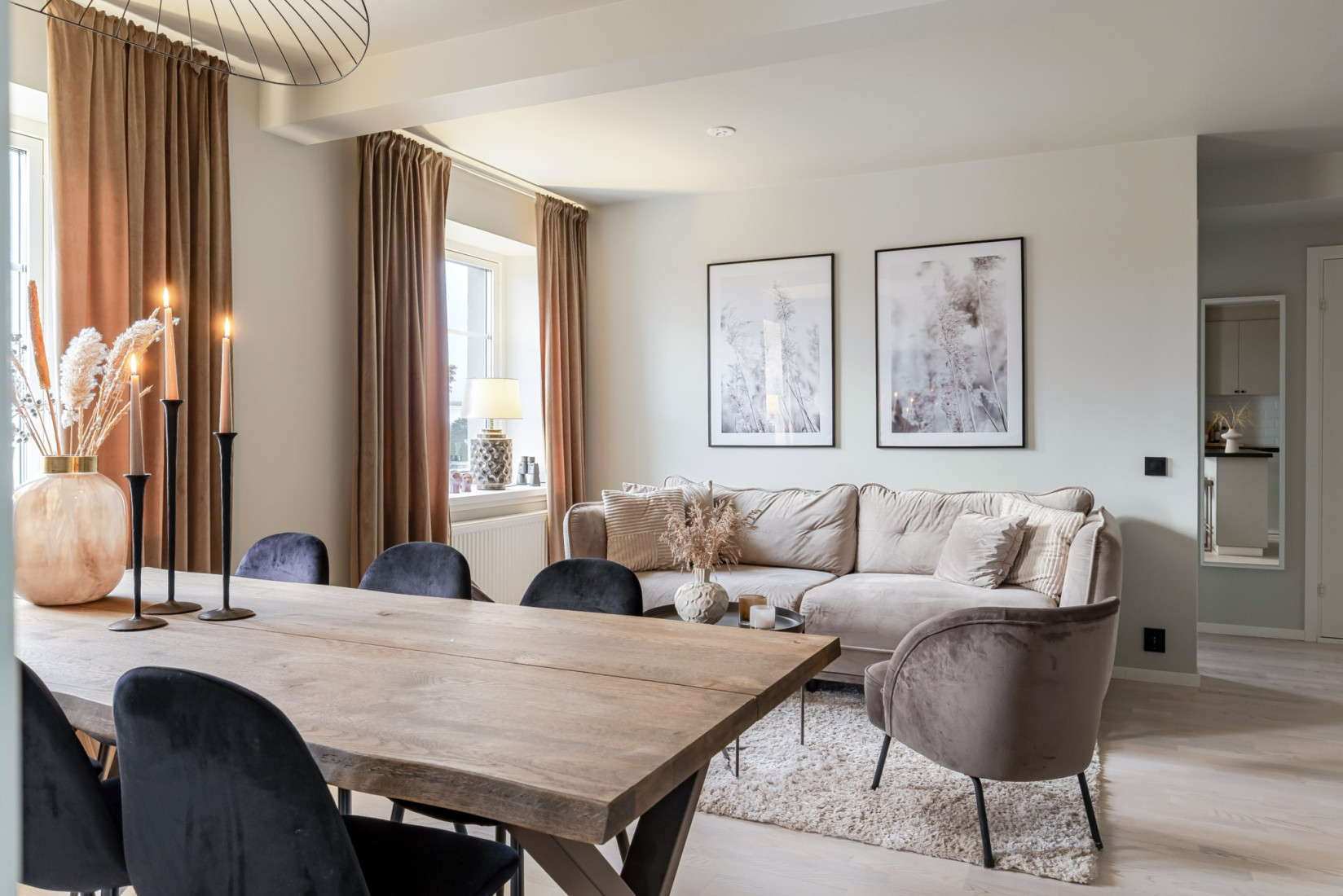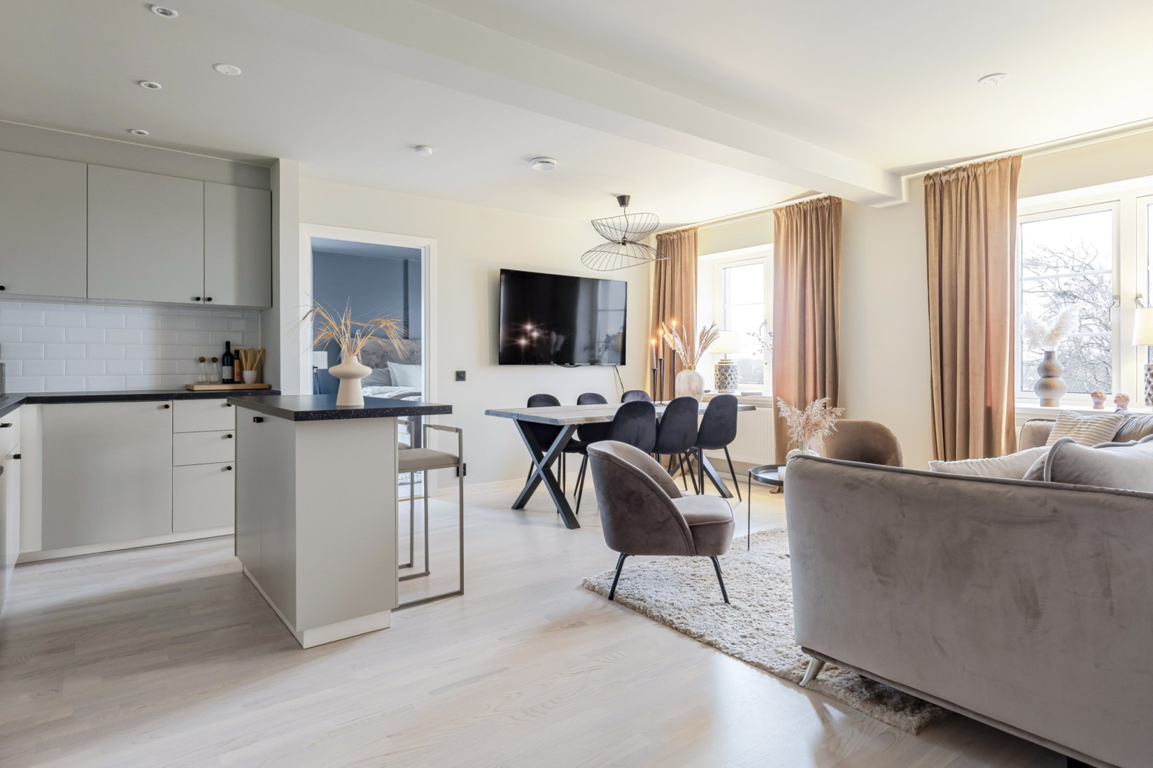 Ta klivet in i den inbjudande hallen, fötterna sätter du på ett ekparkett som löper enhetligt genom hela lägenheten.