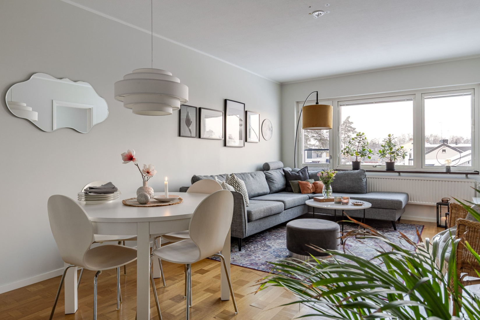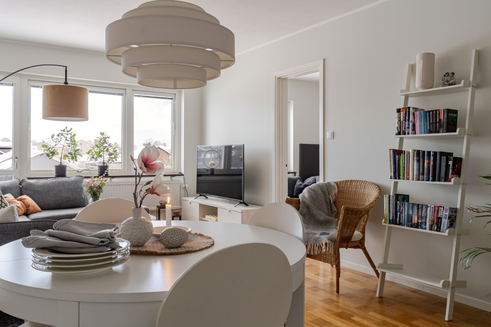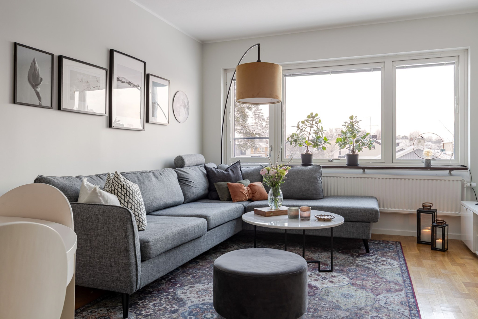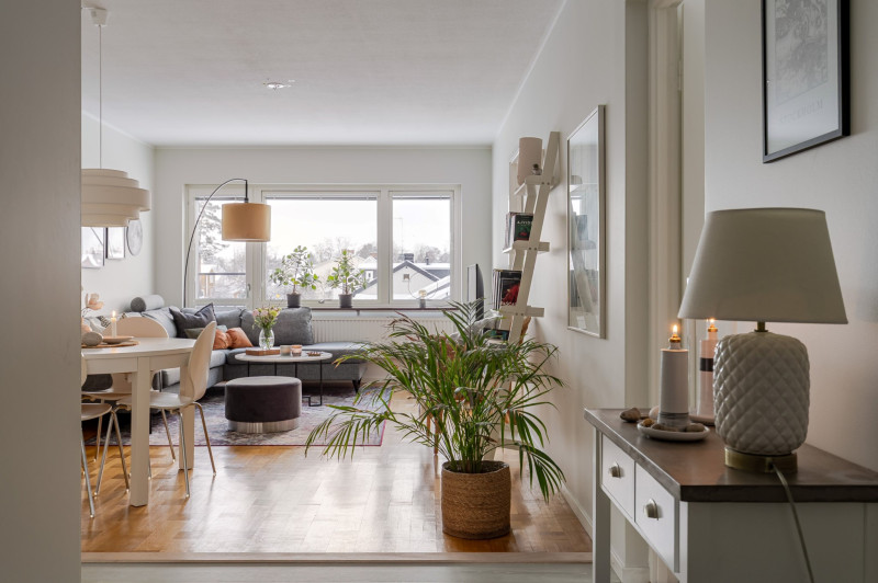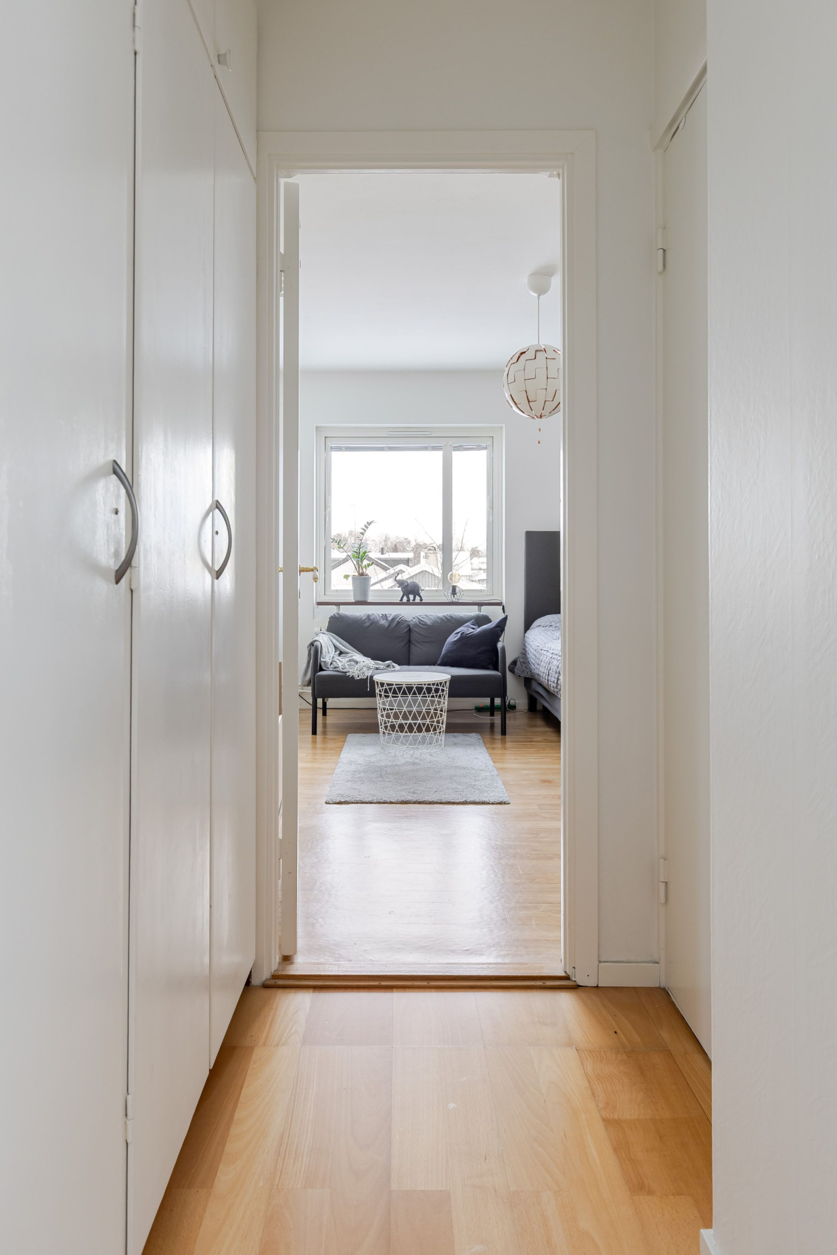 Rakt fram öppnar sig det rymliga vardagsrummet med gott om utrymme för soffa, soffbord, tv-bänk och flera möbleringsalternativ. De stora fönsterpartierna ger ett fint naturligt ljus och den franska balkongen gör det enkelt att vädra och släppa in frisk luft.