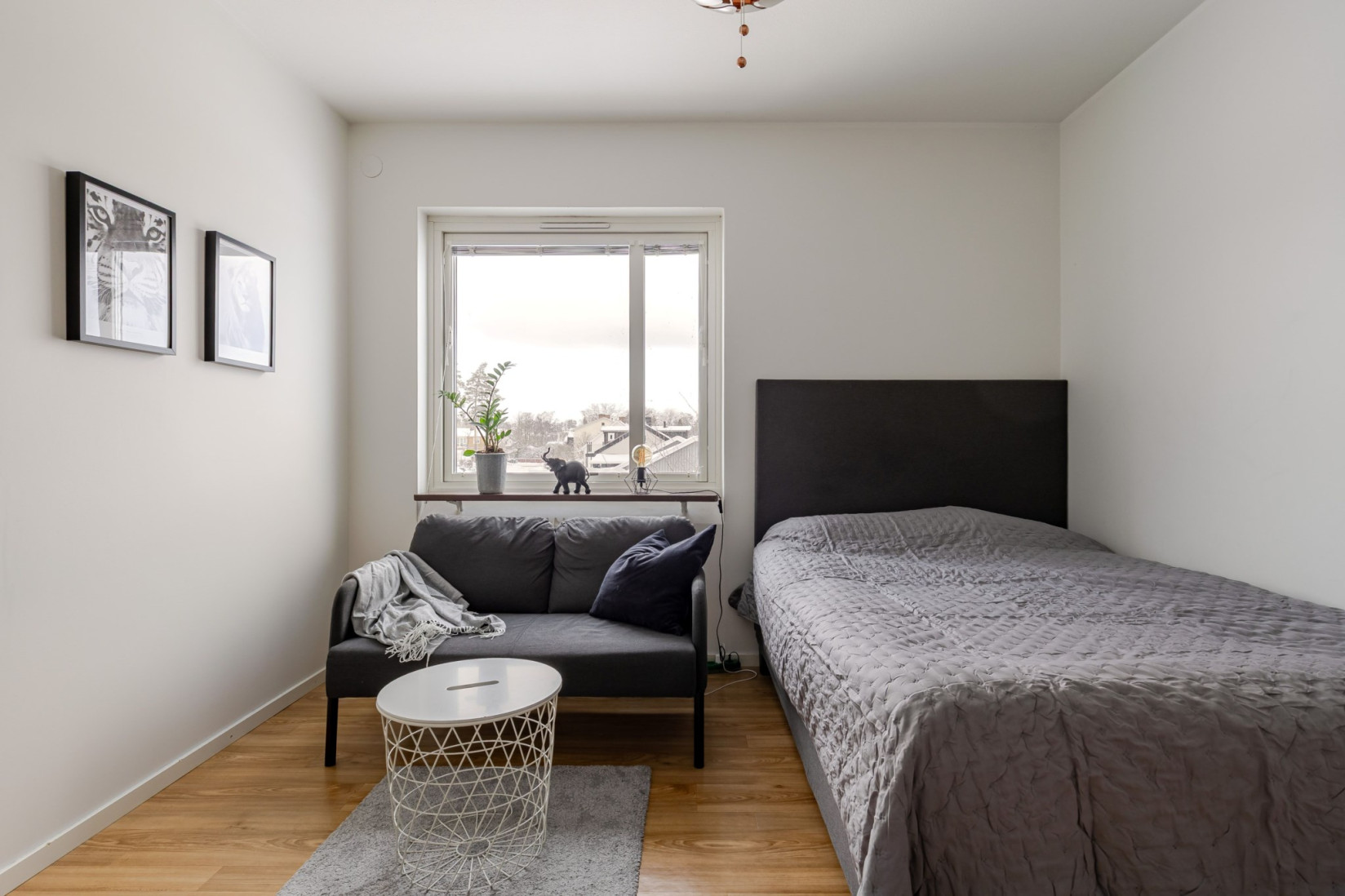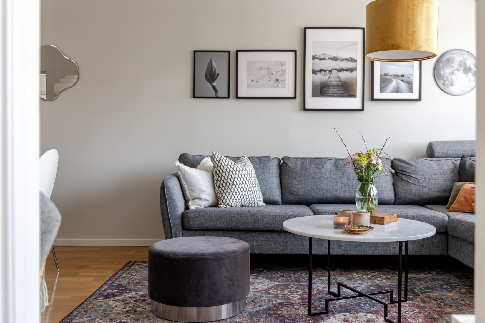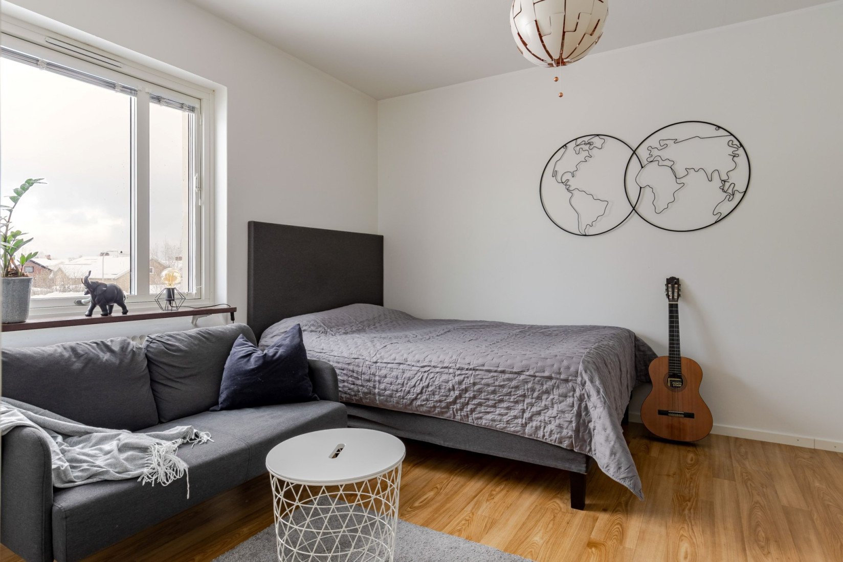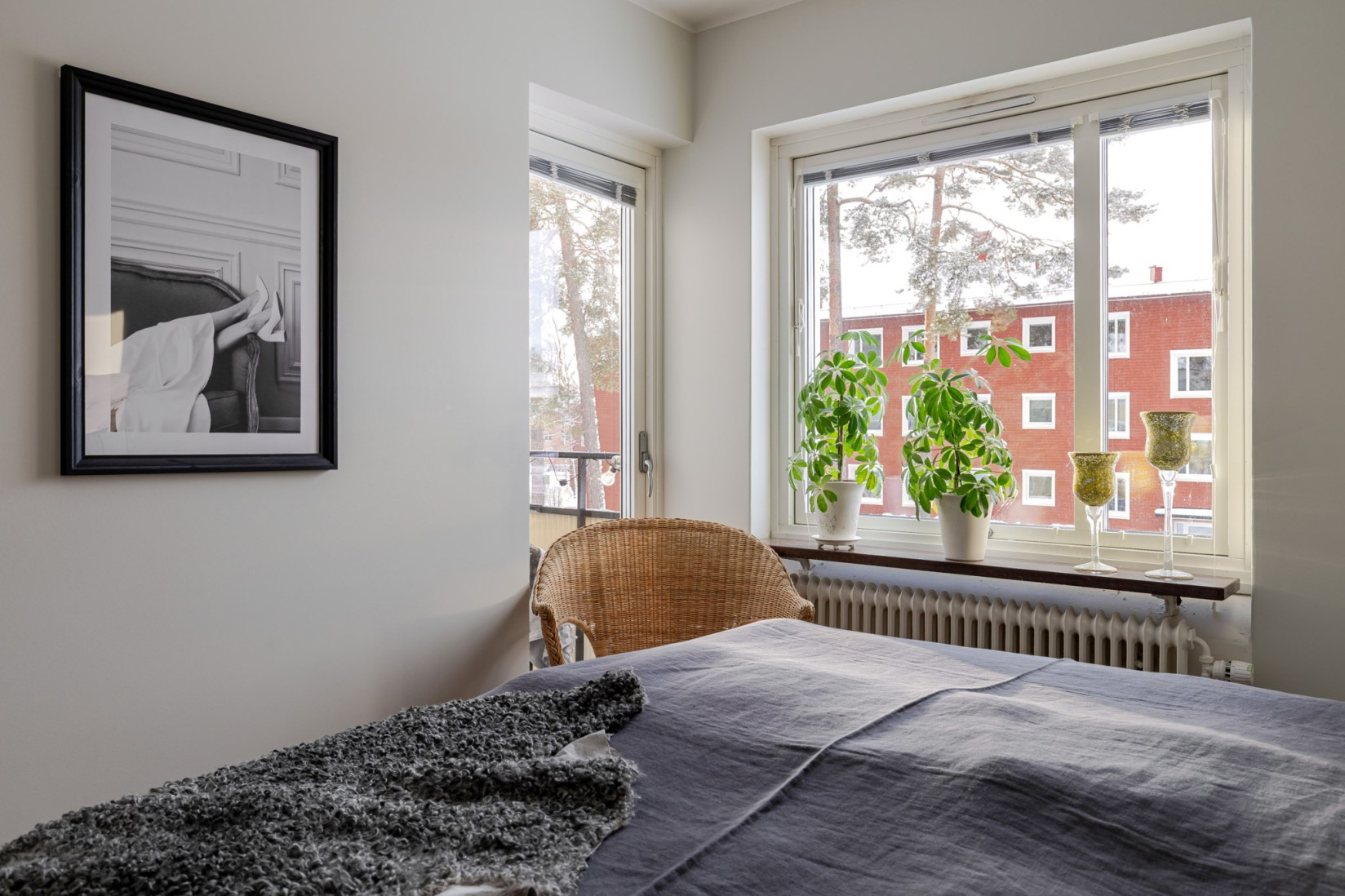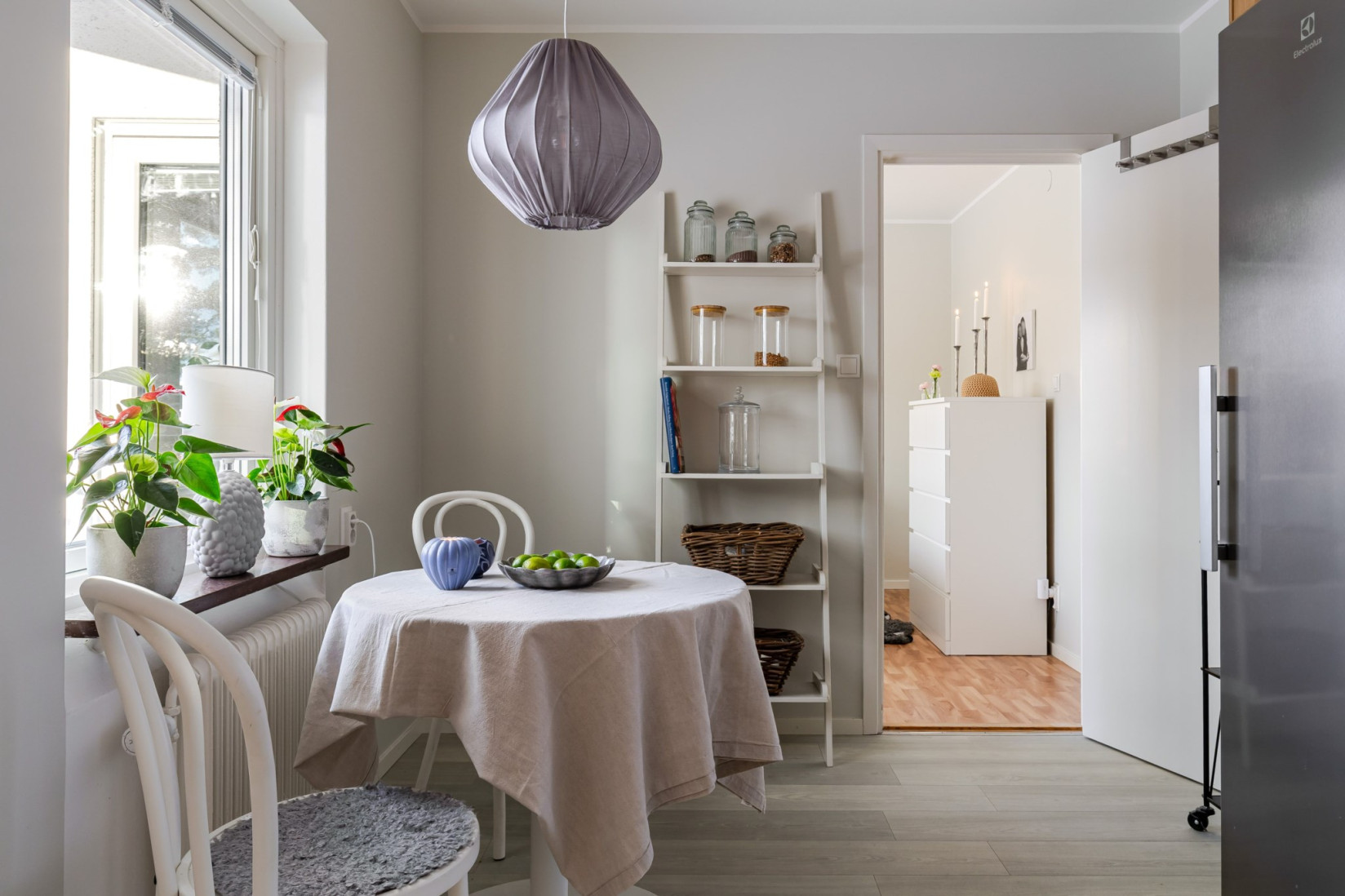 Rakt fram öppnar sig det rymliga vardagsrummet med gott om utrymme för soffa, soffbord, tv-bänk och flera möbleringsalternativ. De stora fönsterpartierna ger ett fint naturligt ljus och den franska balkongen gör det enkelt att vädra och släppa in frisk luft.