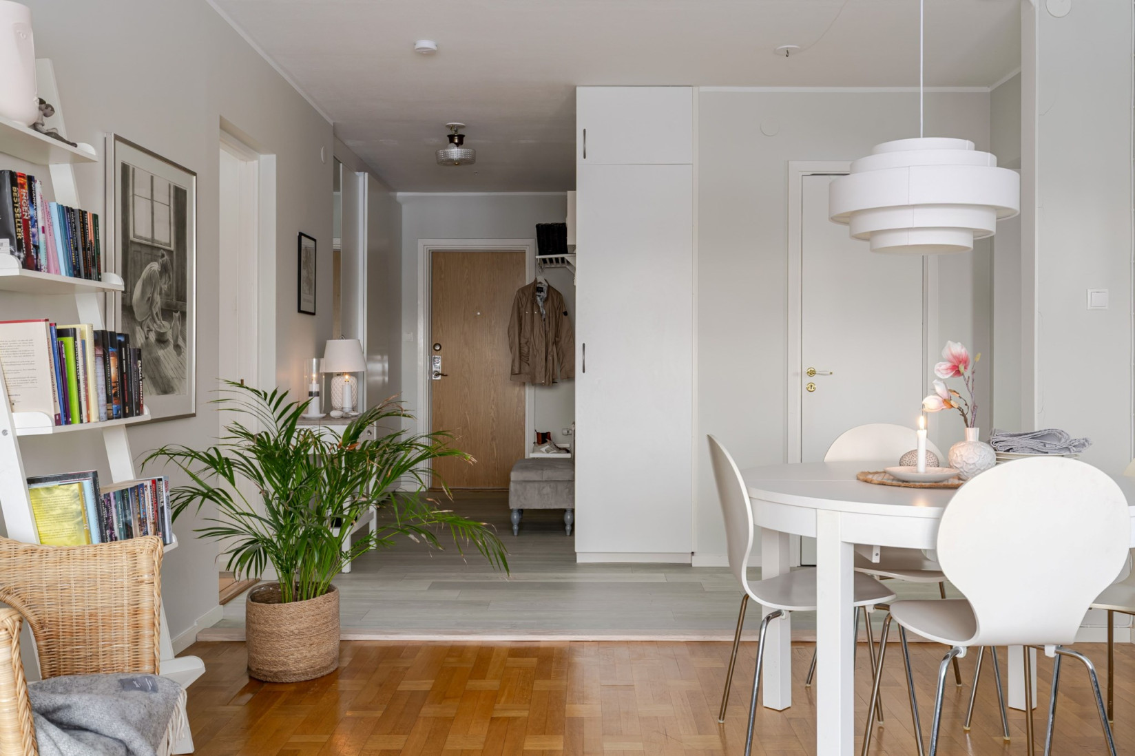 Vi stiger in i en välkomnande hall på andra våningen med plats för avhängning av ytterkläder och skor samt kompletterande förvaring i garderober. Redan här möts du av ett generöst ljusinsläpp tack vare öppningen mot vardagsrummet.
