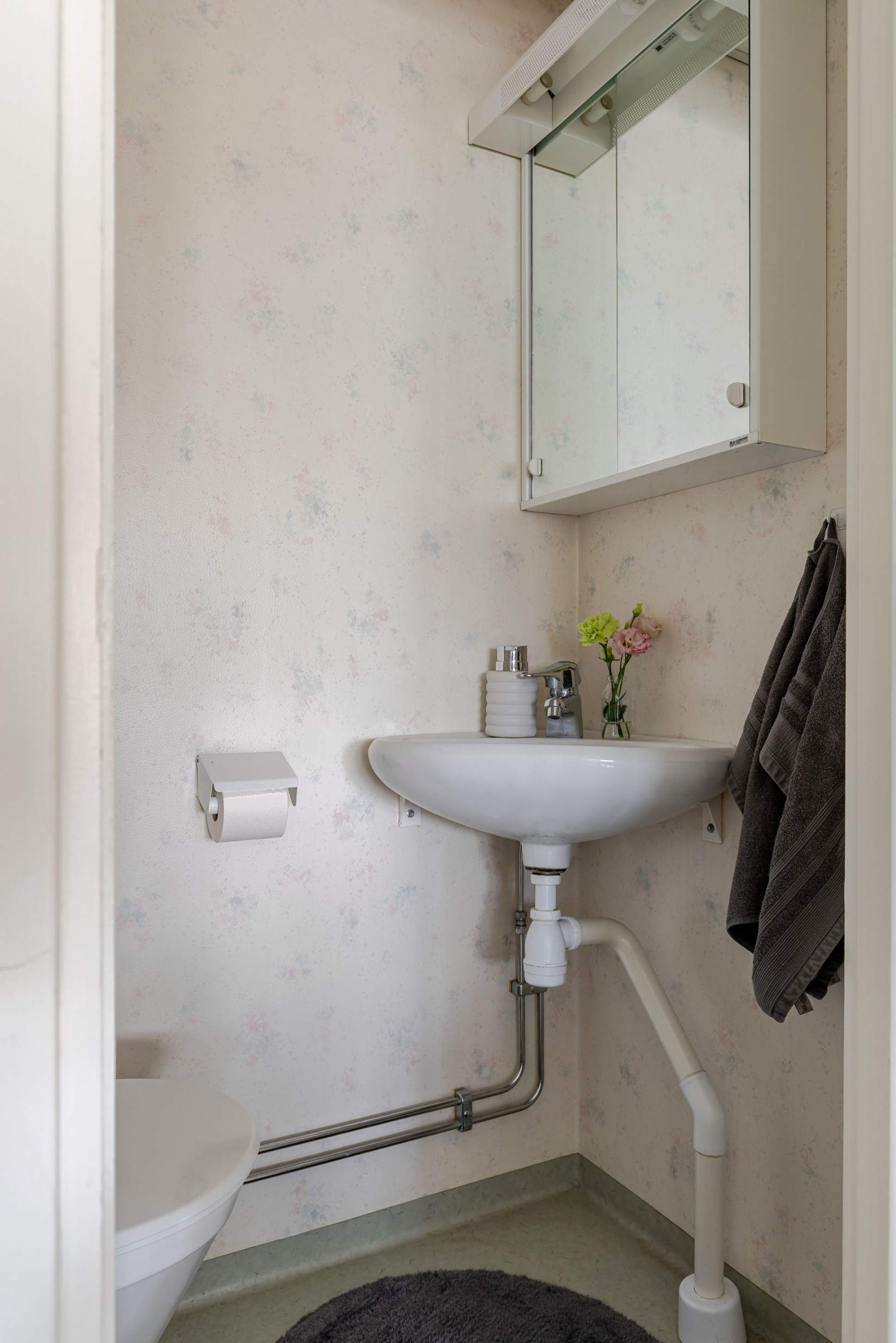 I hallen, i anslutning mot köket, finns dessutom en gäst-wc – ett uppskattat komplement som underlättar både vardagen och vid besök.