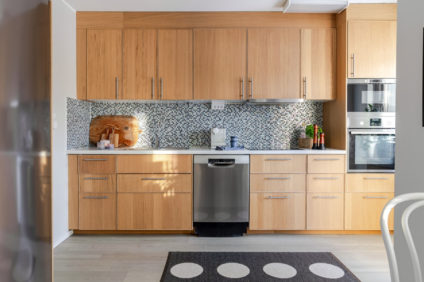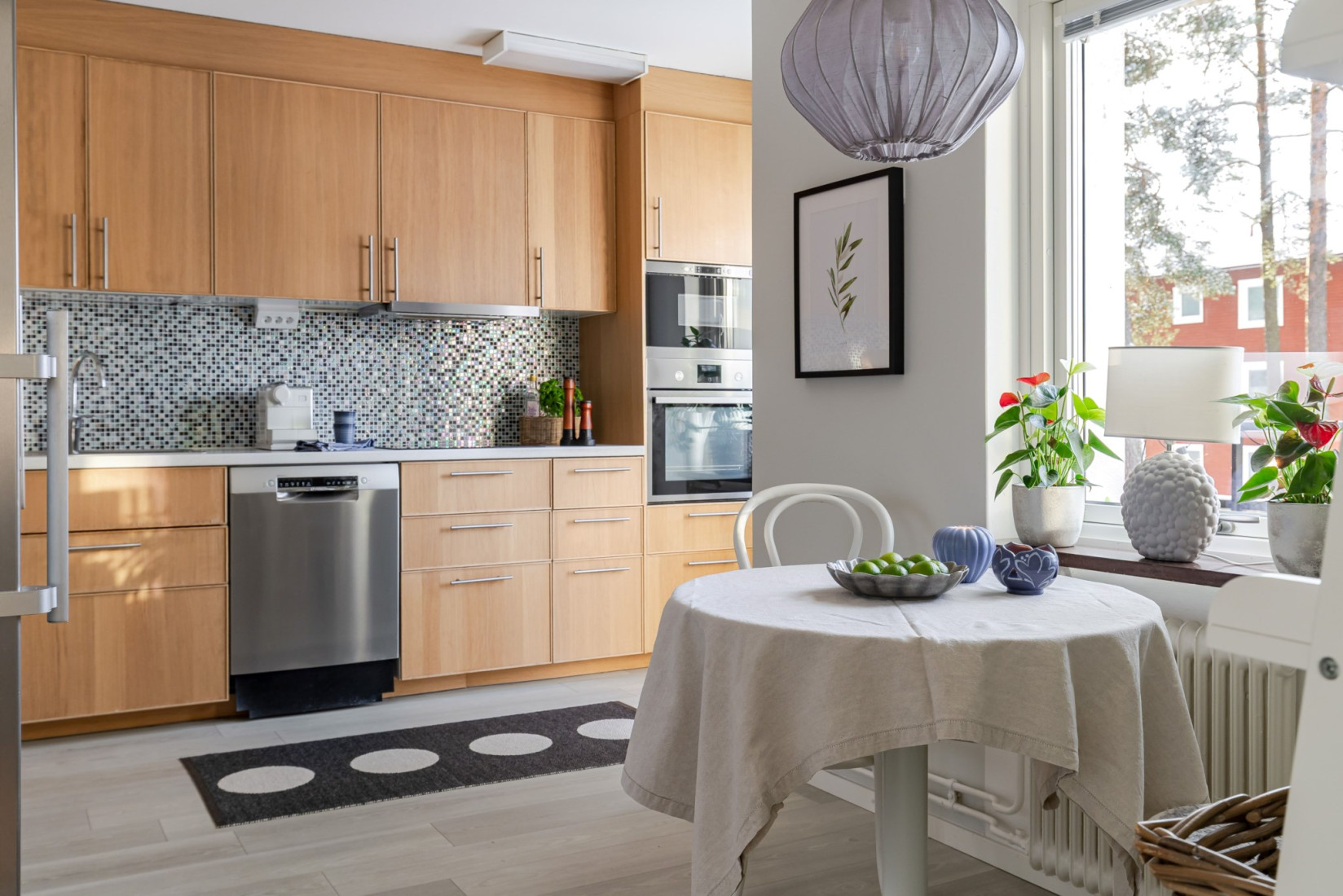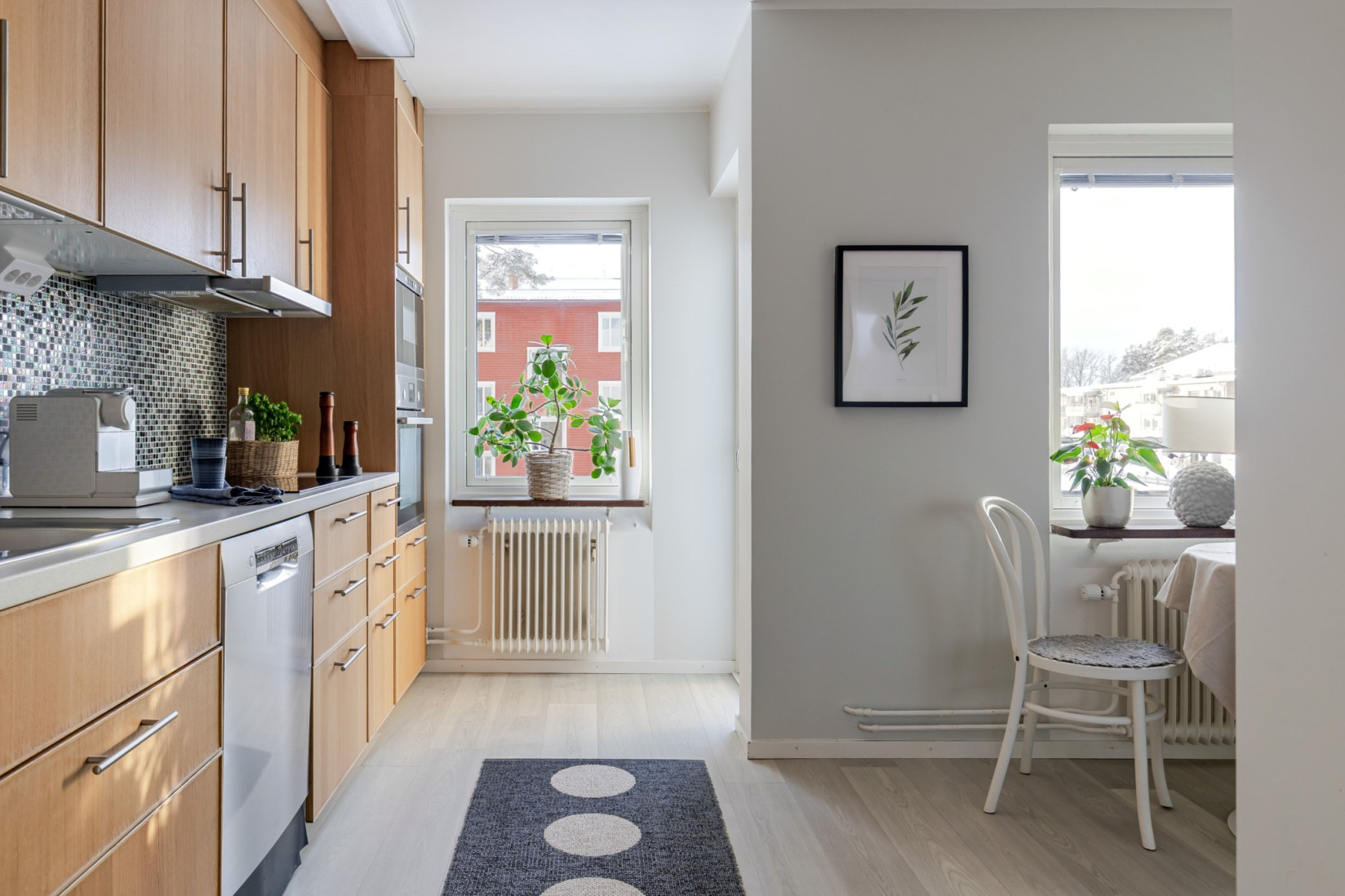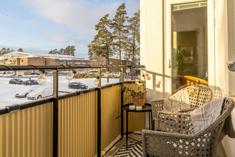 Till vänster från hallen ligger köket, trevligt planerat med en separat matdel. Här finns möjlighet att behålla den nuvarande planlösningen eller, för den som önskar, skapa ett mer öppet och sammanhängande kök. Från köket nås balkongen i västerläge, där eftermiddags- och kvällssolen kan avnjutas.