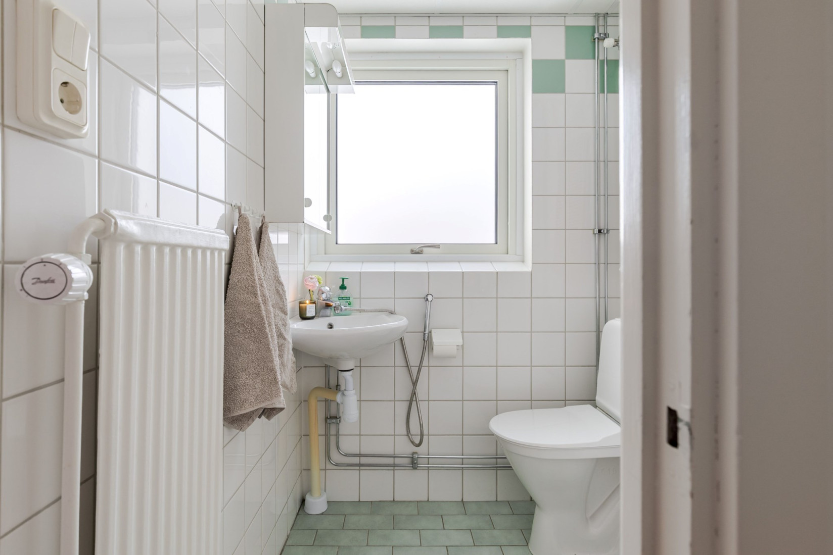 I passagen finns även bostadens badrum, utrustat med toalett, handfat, dusch samt öppningsbart fönster som bidrar till både ljus och vädringsmöjlighet.