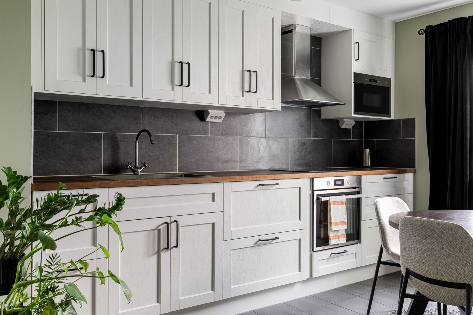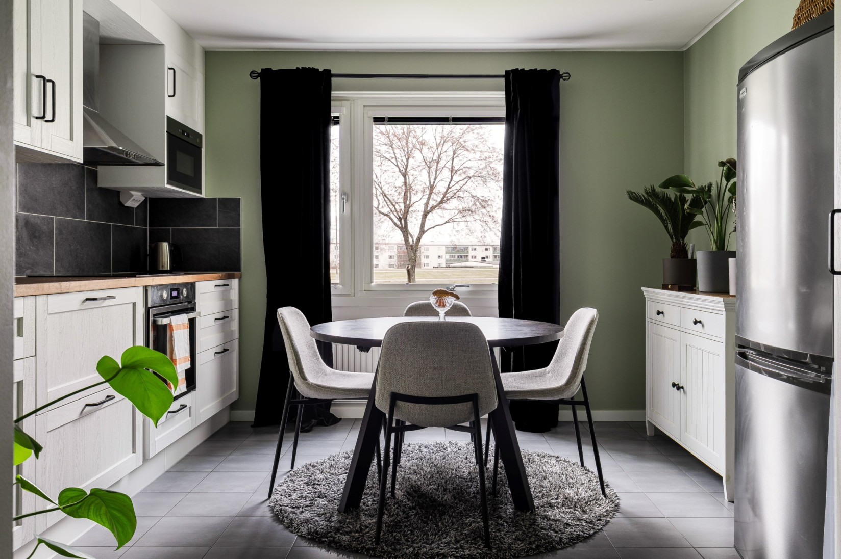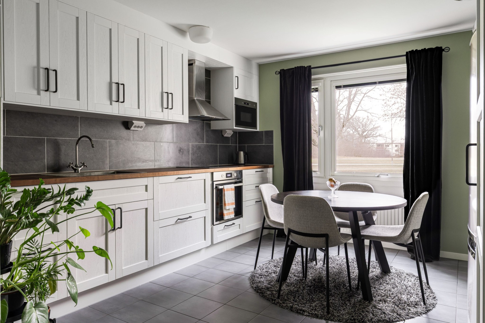 Rakt fram är det fullstora köket beläget. Lyxigt med ett kök i denna storlek i en etta! Intill det stora fönsterpartiet ryms hela middagssällskapet och du erbjuds gott om förvaringsmöjligheter i flera lådor och skåp. Vita profilerade luckor kombineras med mörkt kakel. Den maskinella utrustningen består av ugn, häll, micro, kyl/frys samt fläkt.