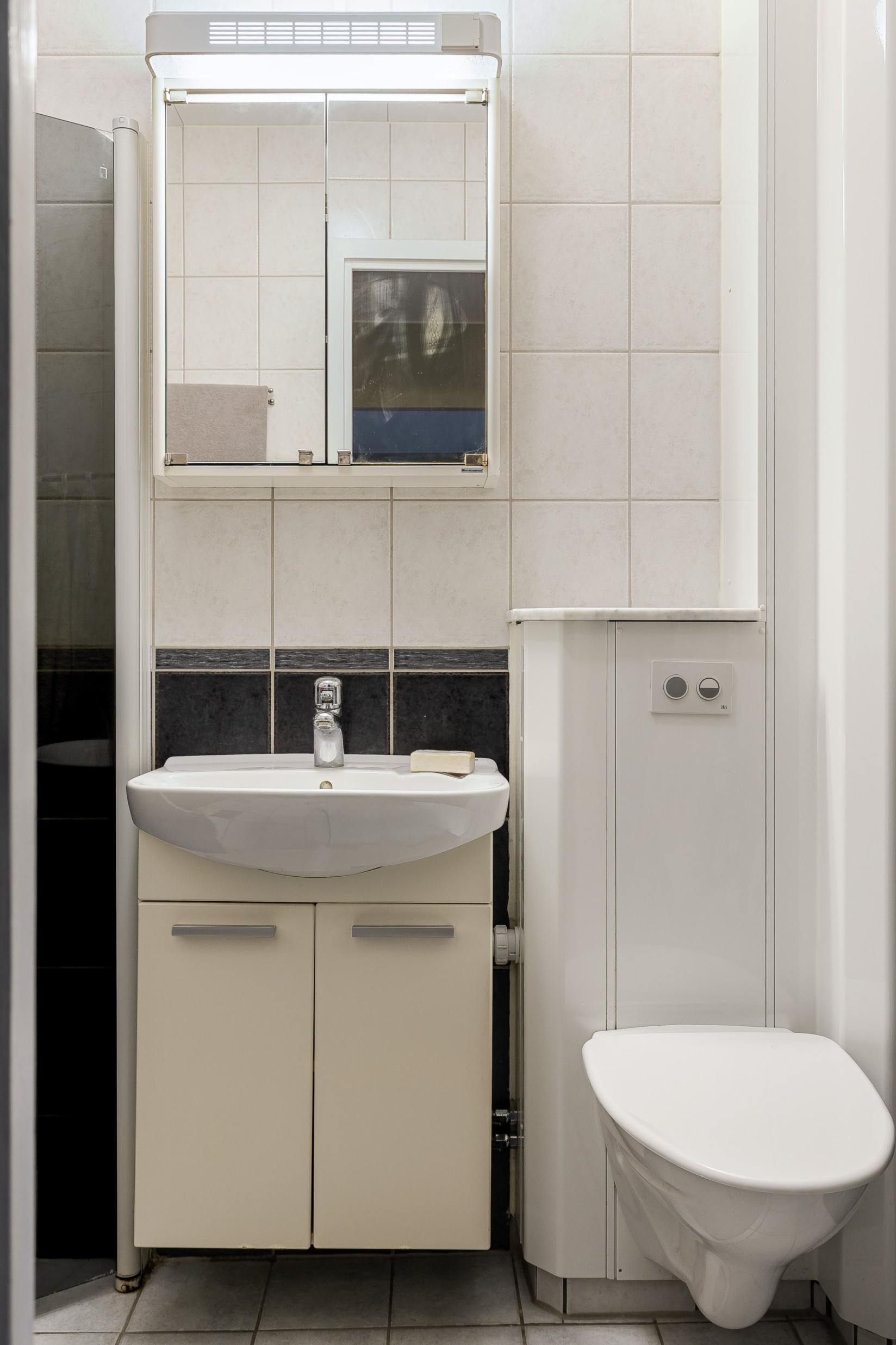 Badrummet är fräscht och helkaklat med stilrena färgval som ger en tidlös känsla. Här finns dusch, handfat med kommod, spegelskåp med belysning och vägghängd WC.