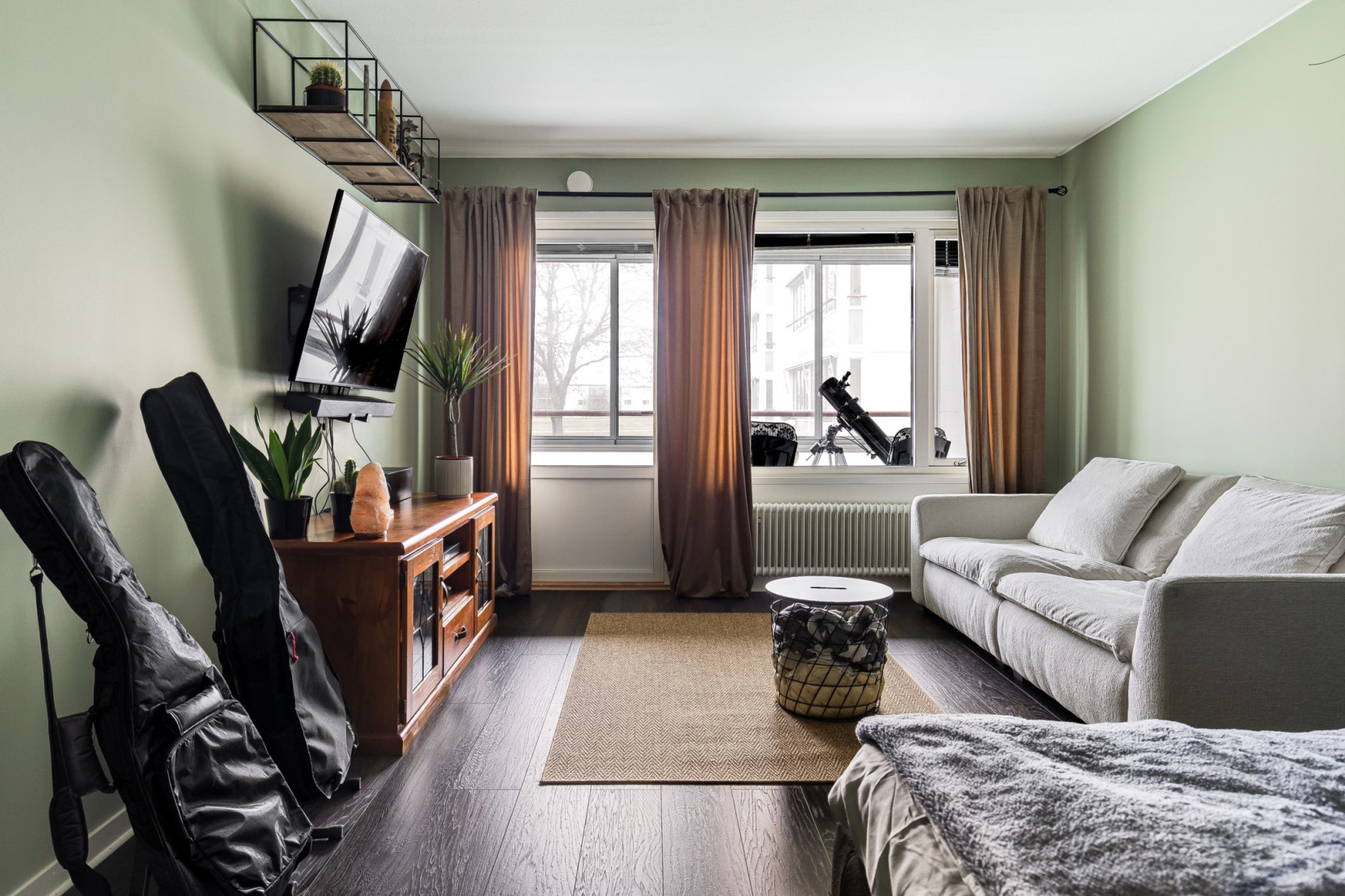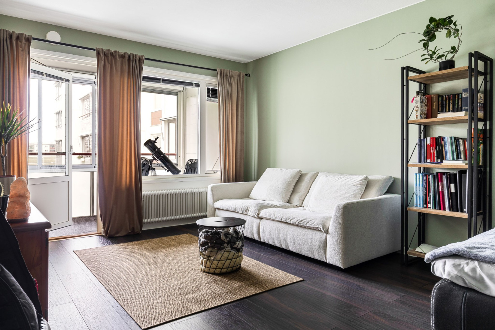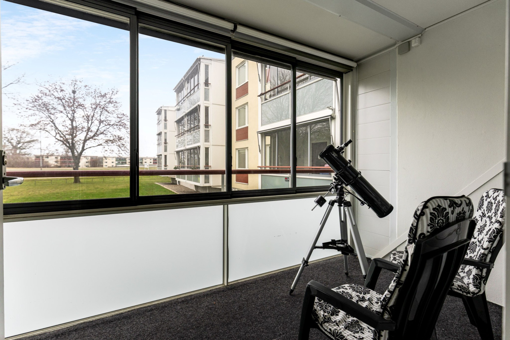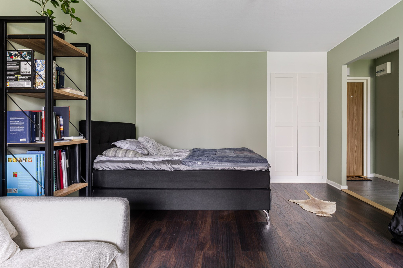 Allrummet nås till höger från hallen. Dina fötter placeras på ett nytt, fint golv och väggarna är nyspacklade och målade i en modern ljusgrön färg. Rummets många kvadratmeter gör det lätt att inreda för både sovplats och umgängesyta. Direkt till höger när du kommer in i rummet förvaring i två inbyggda garderober. Från allrummet nås den inglasade balkongen som förlänger det redan generösa rummet med ytterligare kvadratmeter. Jag kan lova dig att du inte kommer hitta många ettor med en balkong i denna storlek! Tack vare inglasningen kan balkongen nyttjas från tidig vår till sen höst. Under de varmaste dagarna öppnat du enkelt upp de skjutbara fönsterpartierna. Balkongen är även utrustad med en fjärrstyrd markis som kan ställas in efter väder.