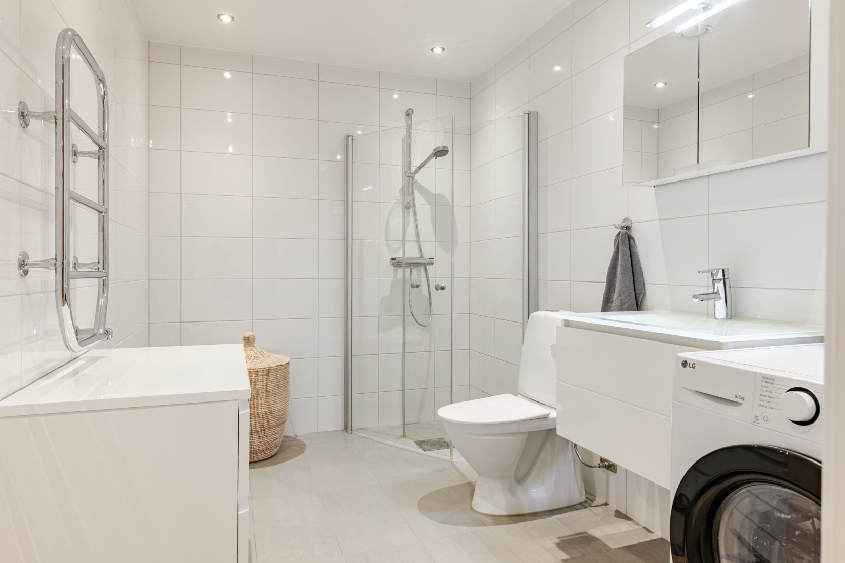 Badrummet är fräscht och helkaklat i ljusa toner med golvvärme som ger extra komfort. Den generösa ytan rymmer kommod med förvaring, spegelskåp med belysning, dusch med vikbara glasväggar, toalett samt handdukstork. Egen tvättmaskin med kombinerad tvätt/tork underlättar vardagen, och infälld belysning i tak bidrar till ett modernt helhetsintryck.
