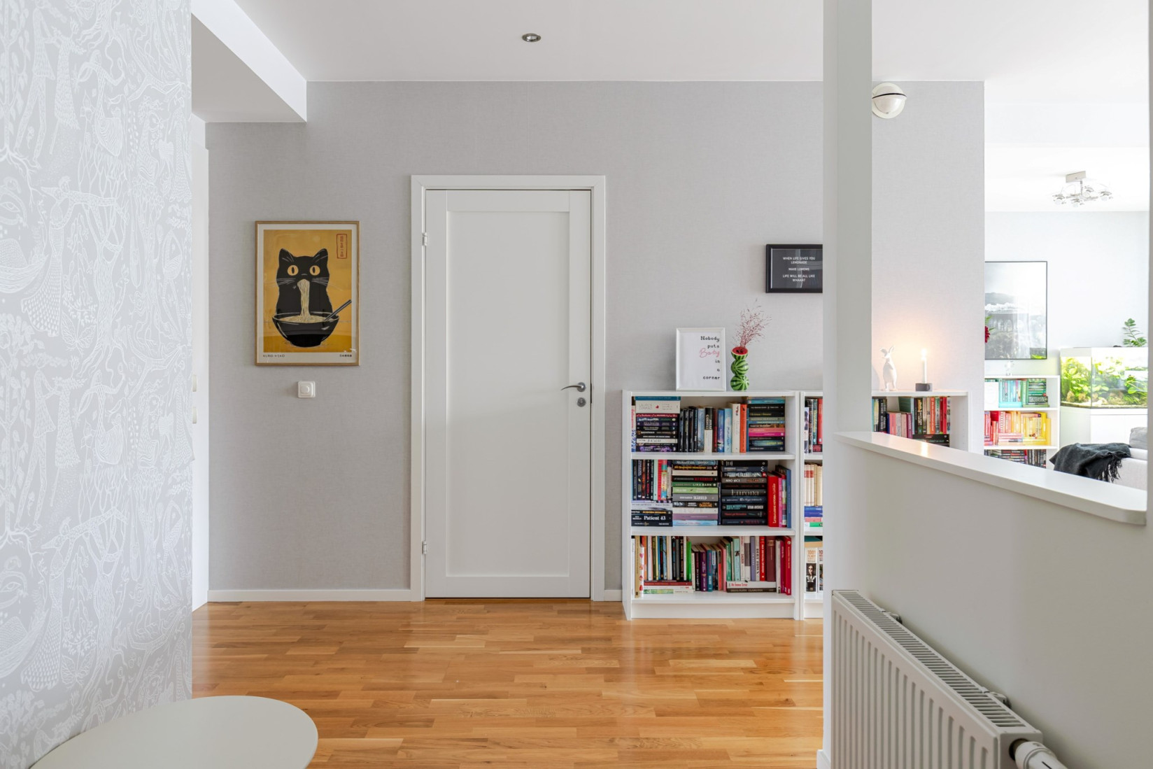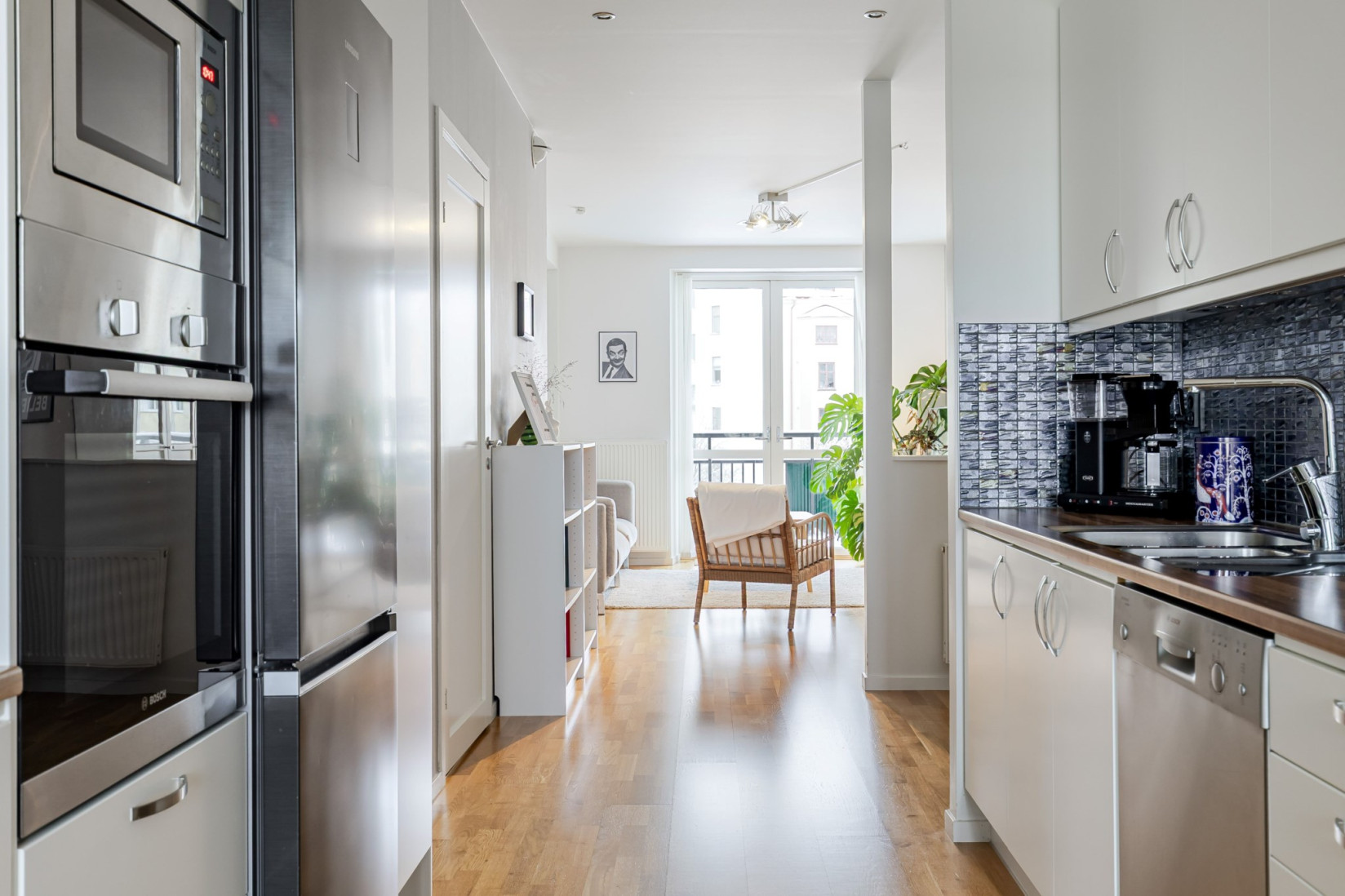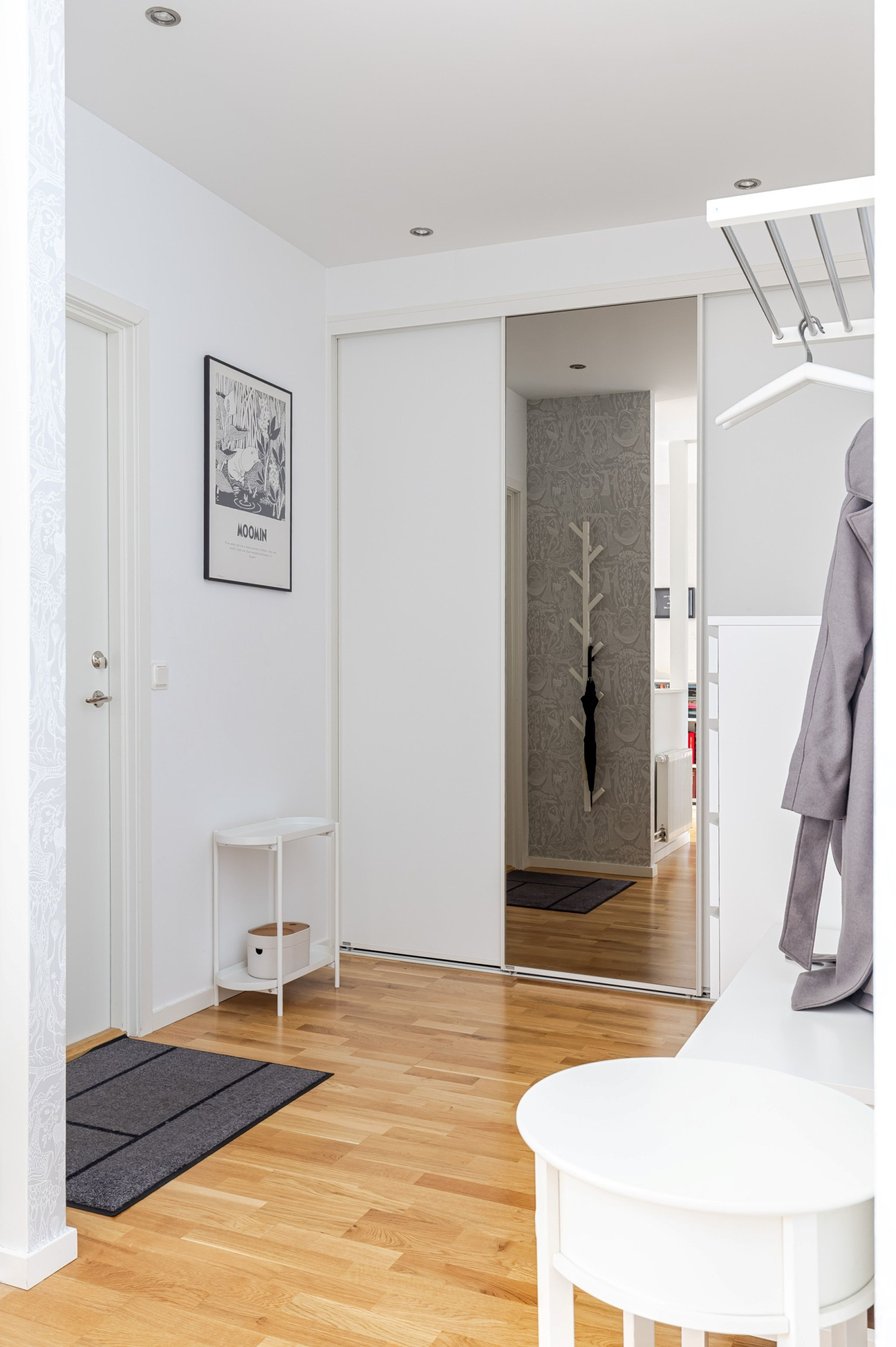 Inne i lägenheten möts du av en generös hall med goda möbleringsmöjligheter. Direkt vid entrén erbjuds utmärkta lösningar för ytterkläder och skor, med rymlig förvaring diskret placerad bakom skjutdörrar. Golvet är i ekparkett som löper vidare genom hela bostaden och skapar ett enhetligt intryck. Infälld belysning i tak ger ett stilrent uttryck.