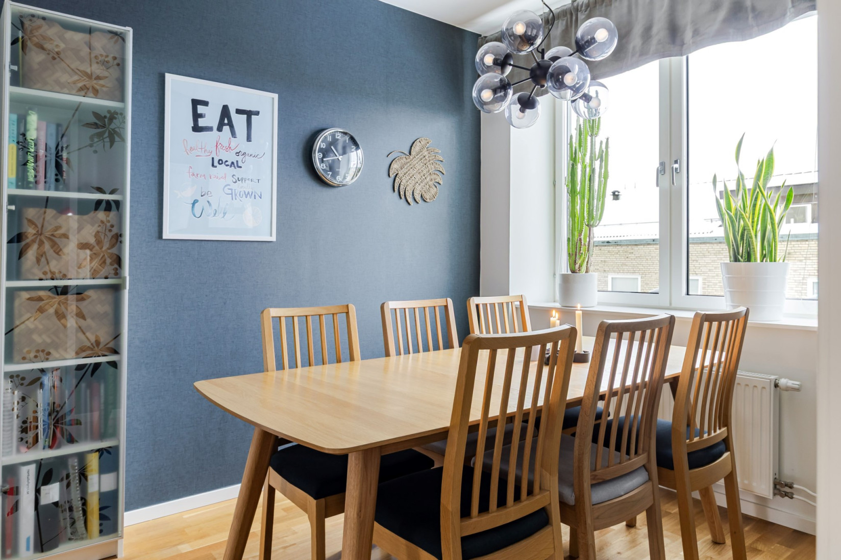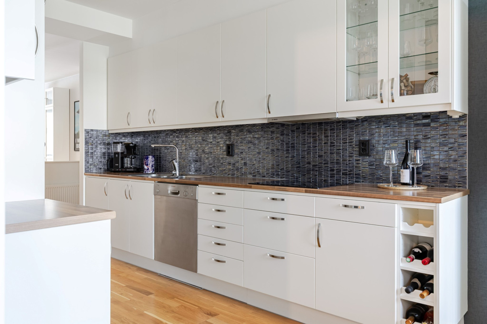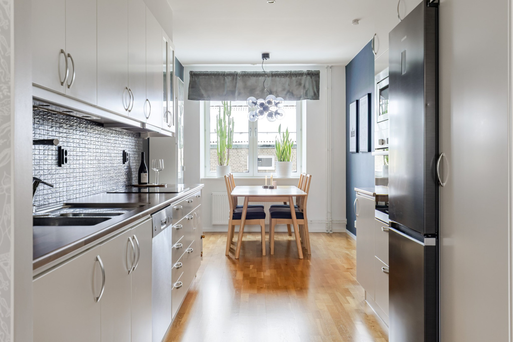 Inne i lägenheten möts du av en generös hall med goda möbleringsmöjligheter. Direkt vid entrén erbjuds utmärkta lösningar för ytterkläder och skor, med rymlig förvaring diskret placerad bakom skjutdörrar. Golvet är i ekparkett som löper vidare genom hela bostaden och skapar ett enhetligt intryck. Infälld belysning i tak ger ett stilrent uttryck.