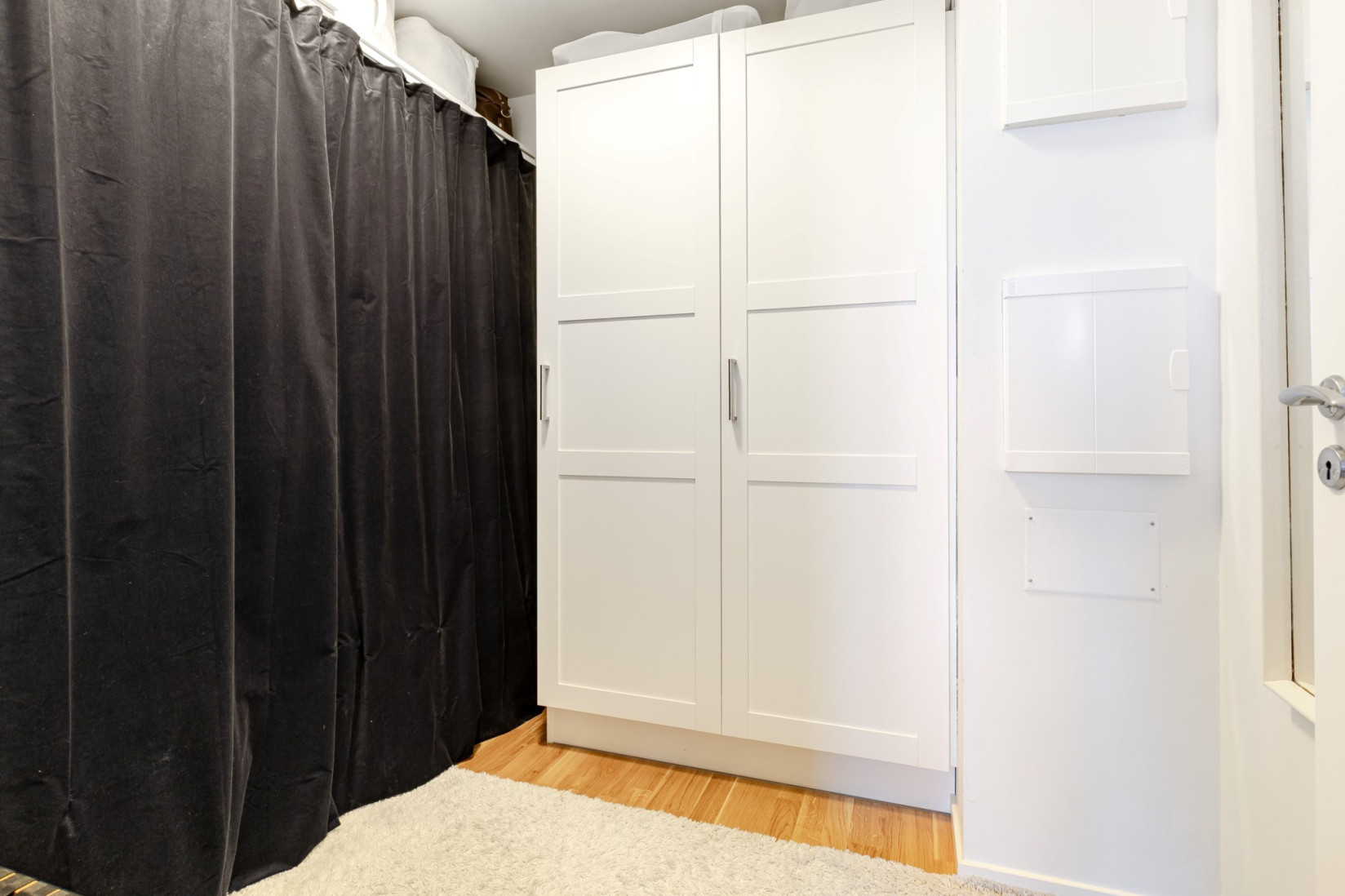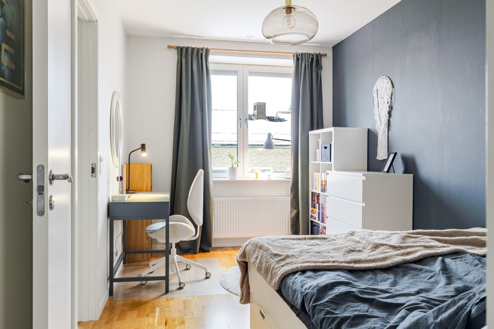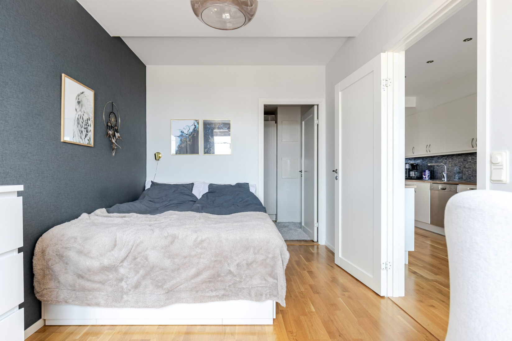 Sovrummet är placerat i bostadens mer avskilda del och nås från köket. Här ryms enkelt både dubbelsäng, nattduksbord och arbetsplats. I direkt anslutning finns en mycket rymlig klädkammare som sväljer såväl vardagsplagg som säsongsgarderober – en förvaring som verkligen gör skillnad i vardagen.