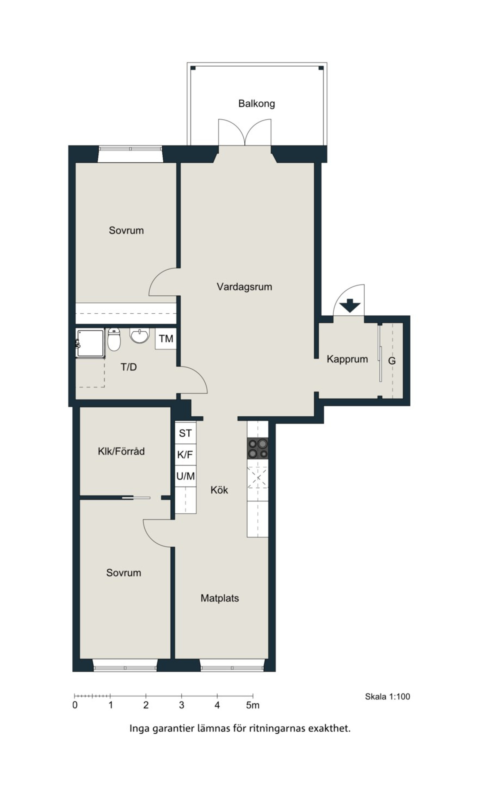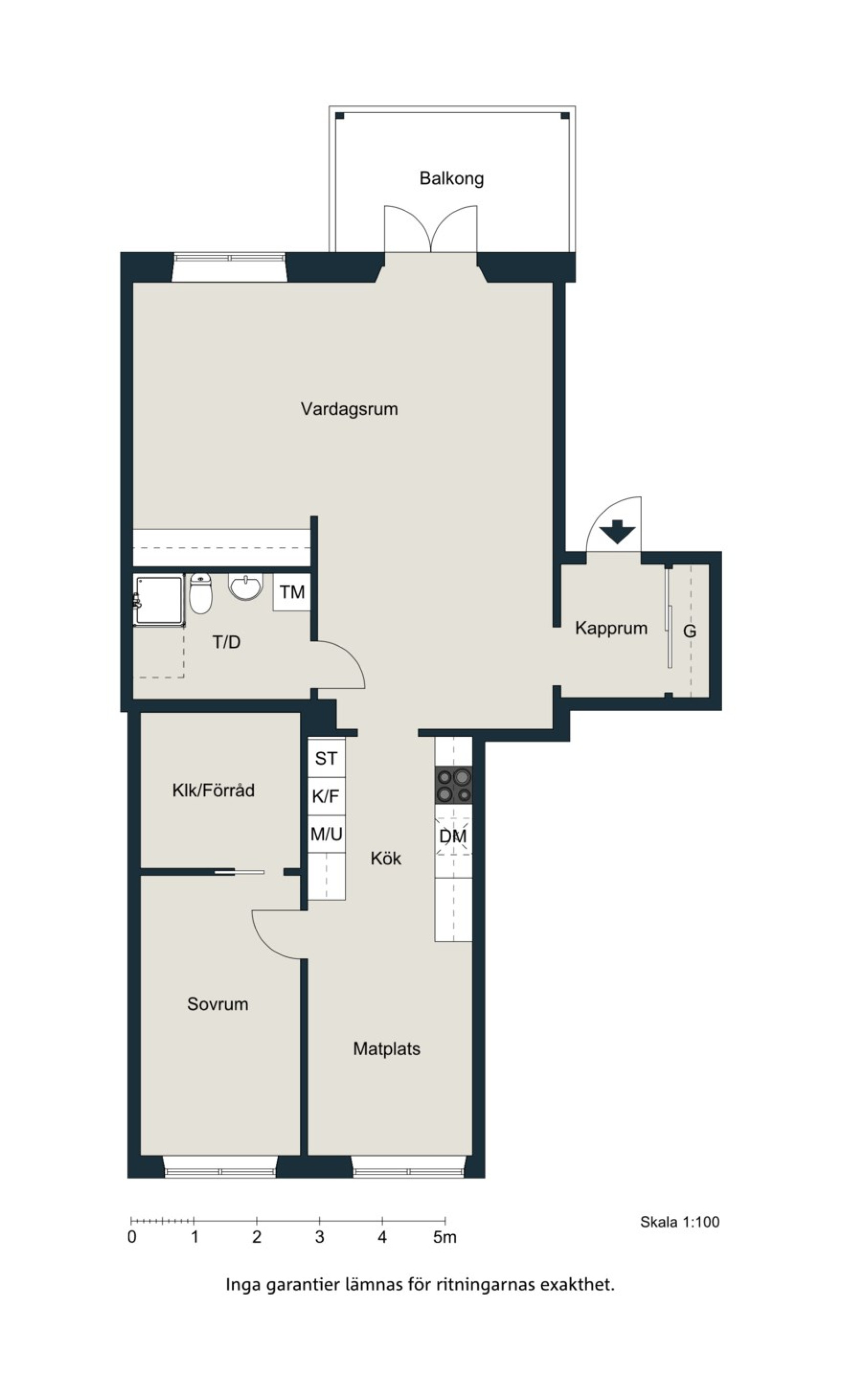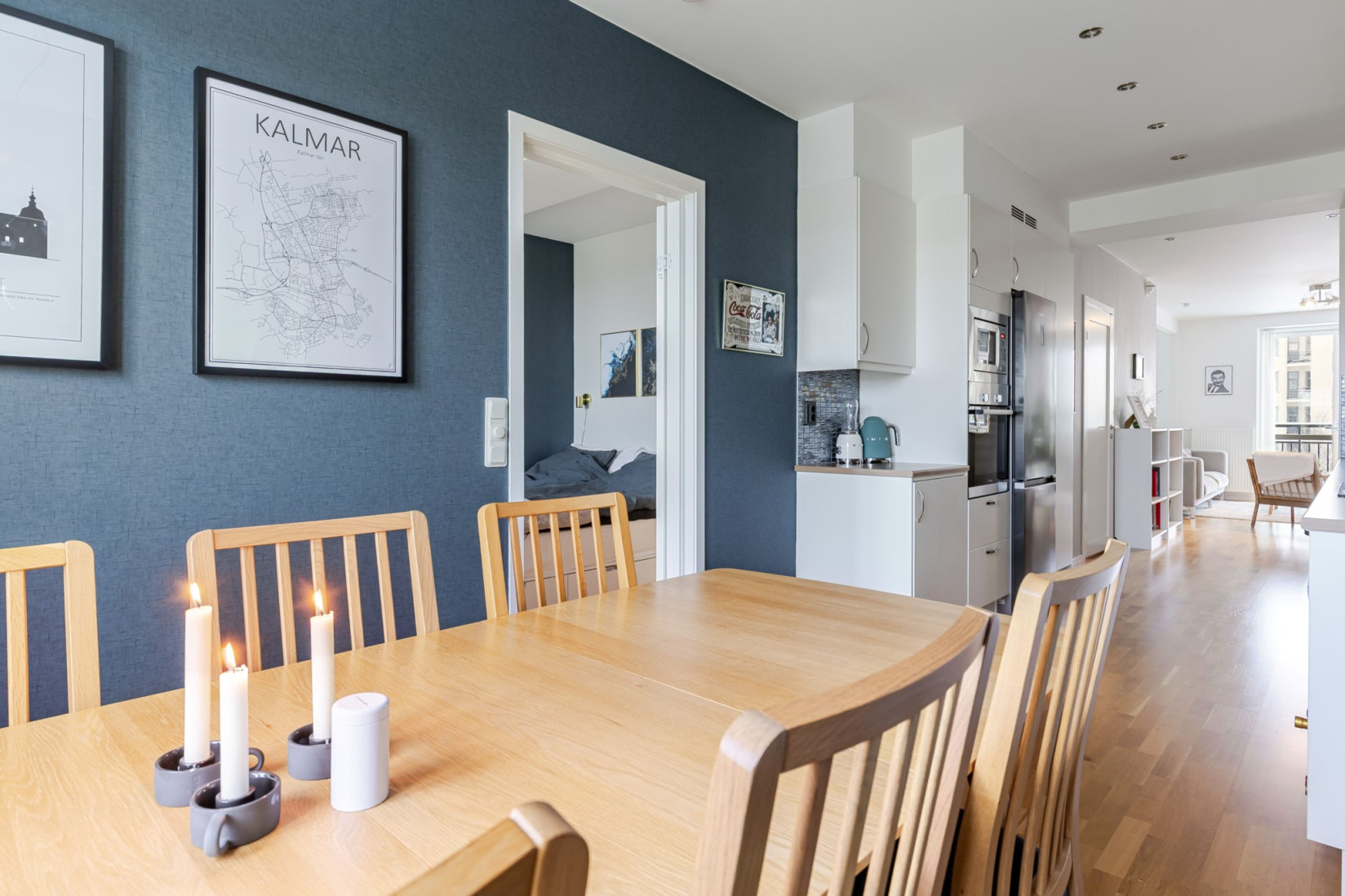 Sovrummet är placerat i bostadens mer avskilda del och nås från köket. Här ryms enkelt både dubbelsäng, nattduksbord och arbetsplats. I direkt anslutning finns en mycket rymlig klädkammare som sväljer såväl vardagsplagg som säsongsgarderober – en förvaring som verkligen gör skillnad i vardagen.