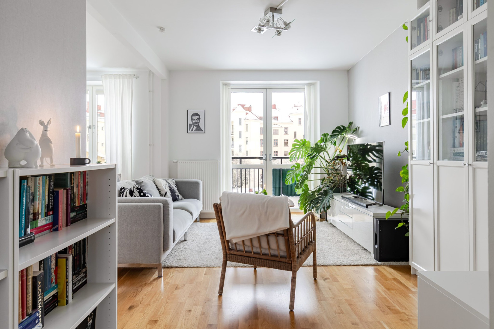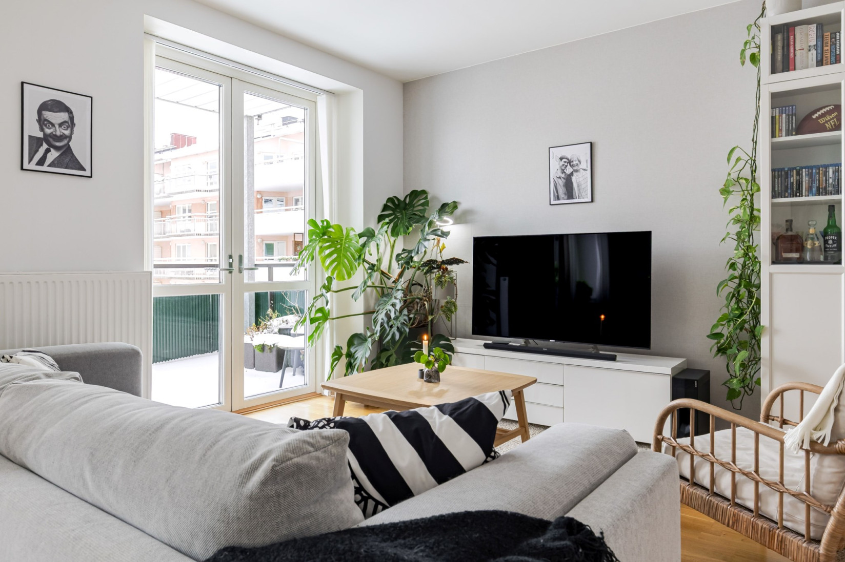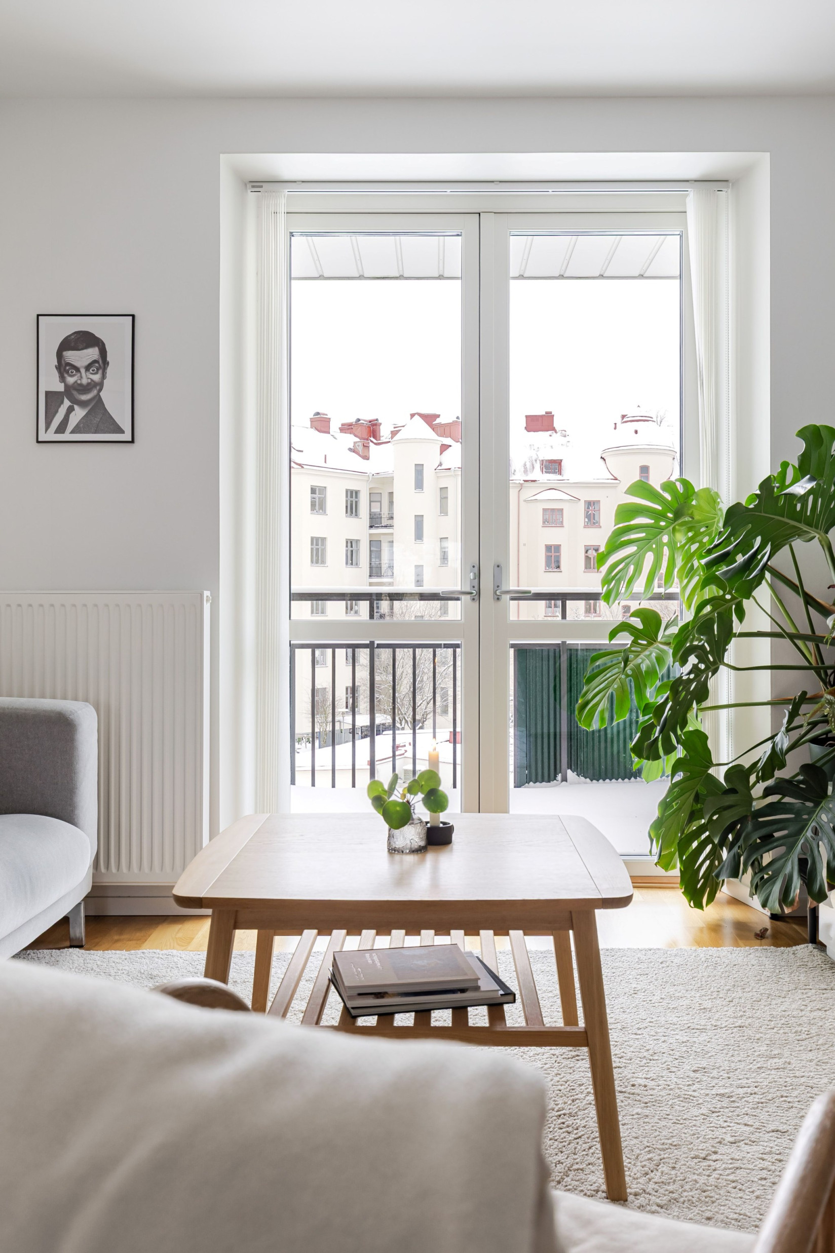 Sällskapsytorna öppnar upp sig till höger från hallen och ger ett luftigt vardagsrum med gott om plats för både soffgrupp och matbord. Den nuvarande planlösningen är generös tack vare att ett tidigare sovrum öppnats upp, men möjligheten att återskapa ytterligare ett rum finns för den som önskar. Längs ena väggen erbjuds praktisk förvaring i skjutgarderober. Härifrån nås balkongen genom dubbla dörrar – en rymlig plats med gott om sol och utrymme för både möbler och växter.