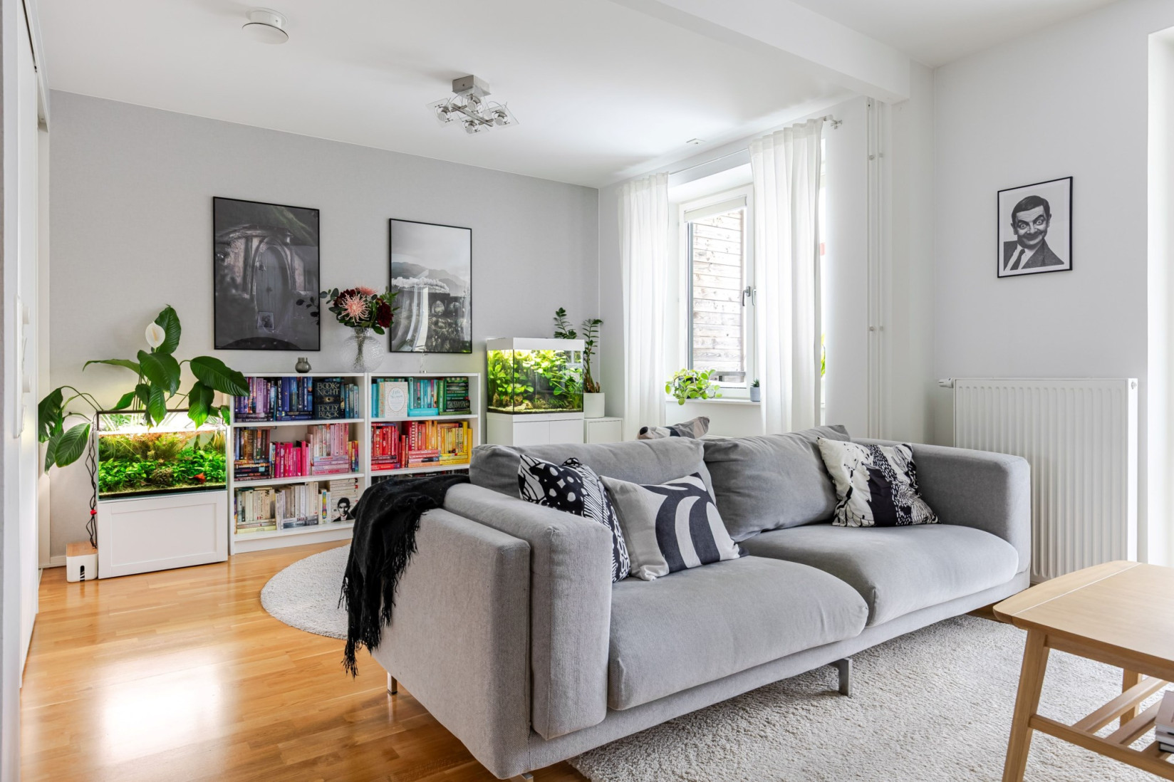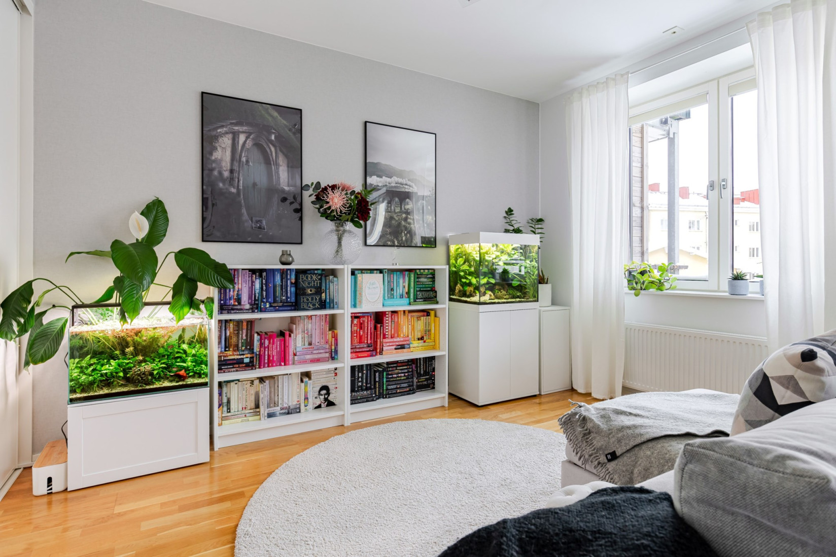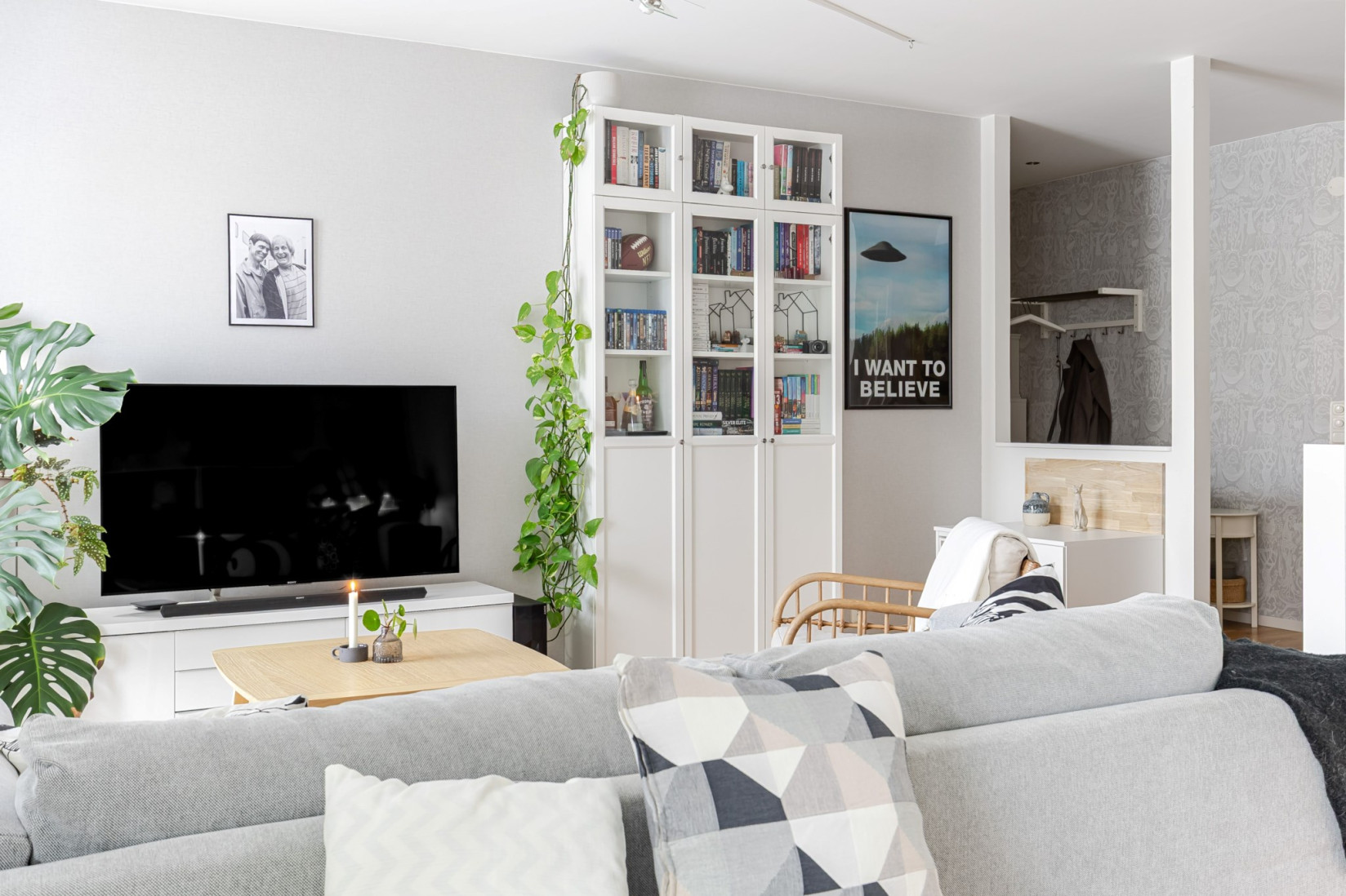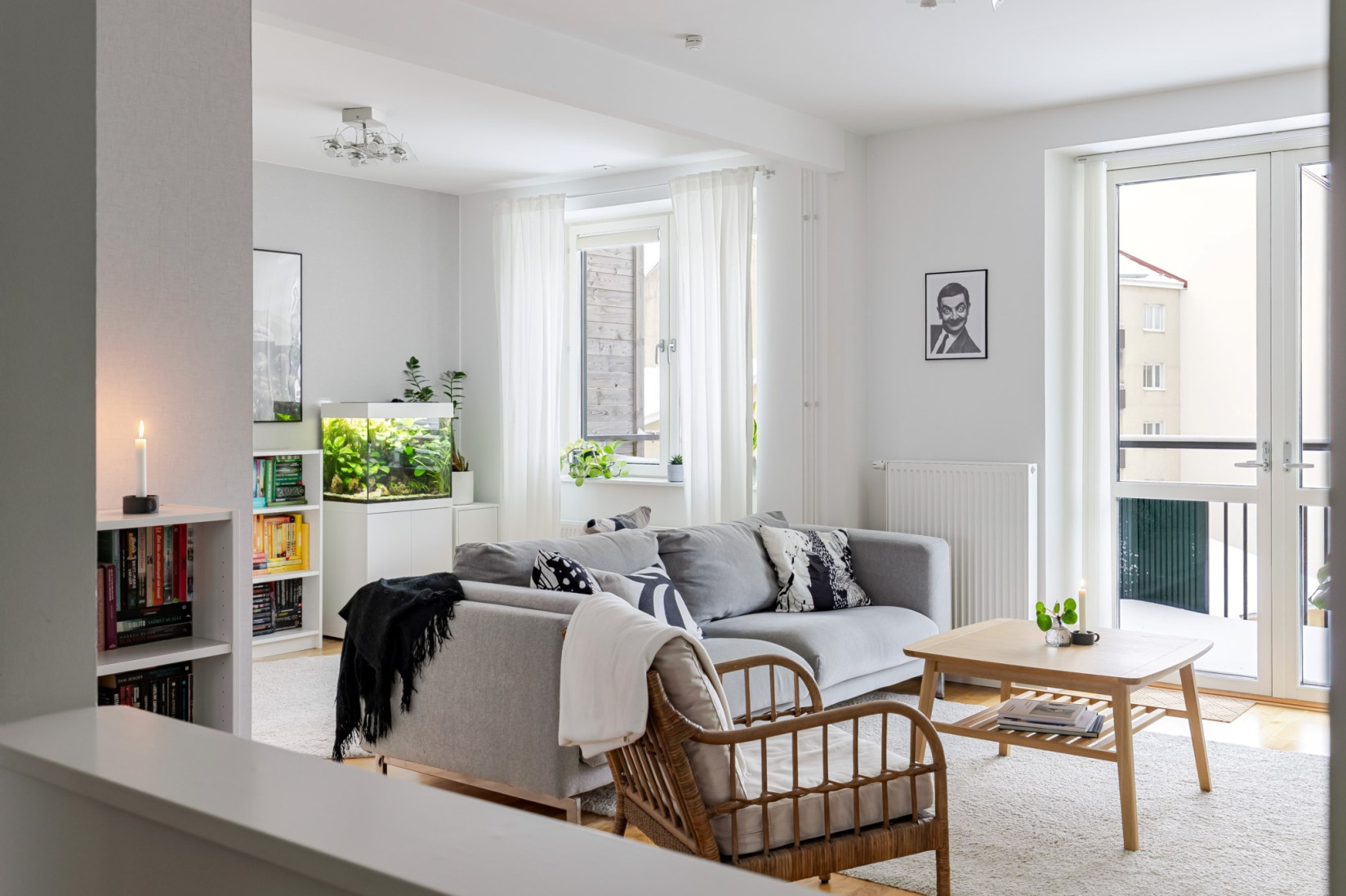 Sällskapsytorna öppnar upp sig till höger från hallen och ger ett luftigt vardagsrum med gott om plats för både soffgrupp och matbord. Den nuvarande planlösningen är generös tack vare att ett tidigare sovrum öppnats upp, men möjligheten att återskapa ytterligare ett rum finns för den som önskar. Längs ena väggen erbjuds praktisk förvaring i skjutgarderober. Härifrån nås balkongen genom dubbla dörrar – en rymlig plats med gott om sol och utrymme för både möbler och växter.