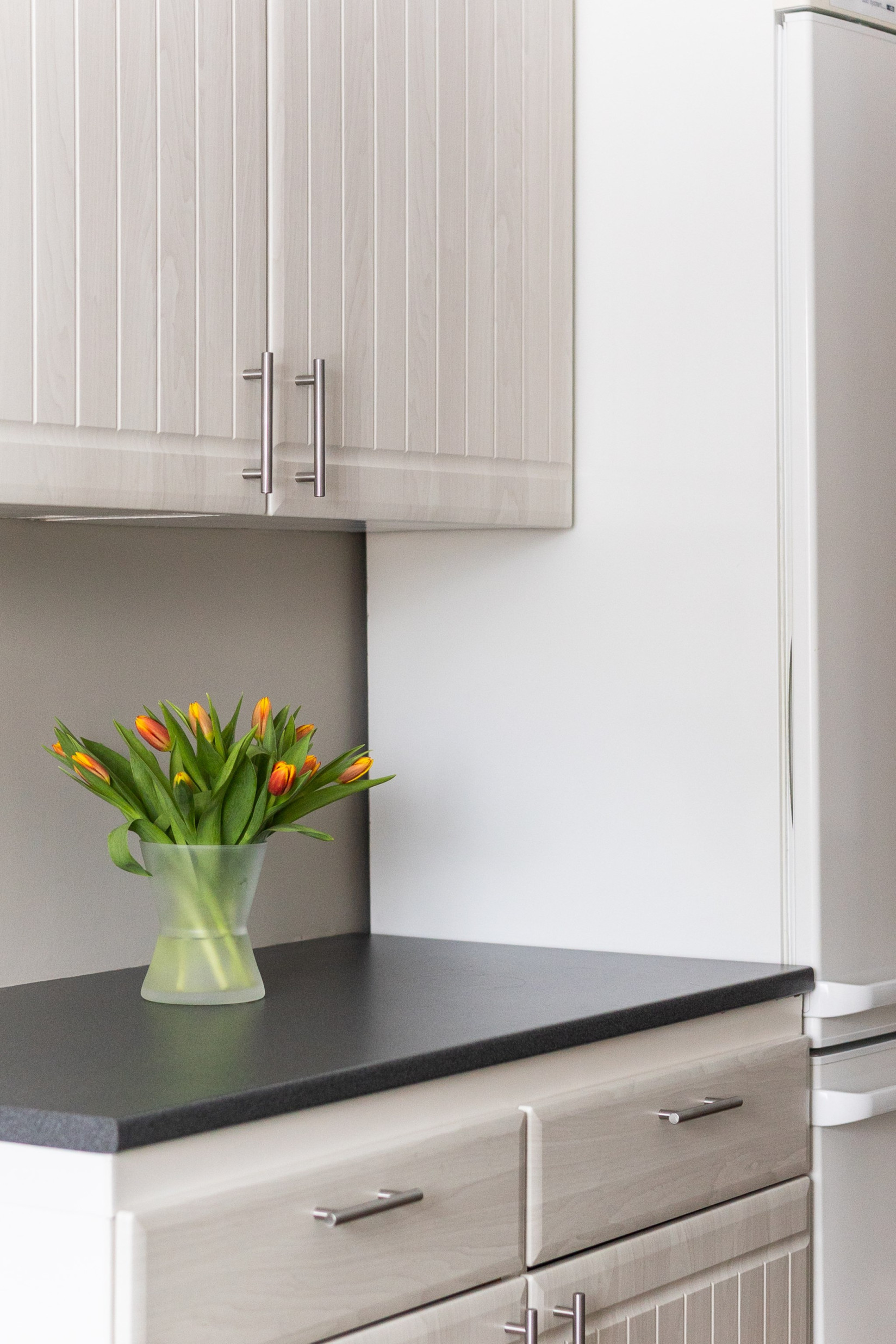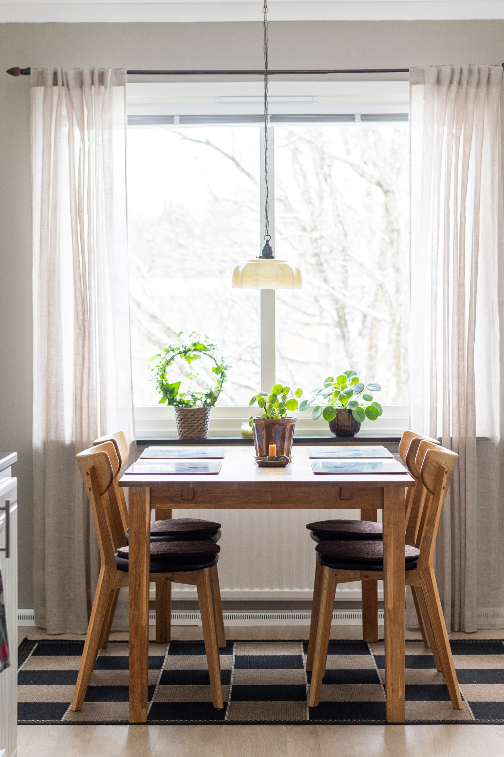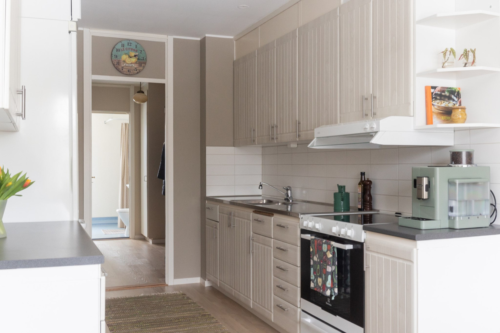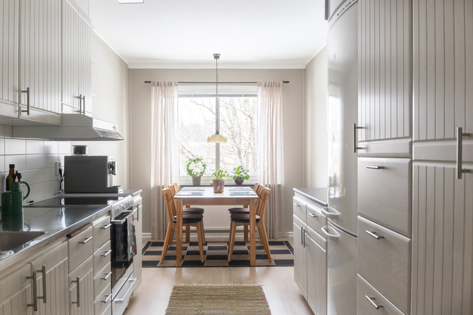 Köket är väl tilltaget med ett stort fönster som ger fint ljus och en naturlig plats för matbordet. Förvaringen är generös med gott om skåp, och arbetsytorna ger god funktion i vardagen. Köket är utrustat med fläkt, spis, ugn samt kyl och frys.