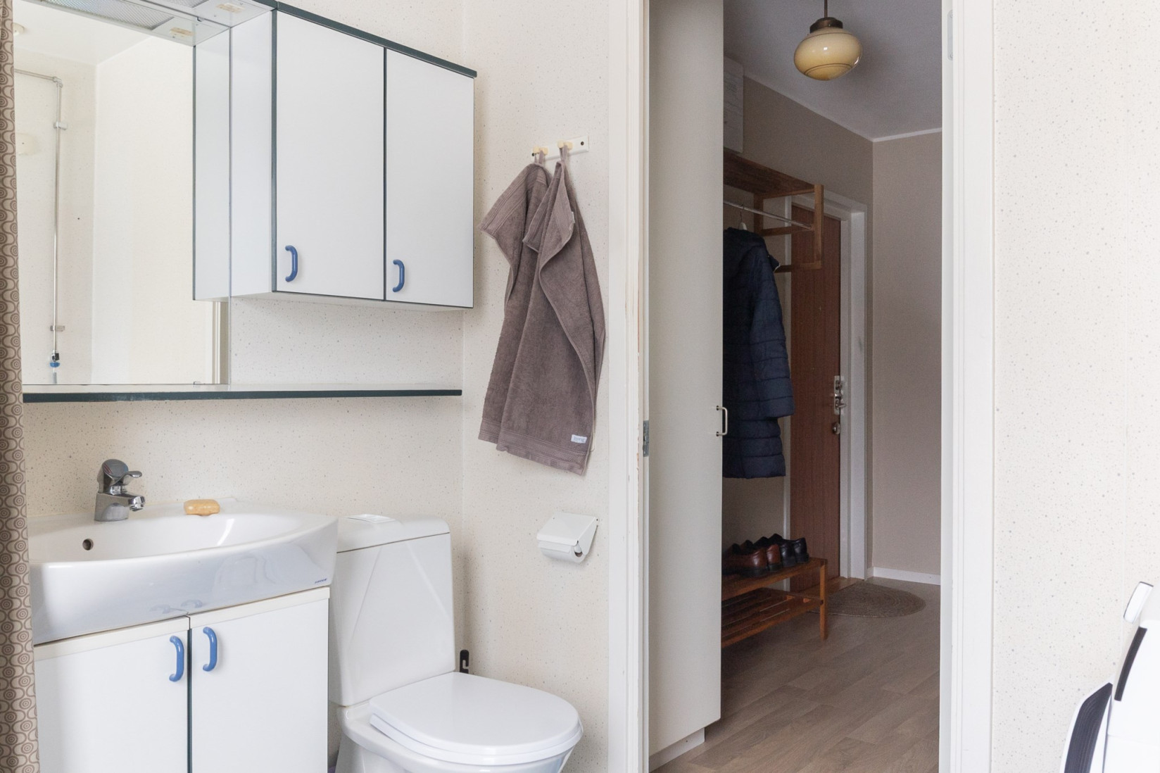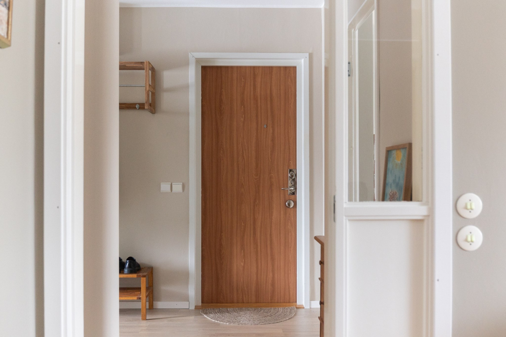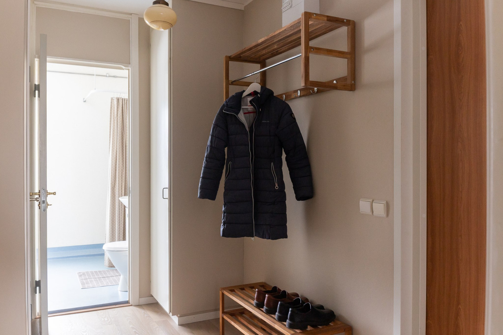 Redan i entrén möts du av en generös hall med fint ljusinsläpp och goda förvaringsmöjligheter för ytterkläder och skor. Här finns även plats för kompletterande förvaring, och den smart placerade klädkammaren – nåbar både från hallen och sovrummet – bidrar med praktiska lösningar för vardagen.
