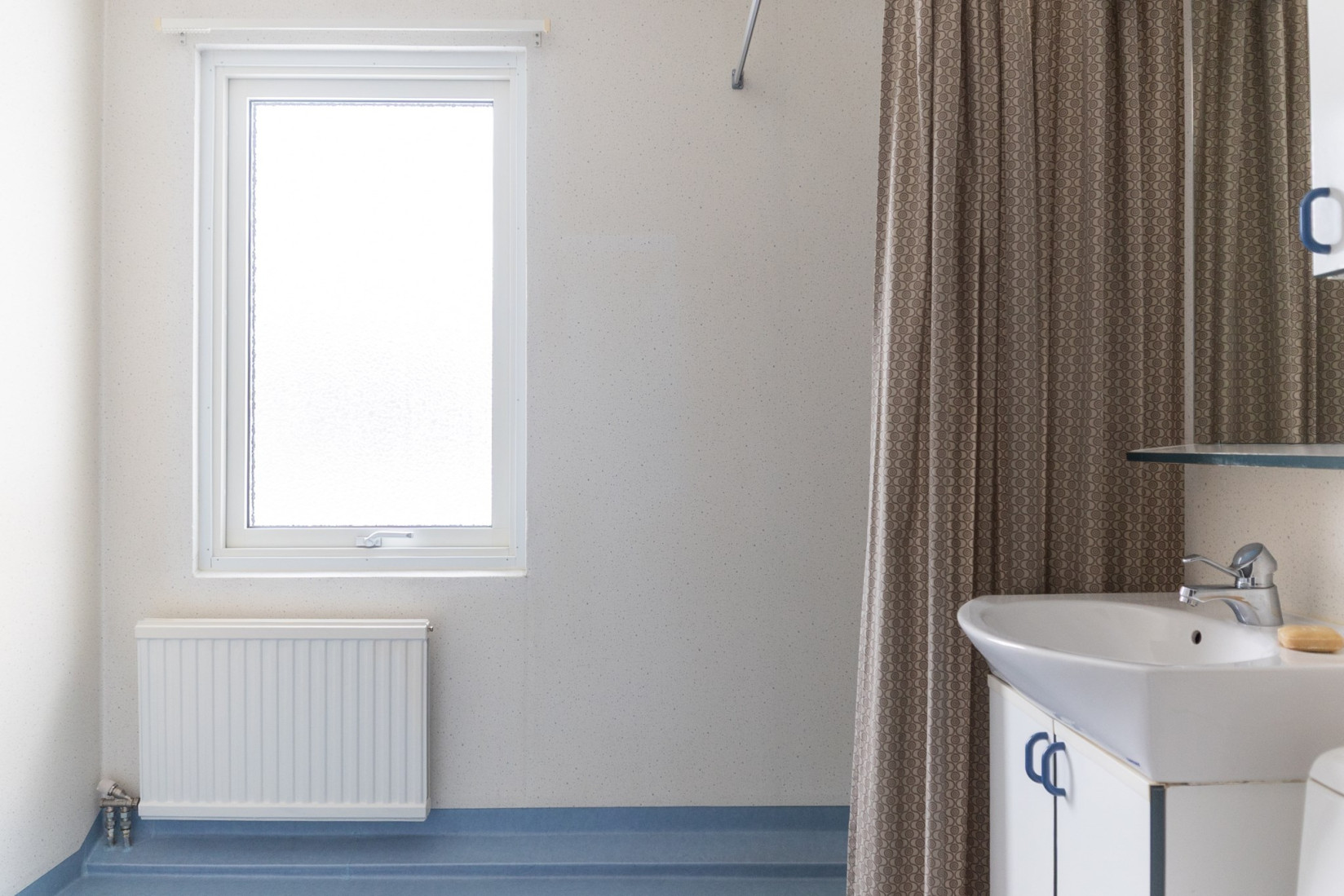 Badrummet ligger till höger från hallen och är rymligt och funktionellt. Här finns dusch, handfat med kommod samt tvättmaskin. Fönstret ger ett behagligt dagsljus och underlättar vädring, vilket bidrar till en ljus och trivsam helhet.
