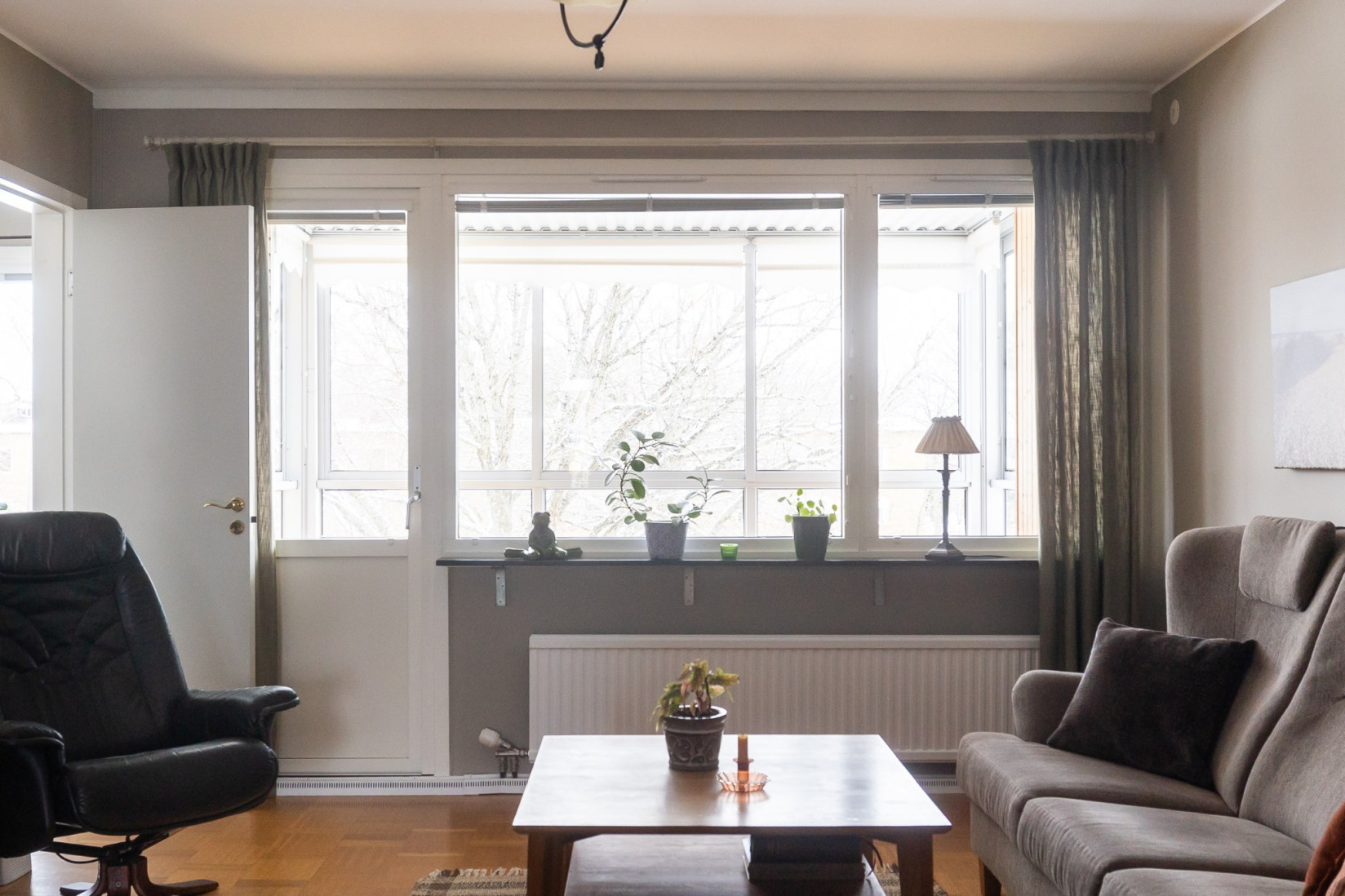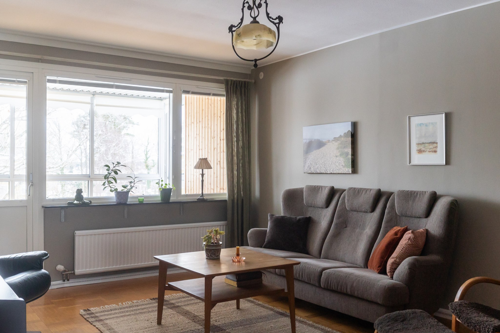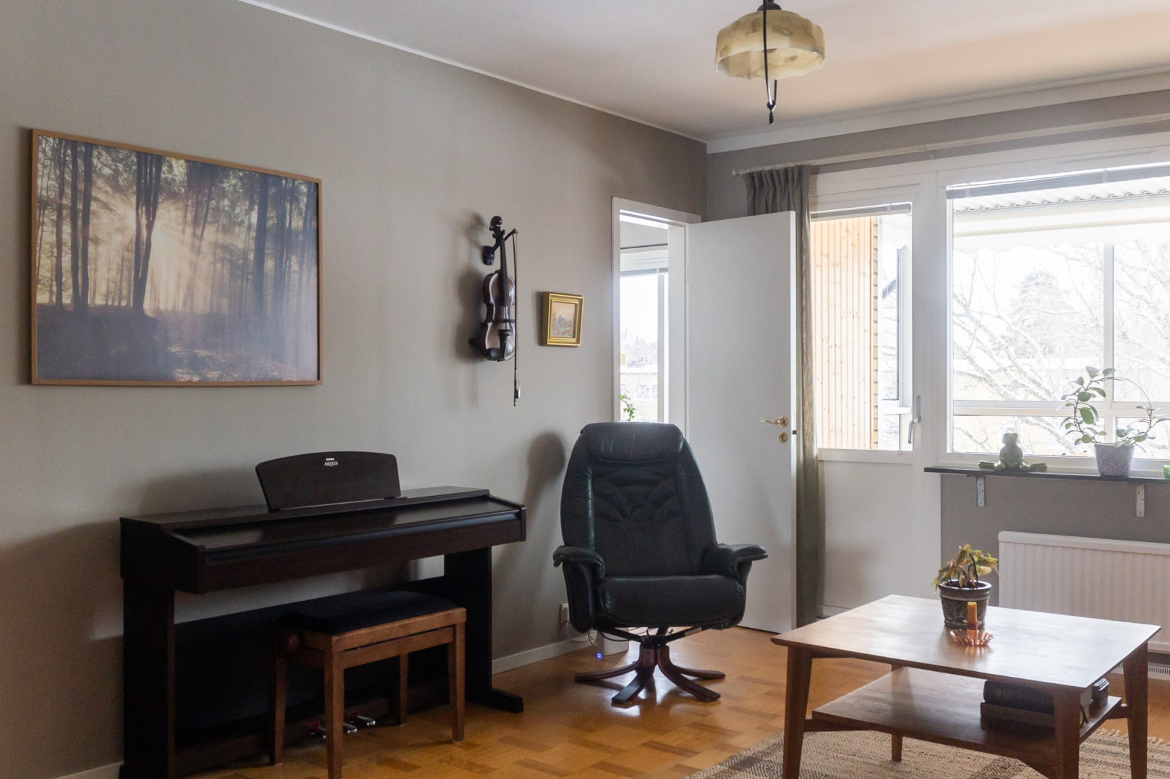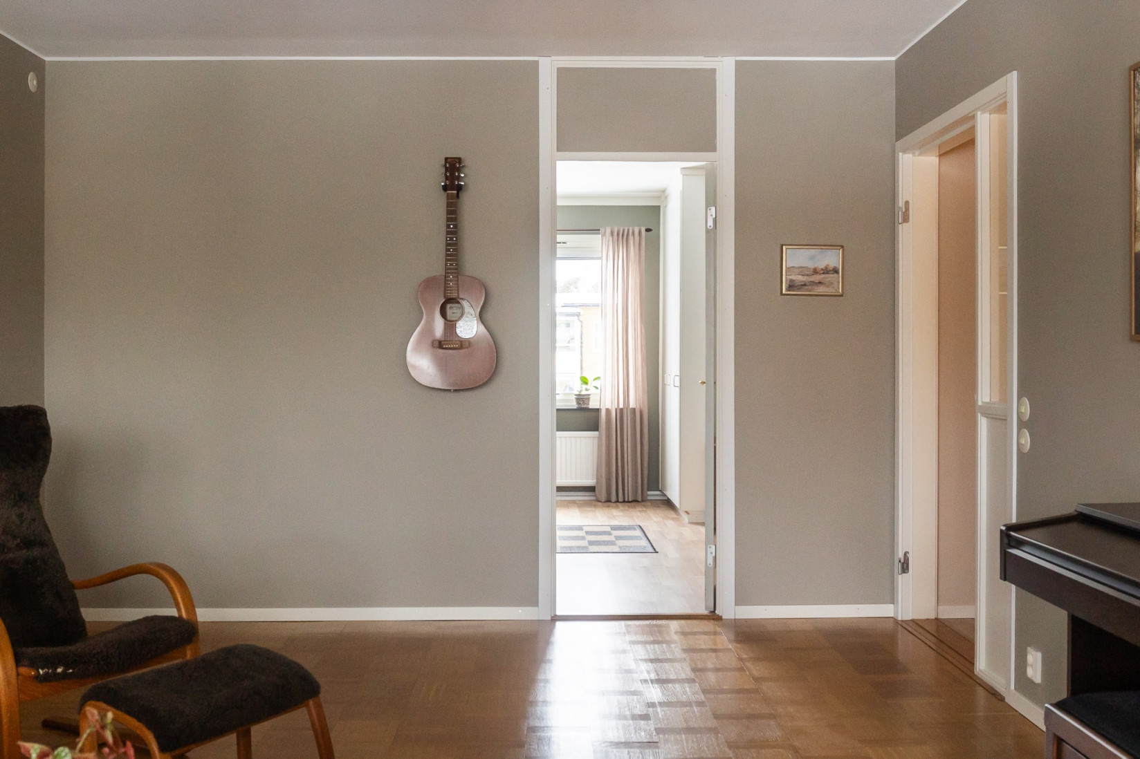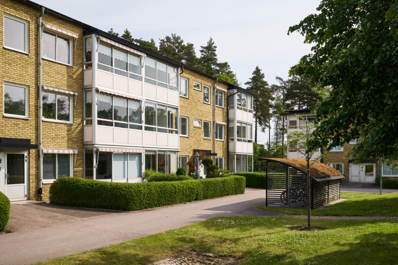 Vardagsrummet har en naturlig koppling till både kök och hall och ger bostaden ett öppet och inbjudande intryck. Ytorna är tilltagna och planlösningen gör det enkelt att möblera efter behov och smak. Härifrån nås balkongen, som blir en självklar plats för eftermiddagar och kvällar i solen med grönskande omgivningar som fond.