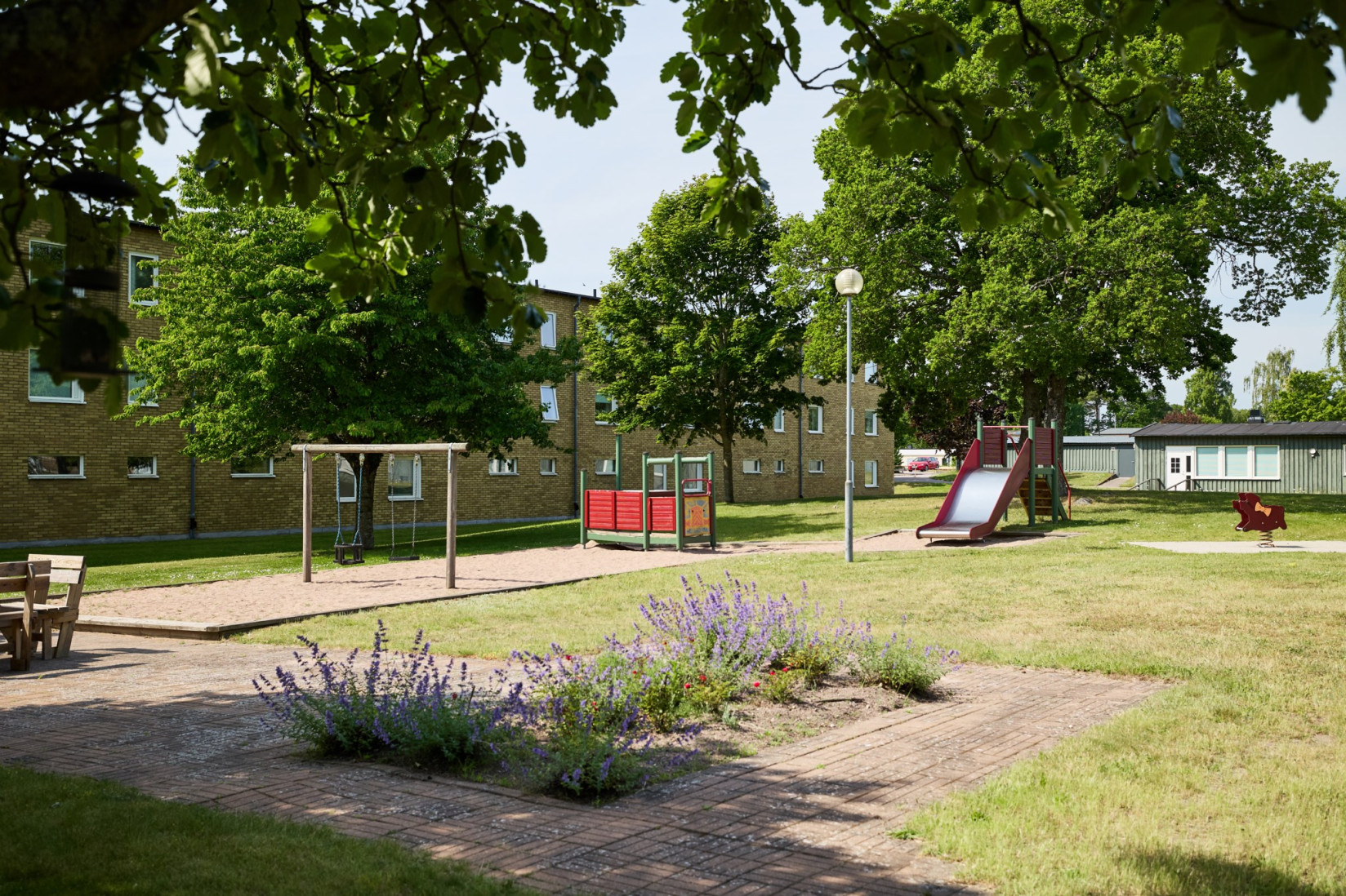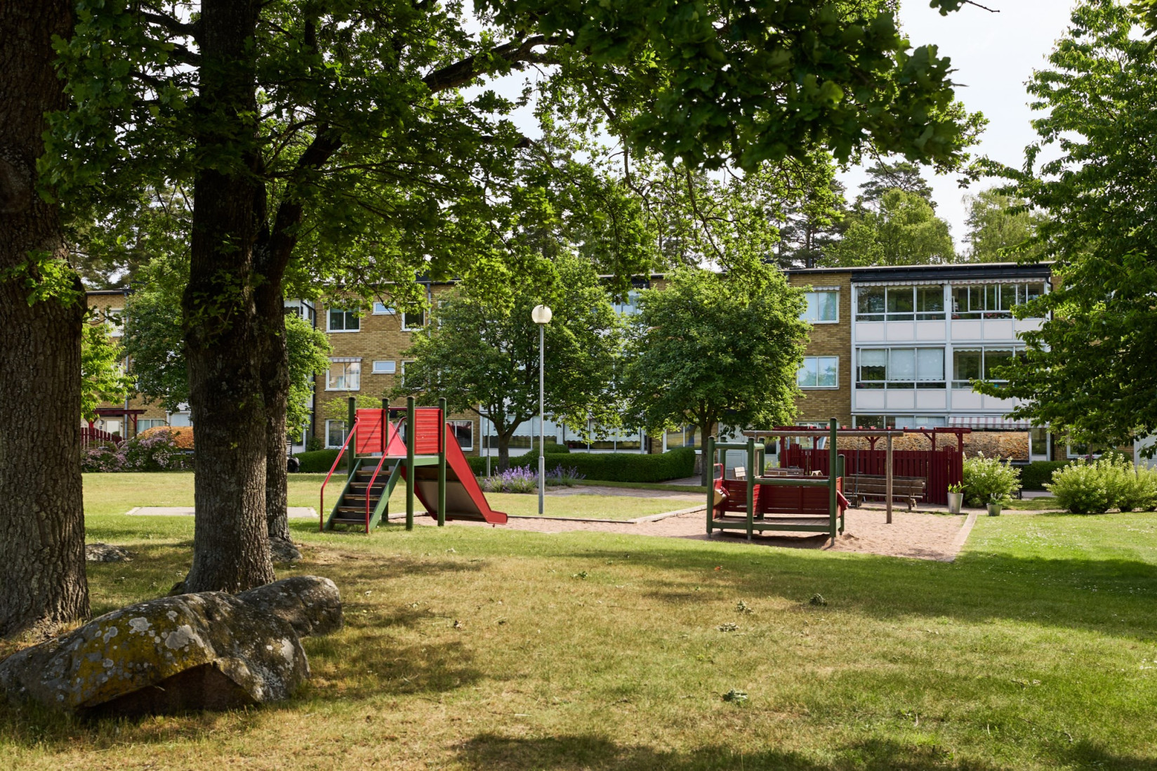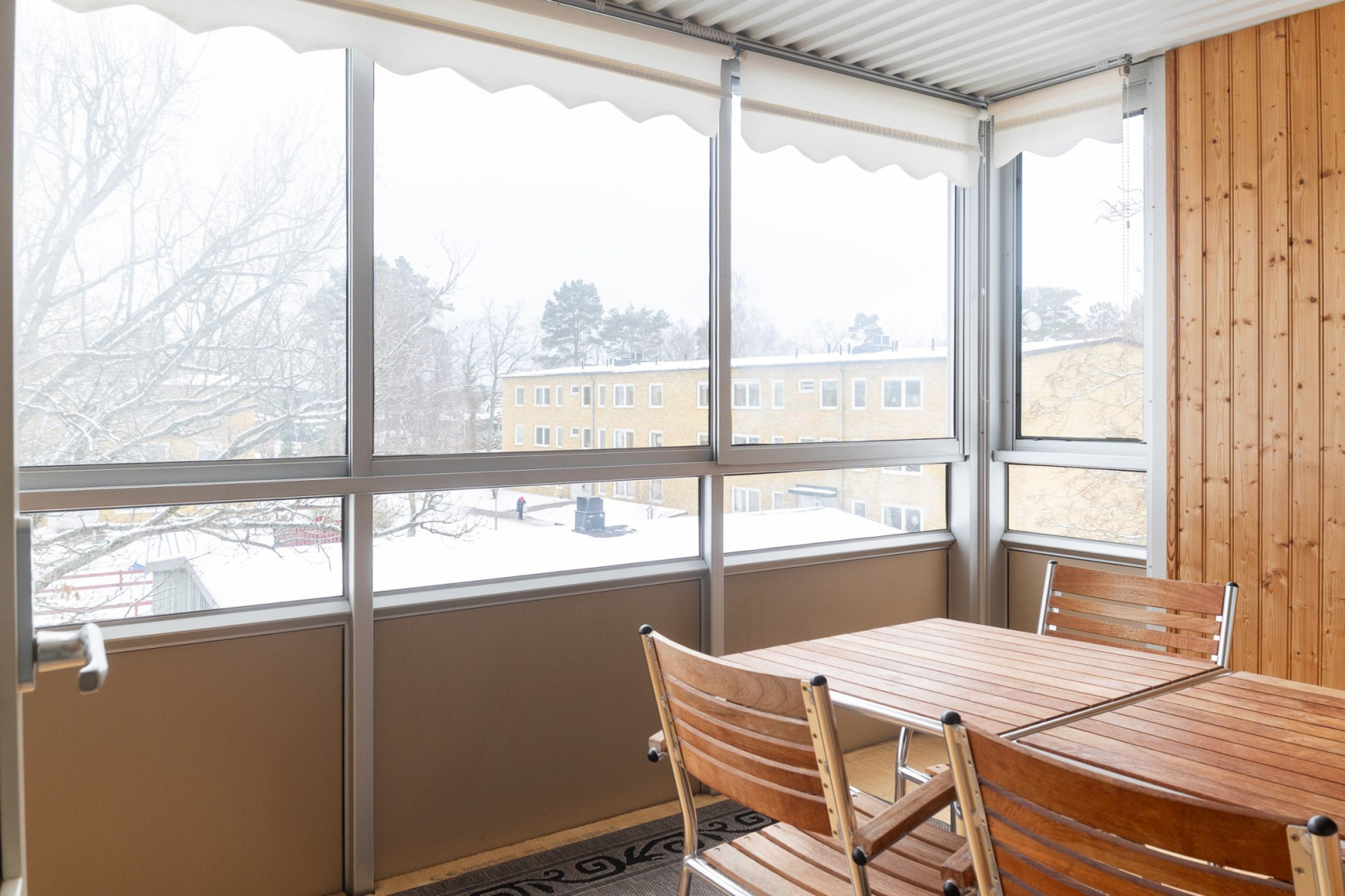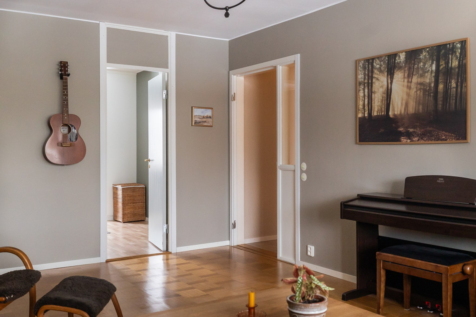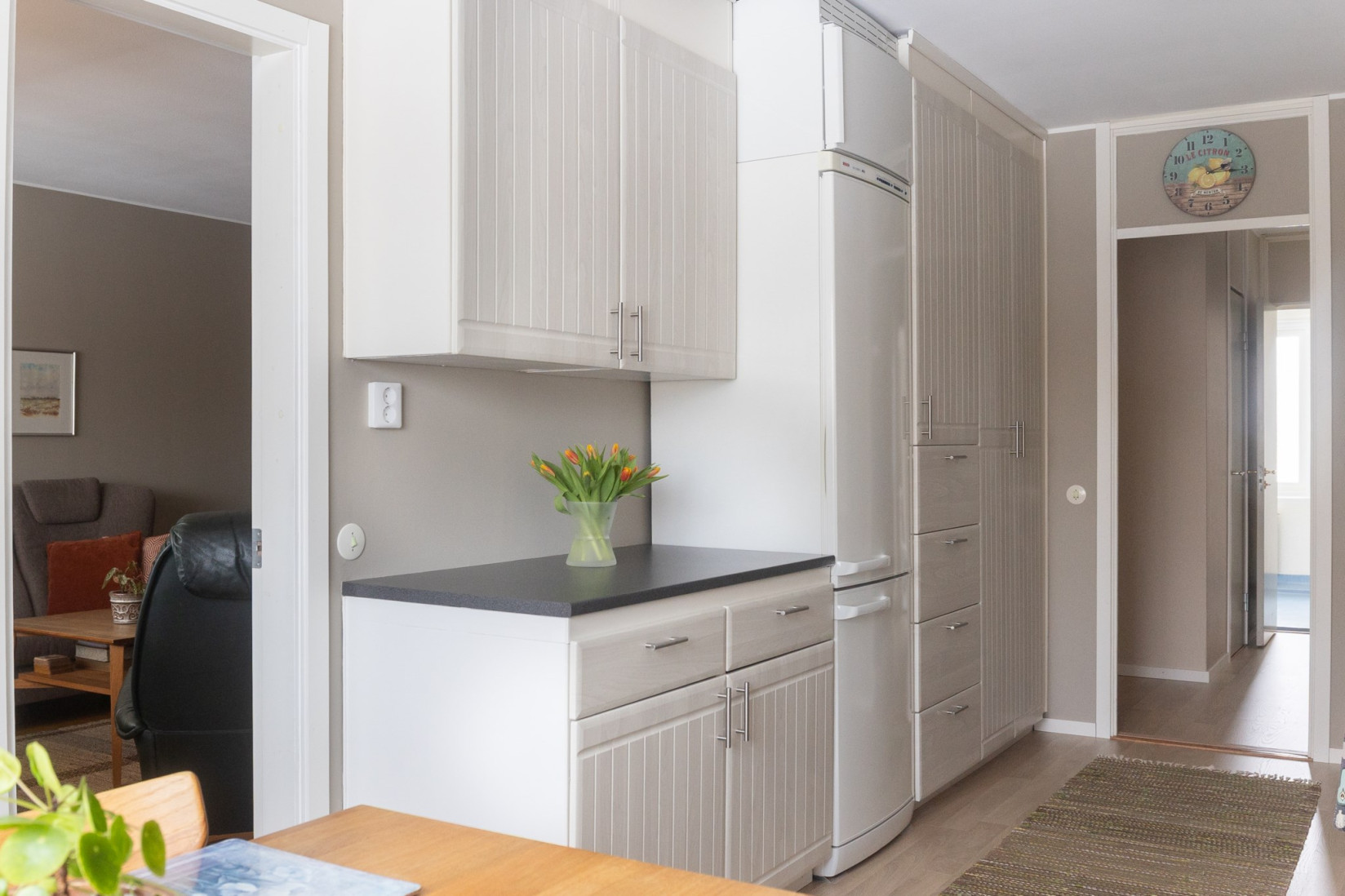 Vardagsrummet har en naturlig koppling till både kök och hall och ger bostaden ett öppet och inbjudande intryck. Ytorna är tilltagna och planlösningen gör det enkelt att möblera efter behov och smak. Härifrån nås balkongen, som blir en självklar plats för eftermiddagar och kvällar i solen med grönskande omgivningar som fond.
