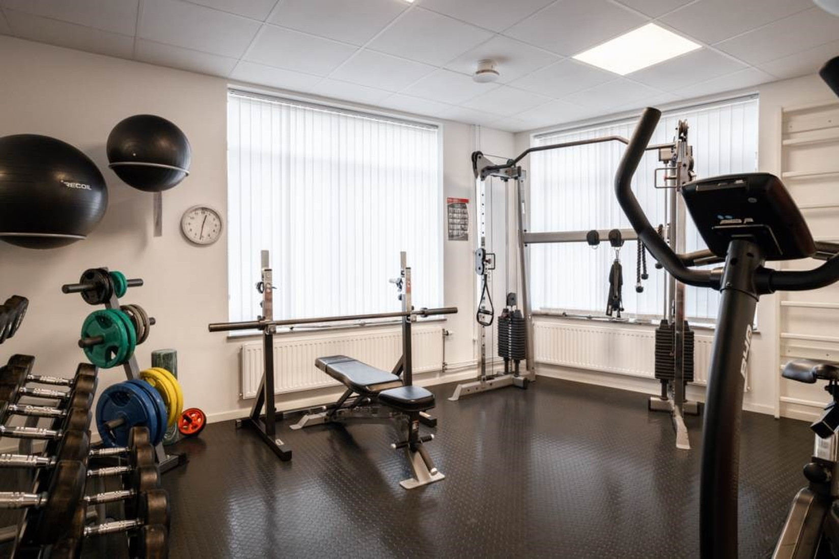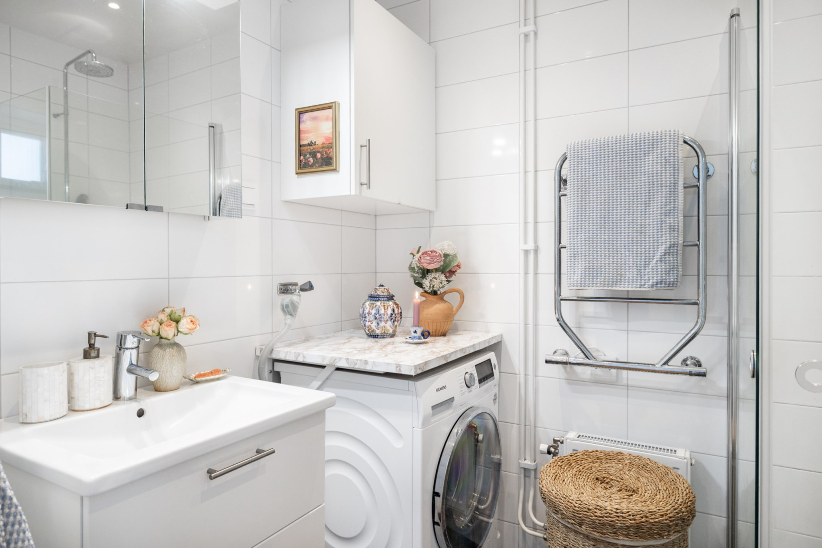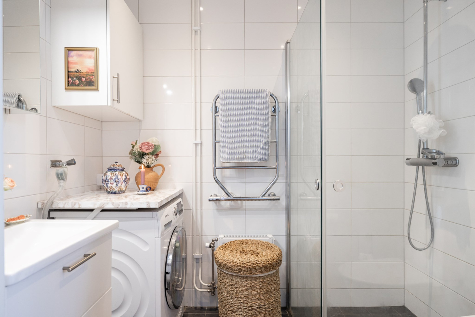 Badrummet är helkaklat och har golvvärme för extra komfort. Ljusinsläpp från fönstret gör det lätt att vädra. Här kan du njuta av nyskick och modern maskinell utrustning såsom toalett, kommod, handukstork, handfat, badrumsskåp och infällbara duschväggar. Det bästa av allt är att det finns en egen kombinerad tvättmaskin och torktumlare under arbetsbänken.