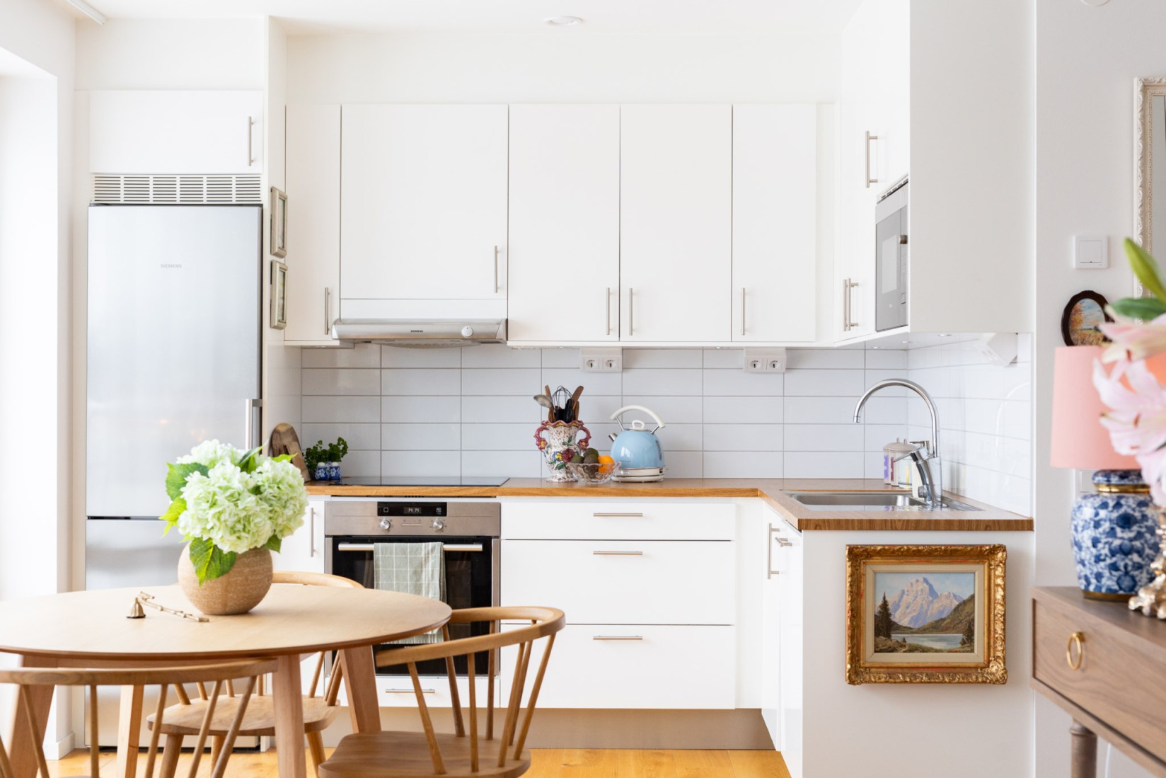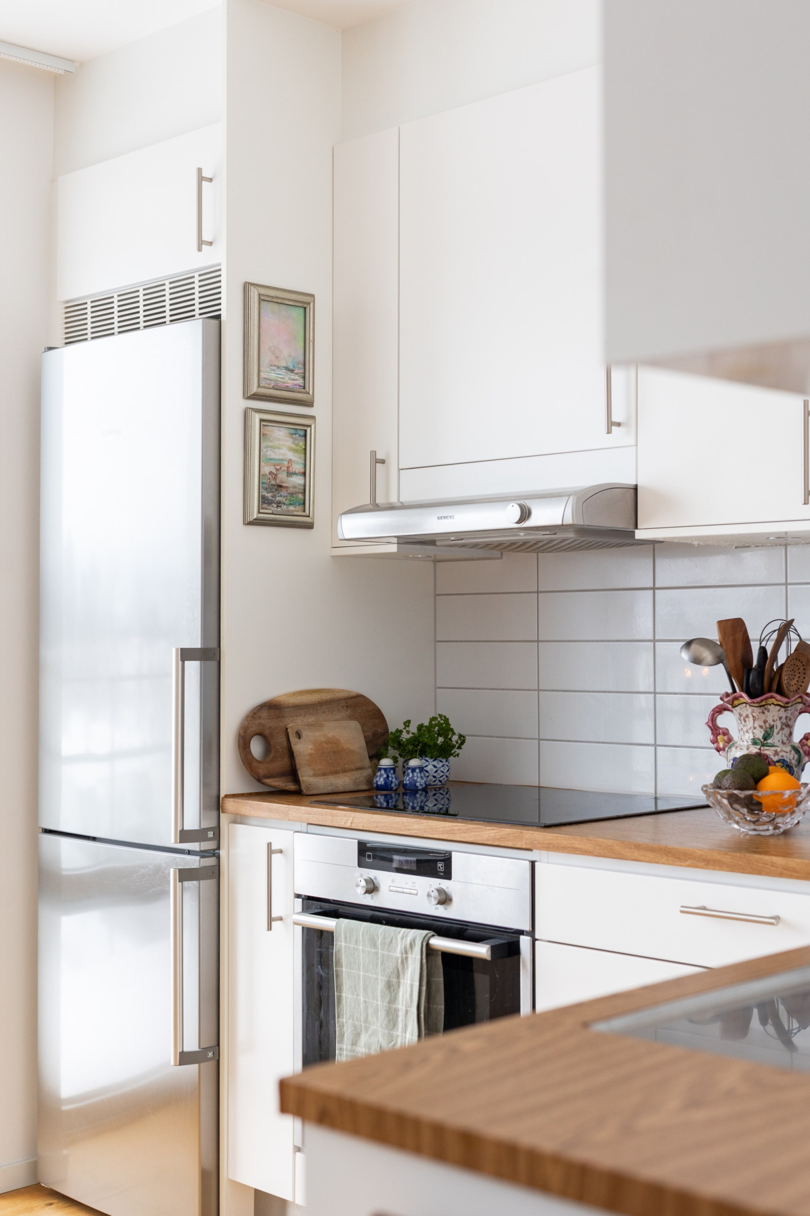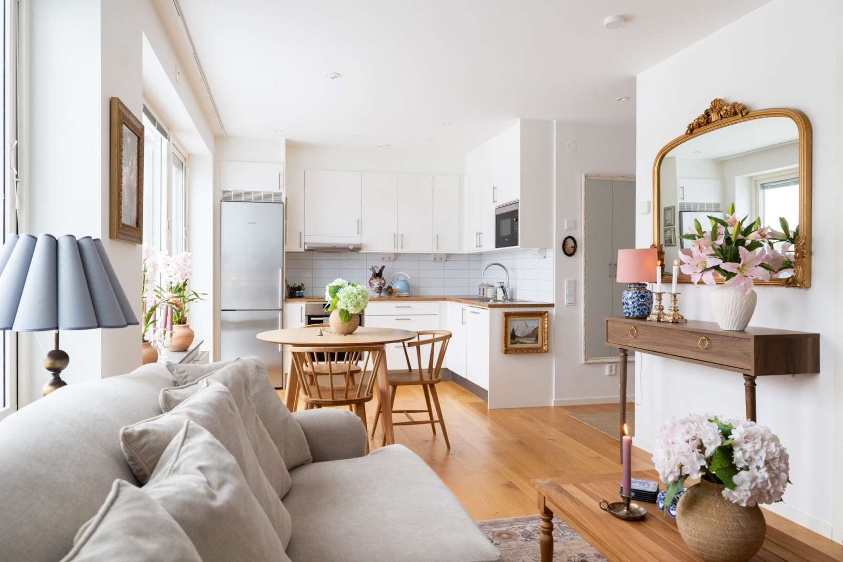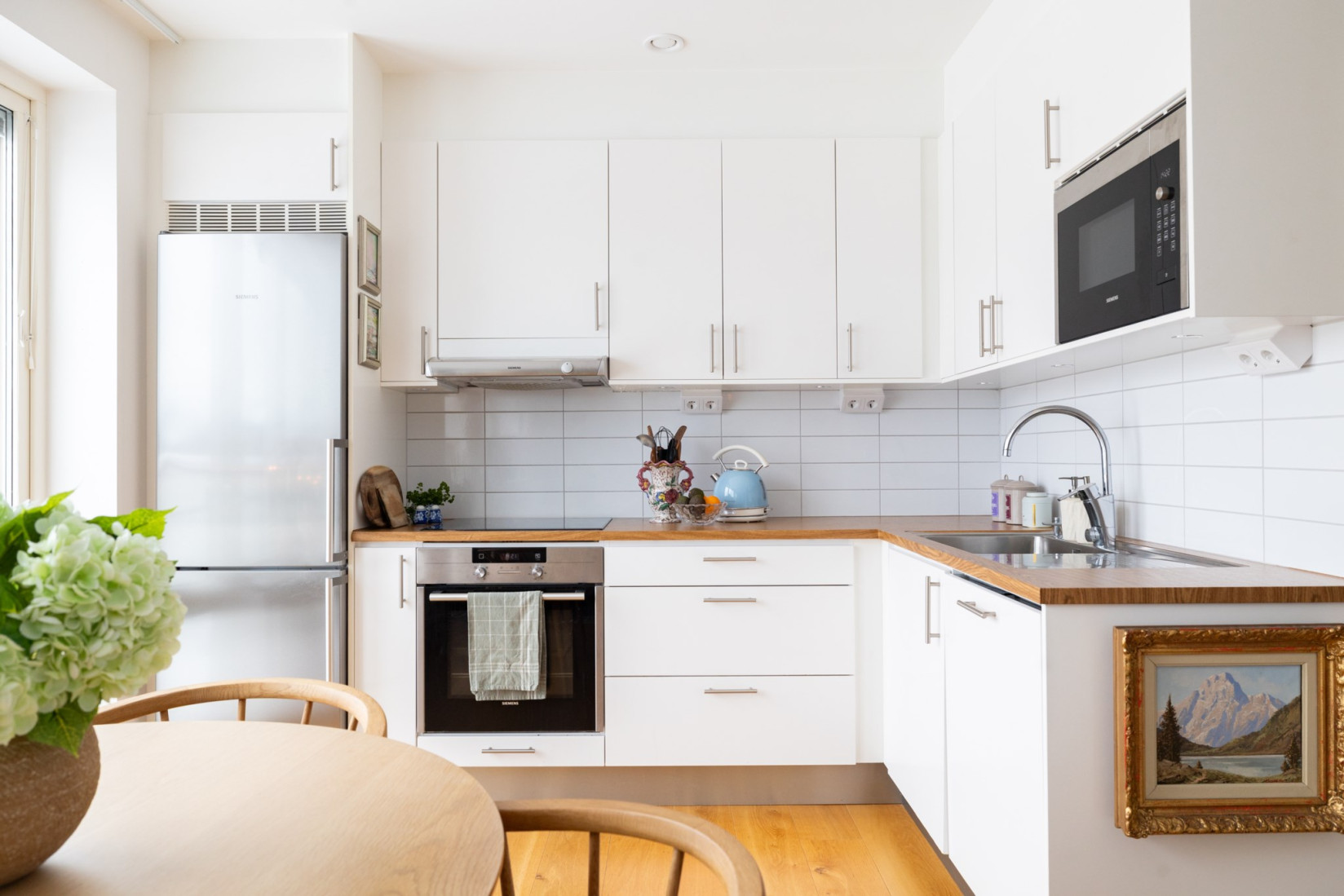 Hallen leder öppet in i köket, som har en modern och luftig planlösning som smidigt integreras med vardagsrummet. Köket är stilfullt inrett och fullt utrustat med generös förvaring samt alla bekvämligheter du behöver, inklusive kyl/frys, ugn, fläkt, mikrovågsugn och diskmaskin.