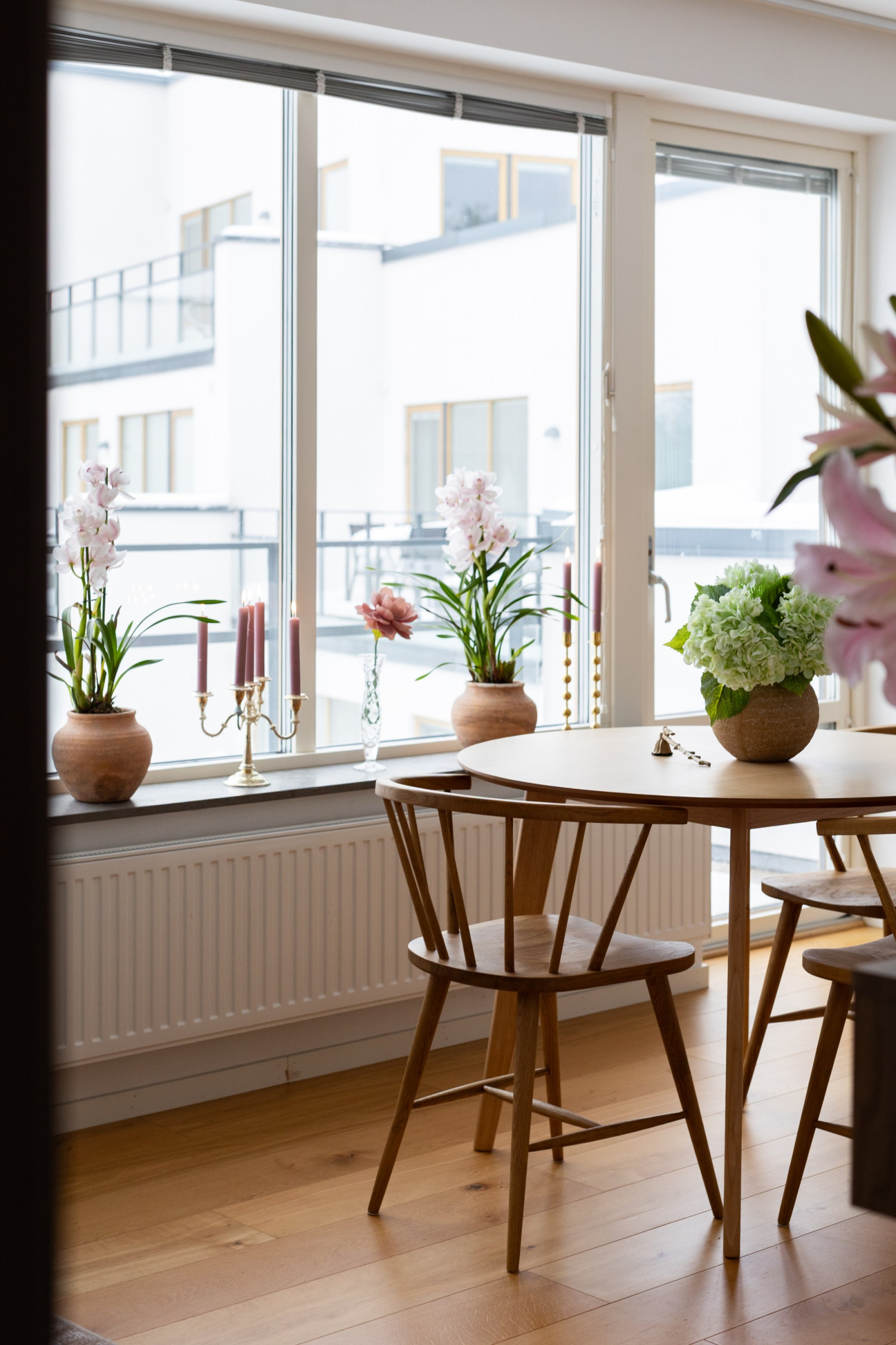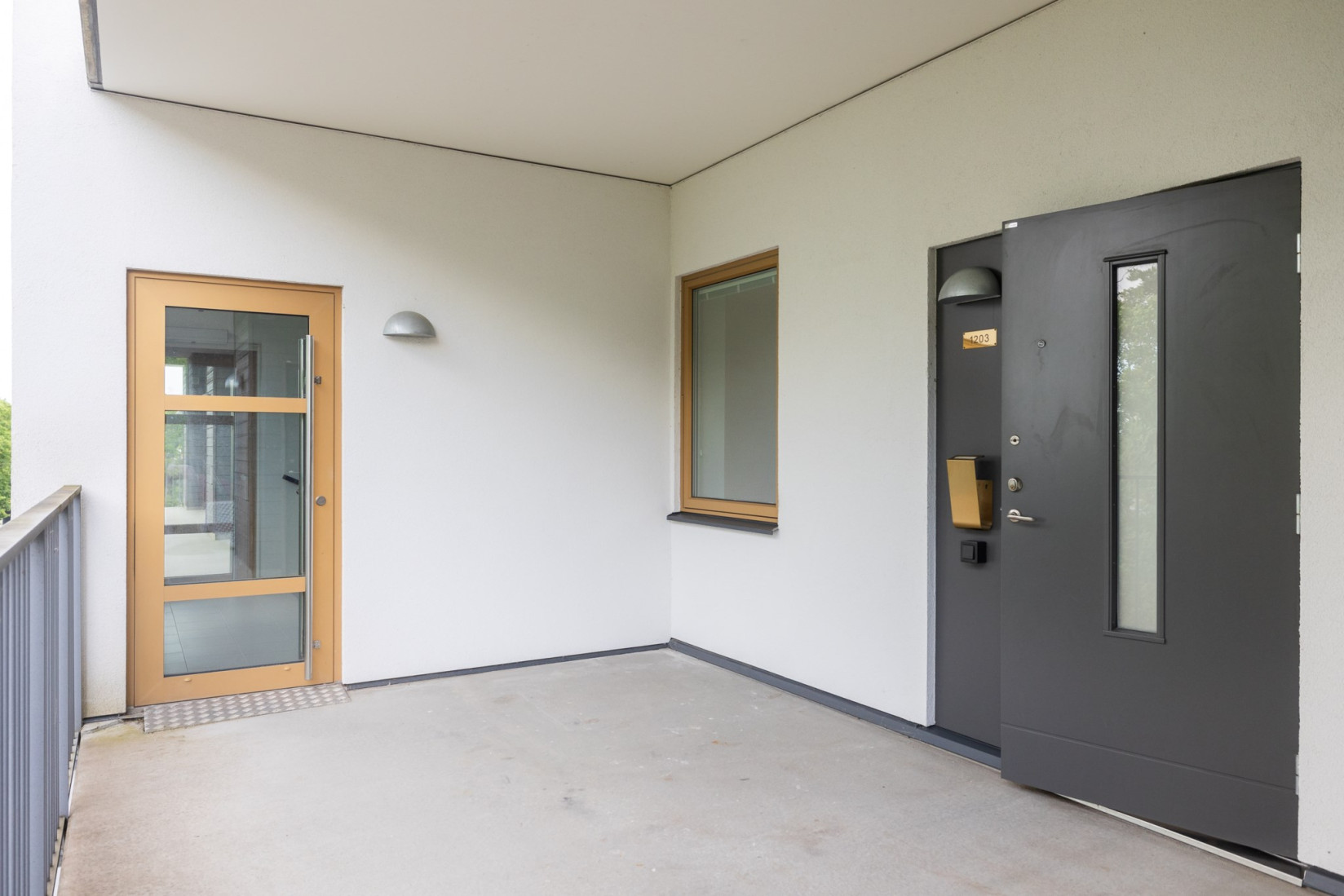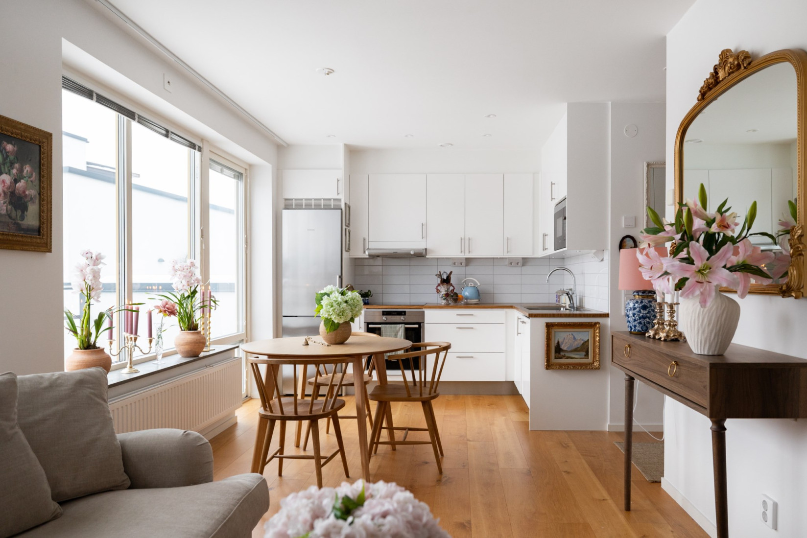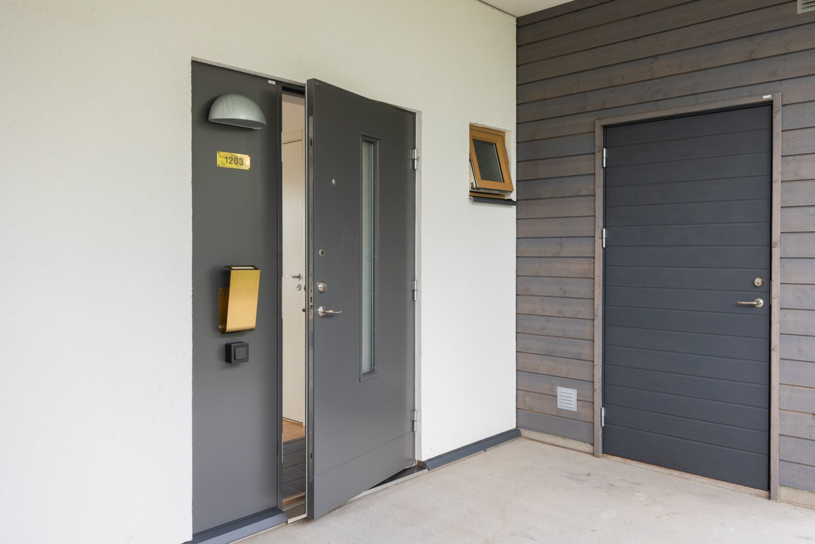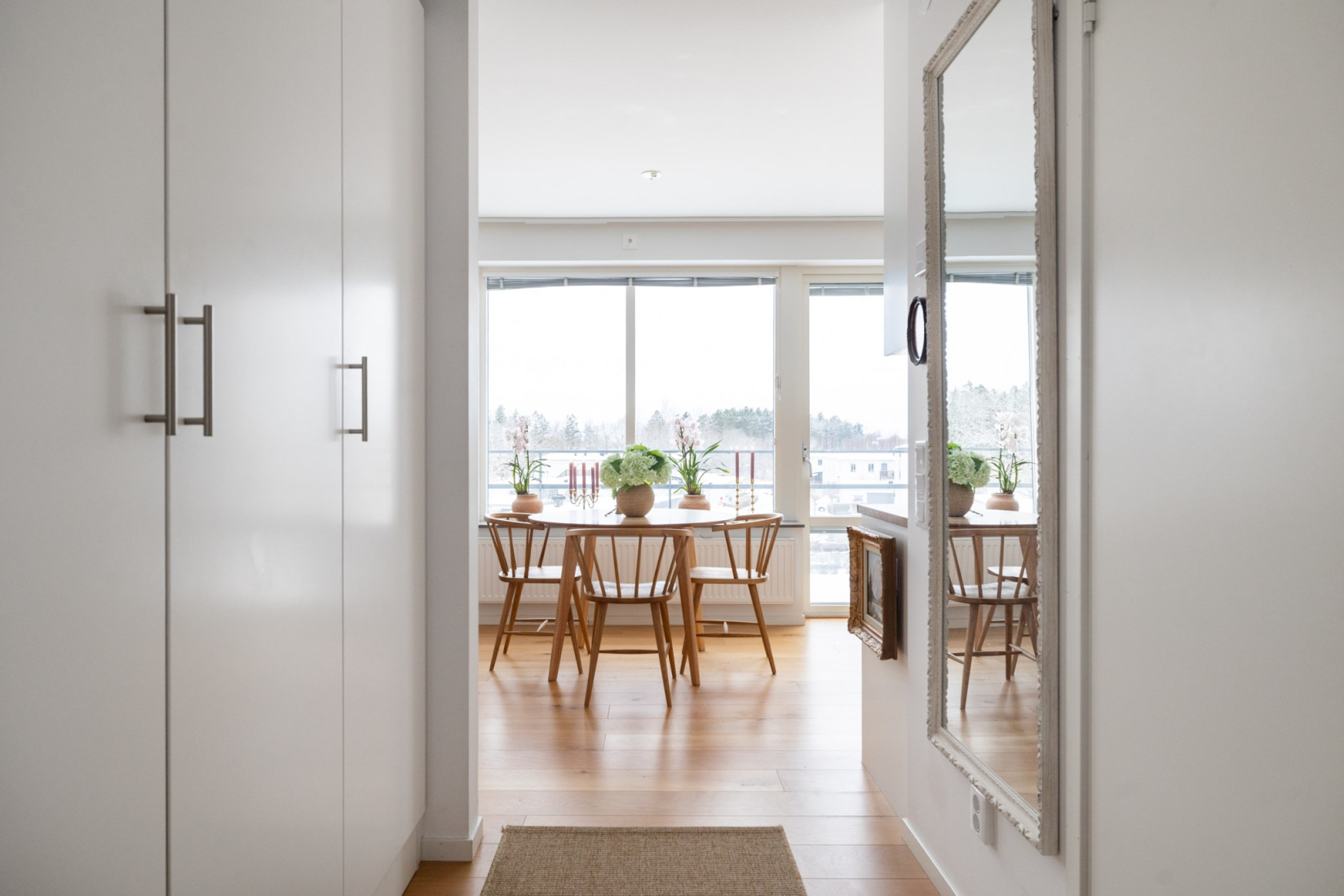 Ta hissen upp till tredje våningen där din entrébalkong välkomnar dig. När du kliver in genom dörren möts du av ett grått klinkergolv och en hall med gott om förvaring i fyra garderober. Resten av lägenheten pryds av ett stilrent parkettgolv som ger en varm och hemtrevlig känsla.