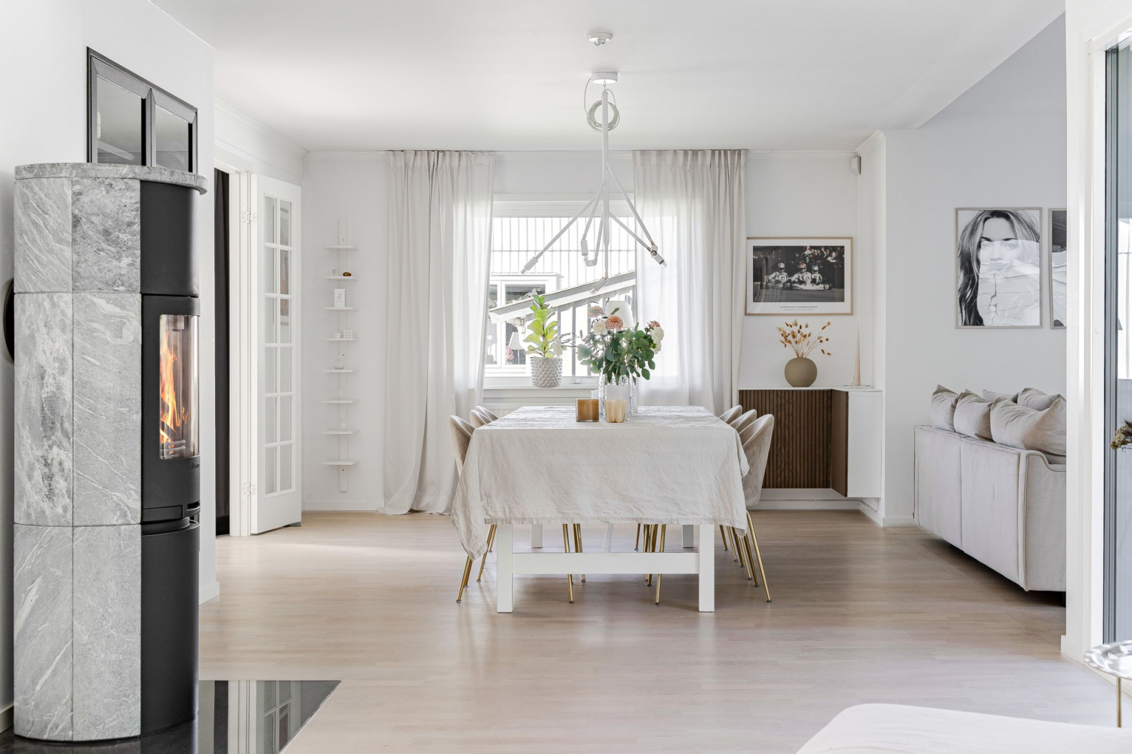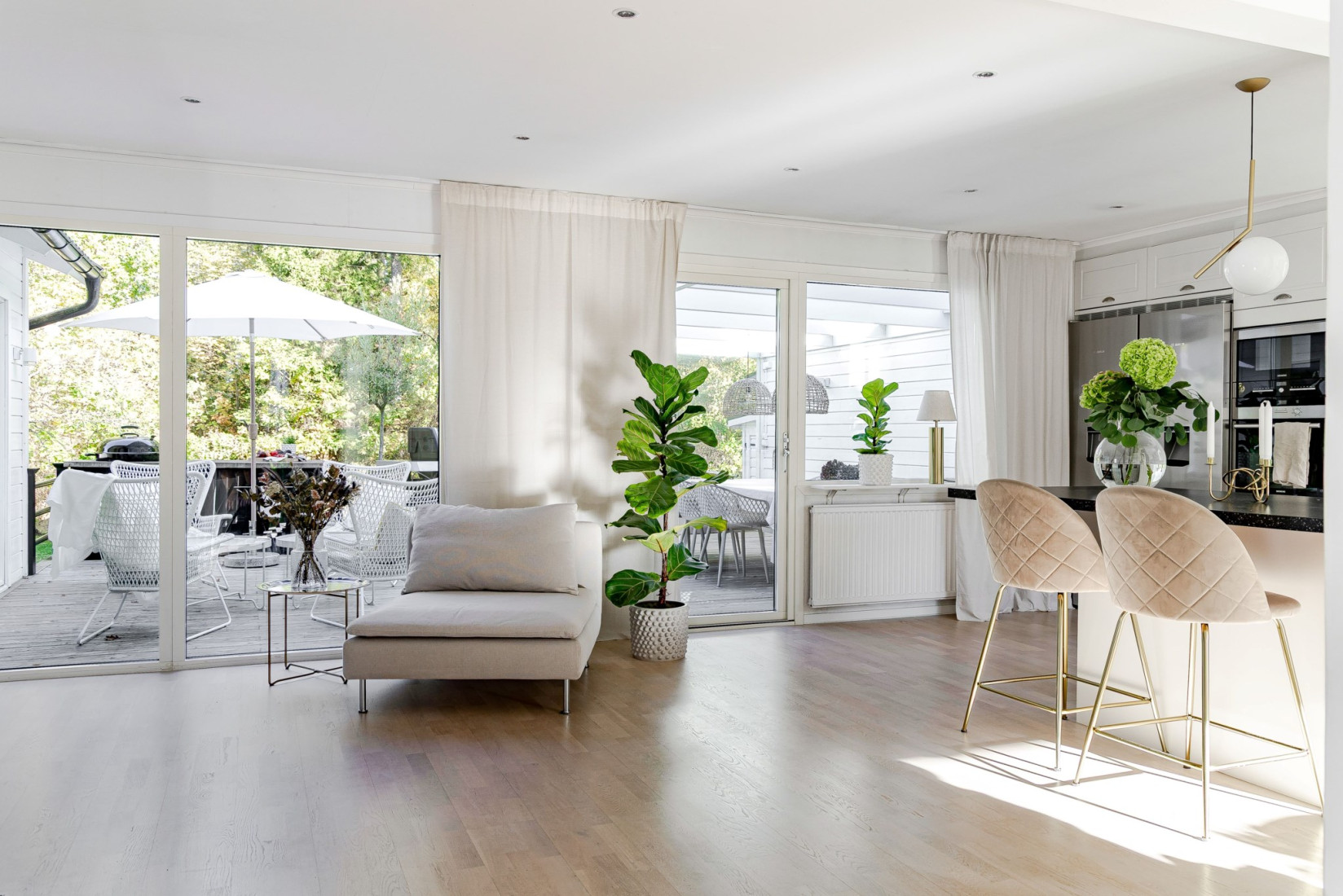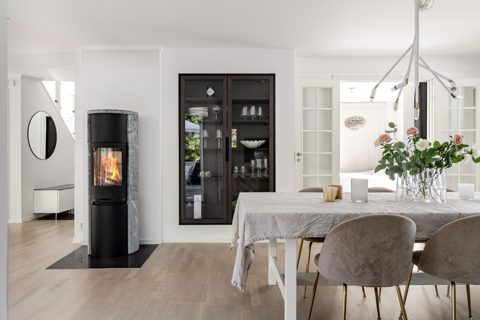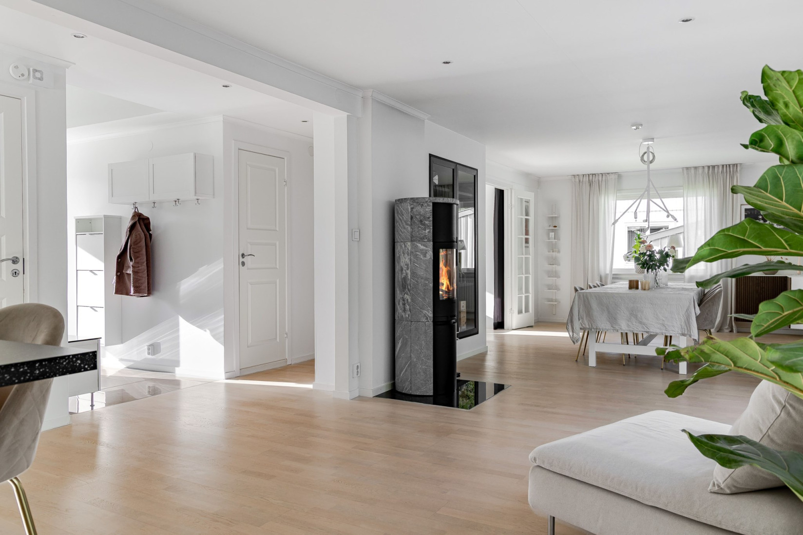 - Luftigt och inbjudande VARDAGSRUM med parkettgolv, härligt ljusinsläpp från stora fönsterpartier samt täljstenskamin som både kan hjälpa till att sänka uppvärmningskostnaderna samtidigt som den verkligen höjer mysfaktorn.