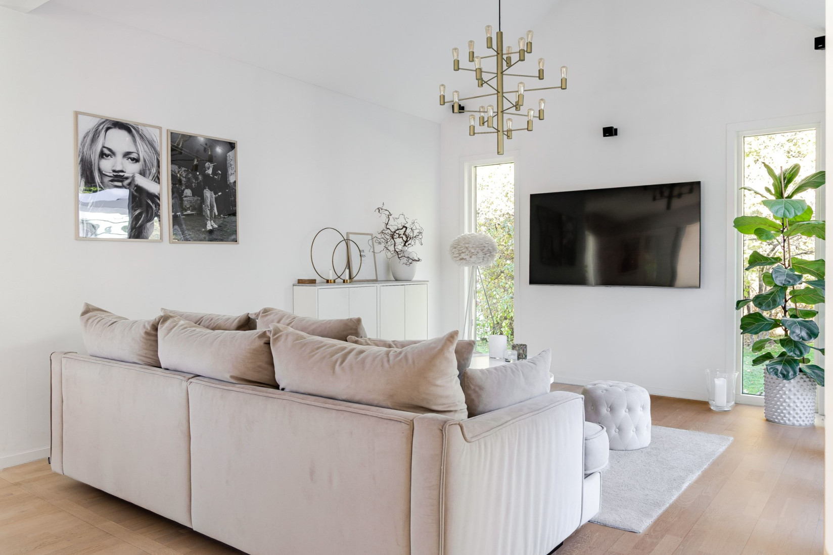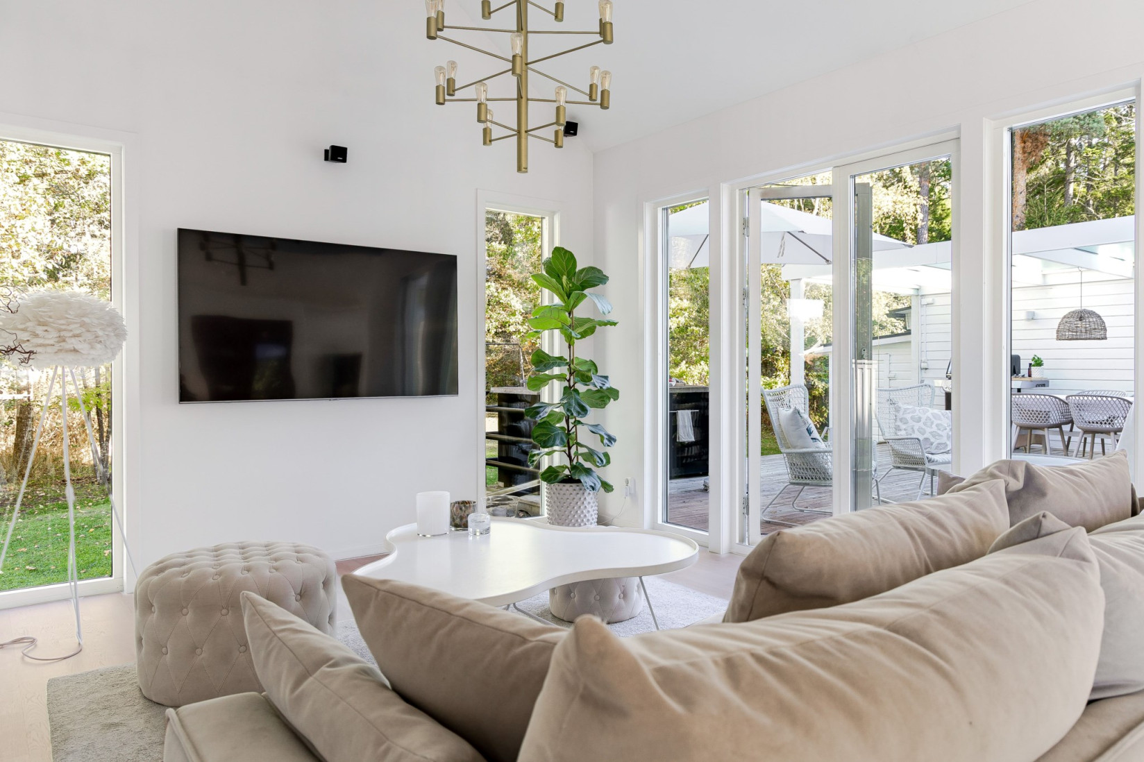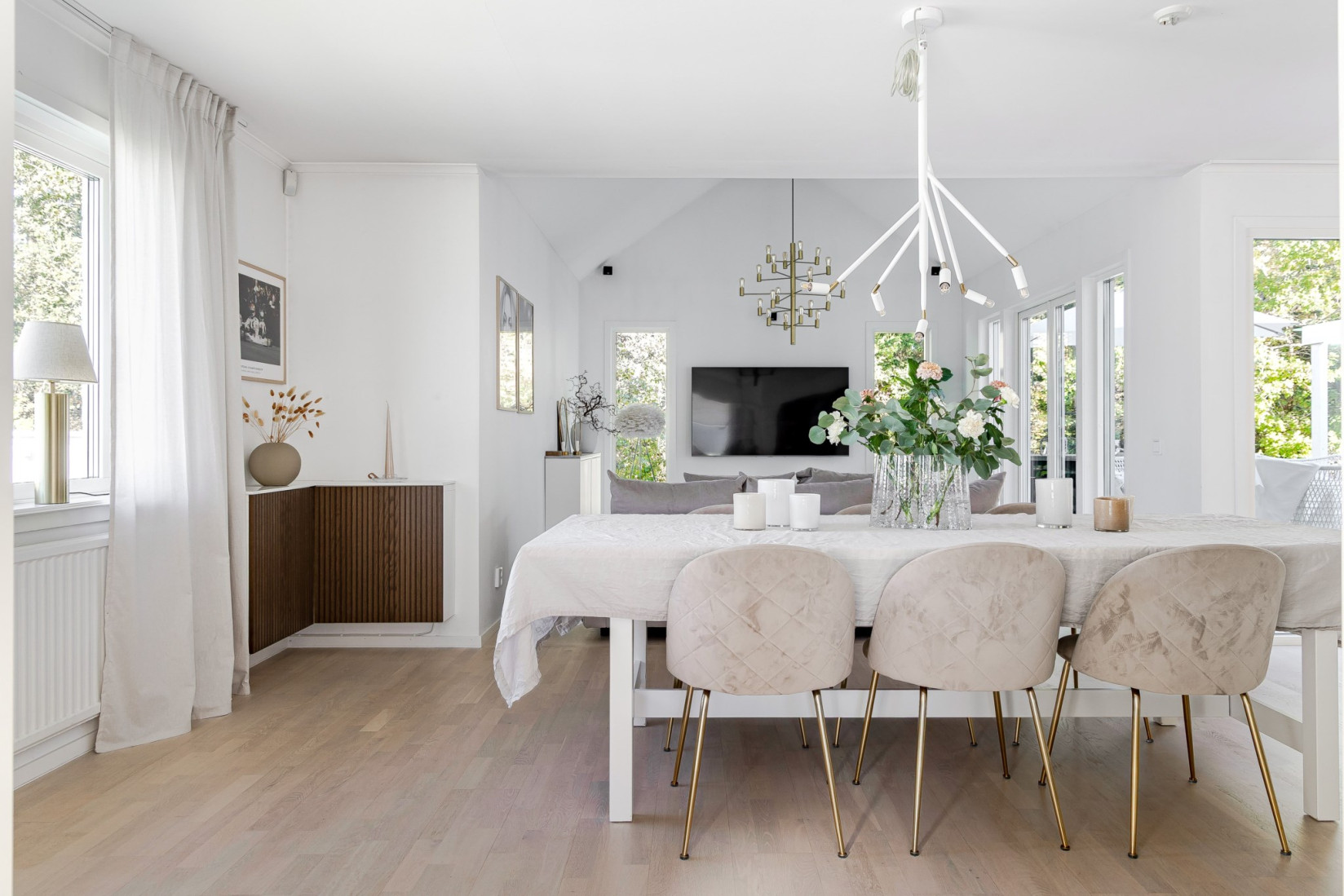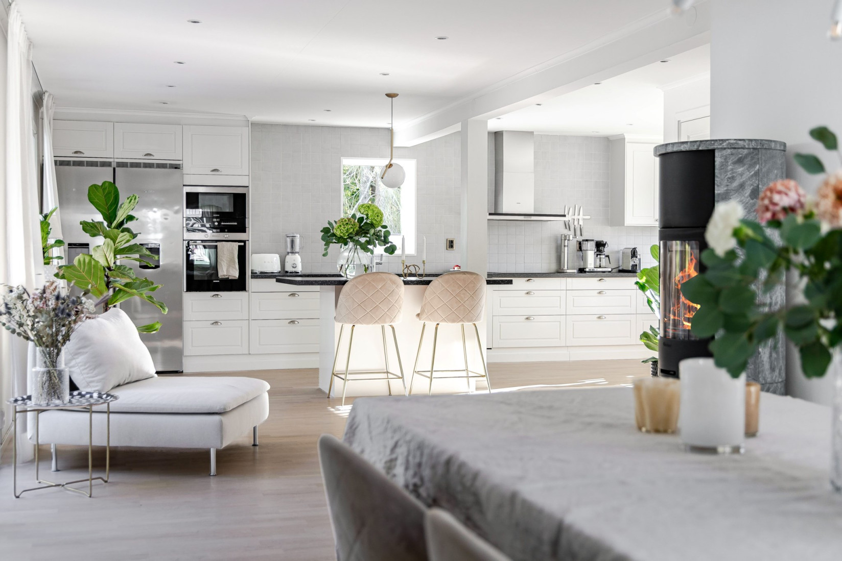 - Luftigt och inbjudande VARDAGSRUM med parkettgolv, härligt ljusinsläpp från stora fönsterpartier samt täljstenskamin som både kan hjälpa till att sänka uppvärmningskostnaderna samtidigt som den verkligen höjer mysfaktorn.