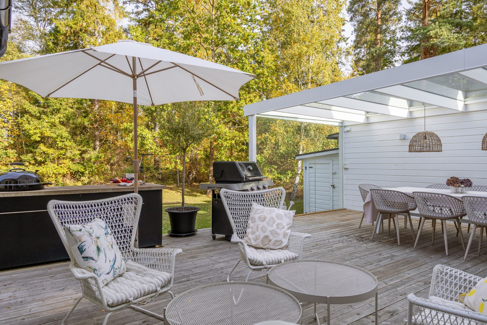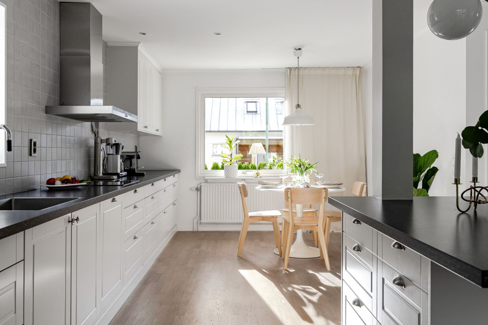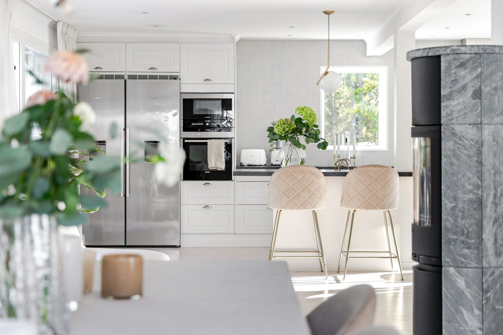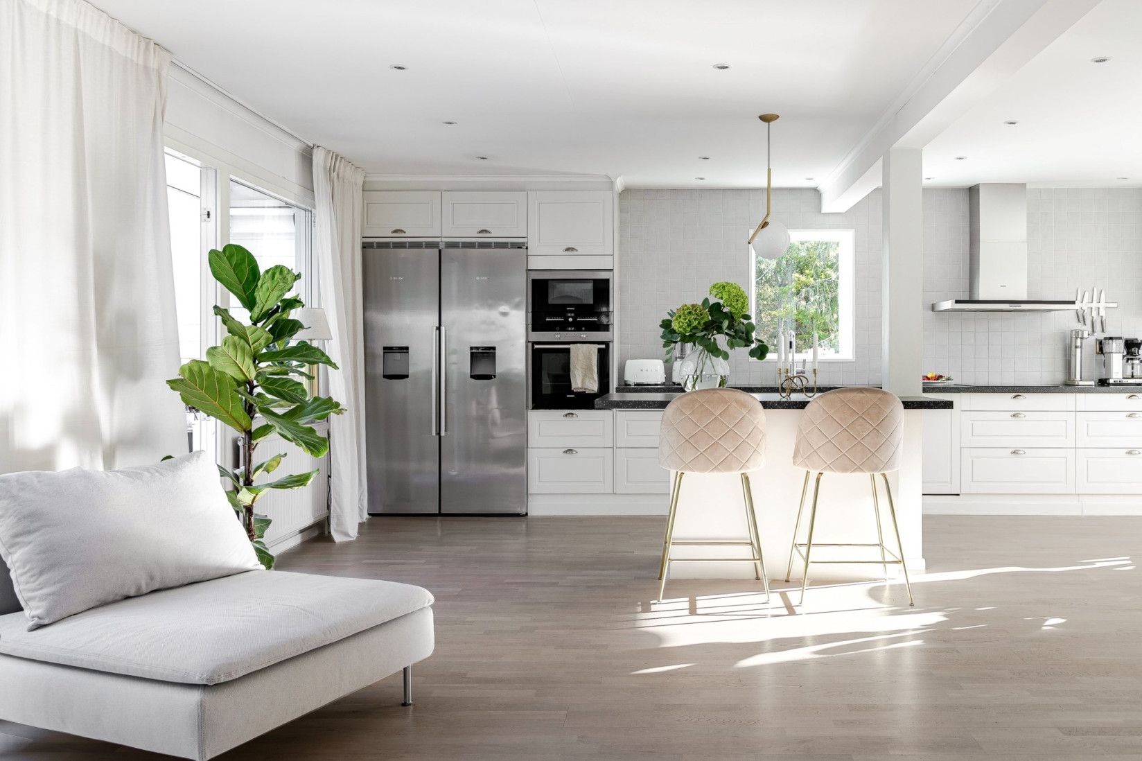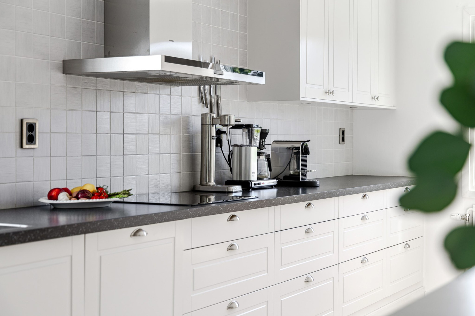 - Härligt KÖK med parkettgolv, gott om skåpsförvaring, praktisk köksö, gott om arbetsytor, matplats samt utgång till altanen. Köket maskinella utrustning består av kyl (2018), frys med ismaskin (2018), induktionshäll, köksfläkt, integrerad diskmaskin samt inbyggd ugn och mikro.