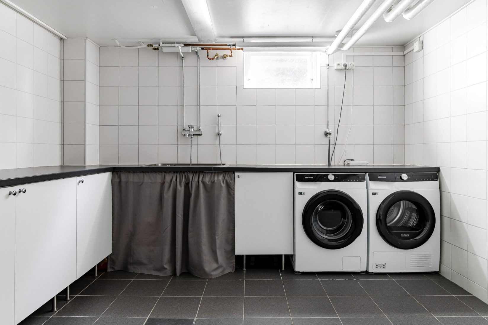 - Ljus TVÄTTSTUGA med klinkergolv, kaklade väggar, gott om skåpsförvaring, tvättho, tvättmaskin (2021) samt torktumlare (2021).
