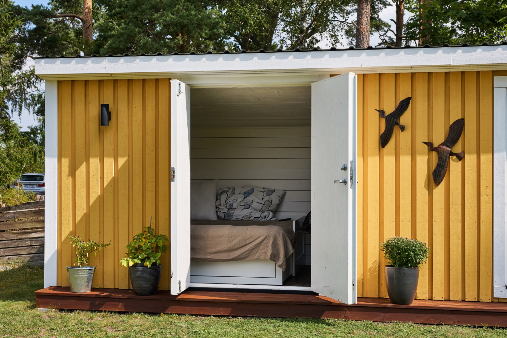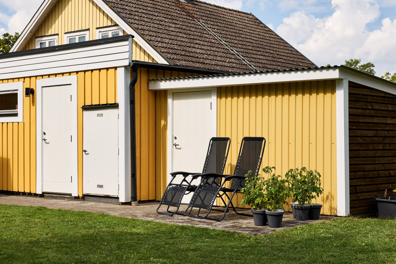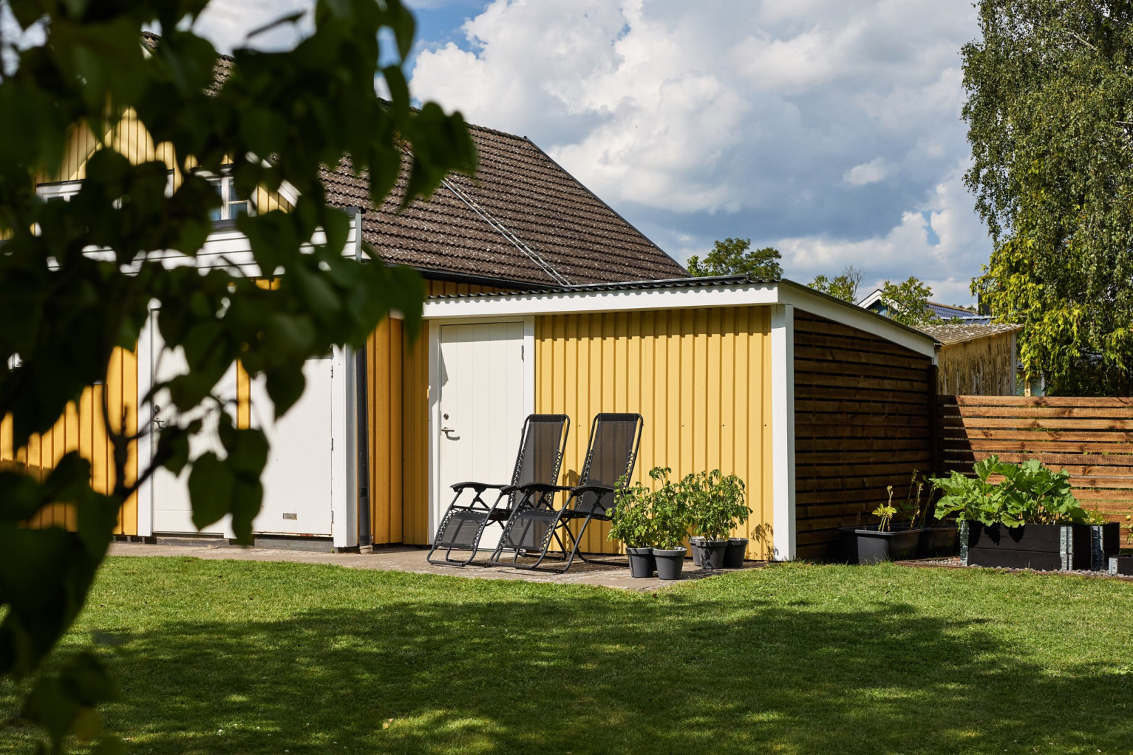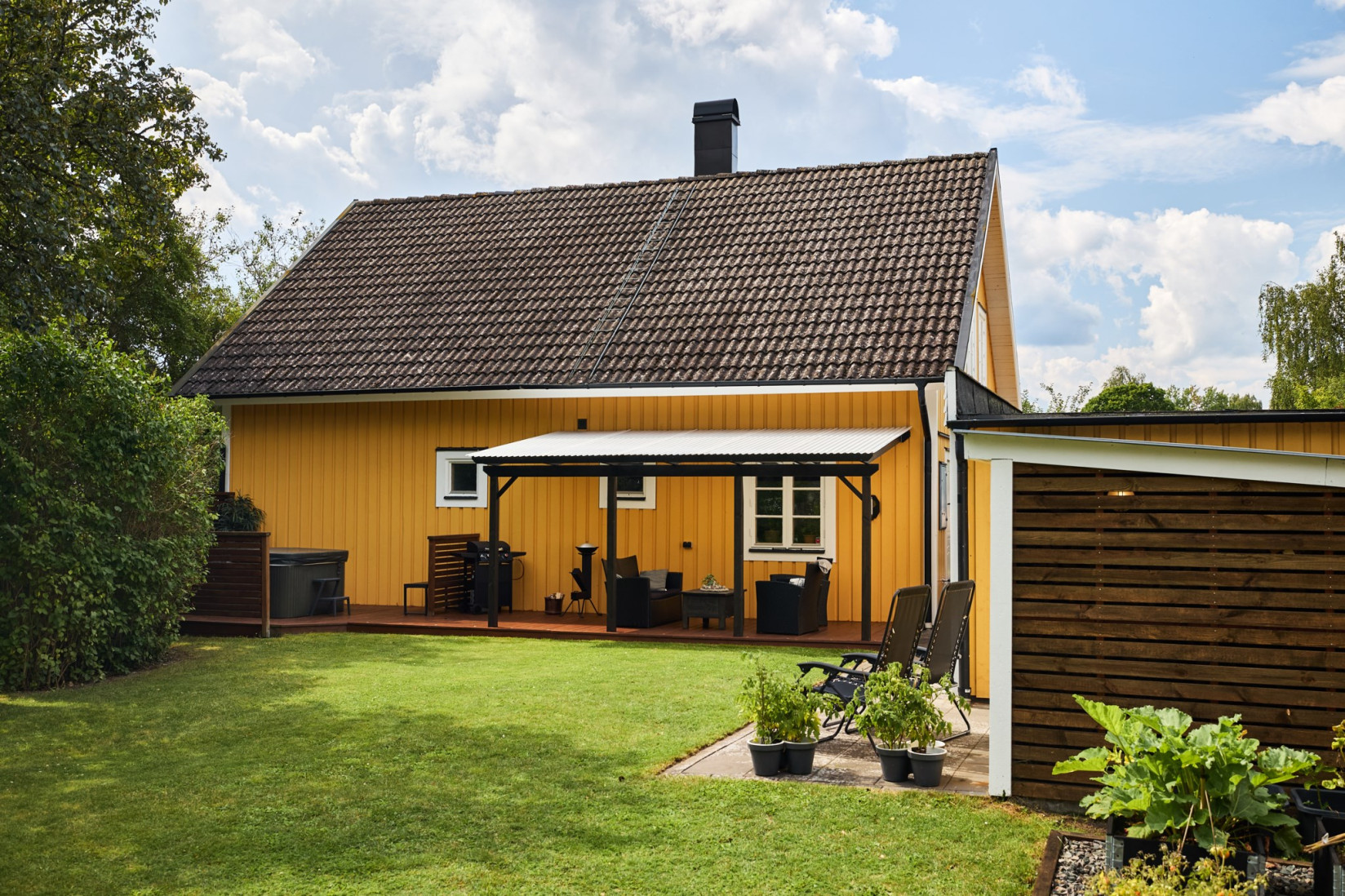 Och så baksidan, husets dolda skatt. Här öppnar sig en plats för både vila och lek: en altan med spabad för sensommarkvällar, ett charmigt gästhus med egen uteplats och en trädgård som tycks oändlig. Här kan barnen springa barfota i gräset, spela fotboll eller utmana varandra i kubb, medan kvällen långsamt sänker sig och syrsorna tar över ljudbilden.