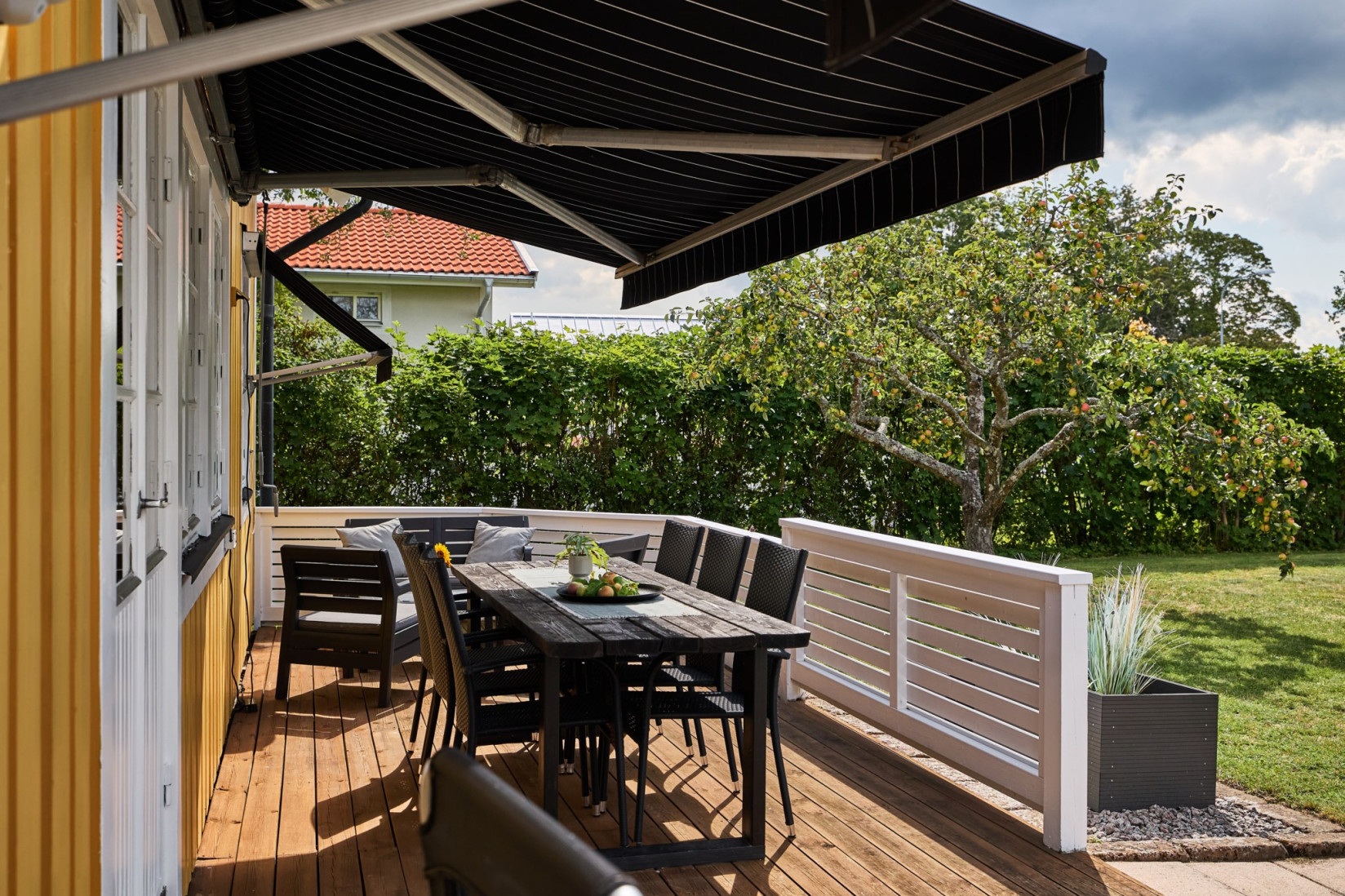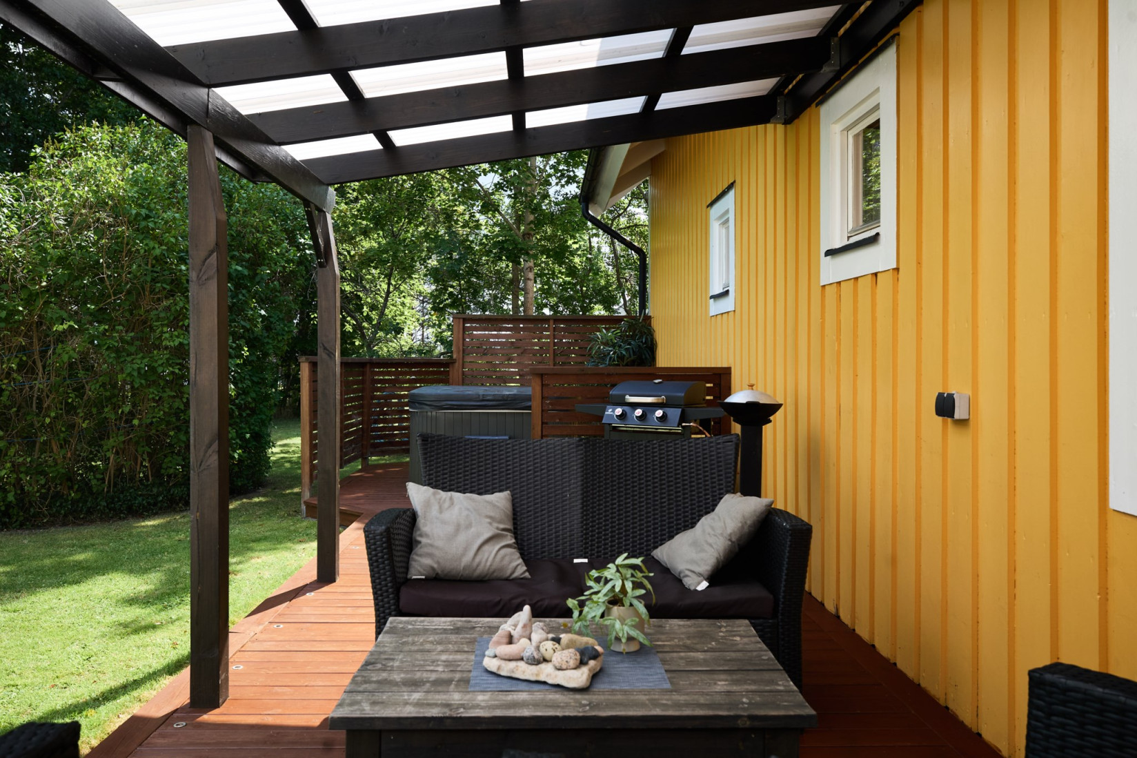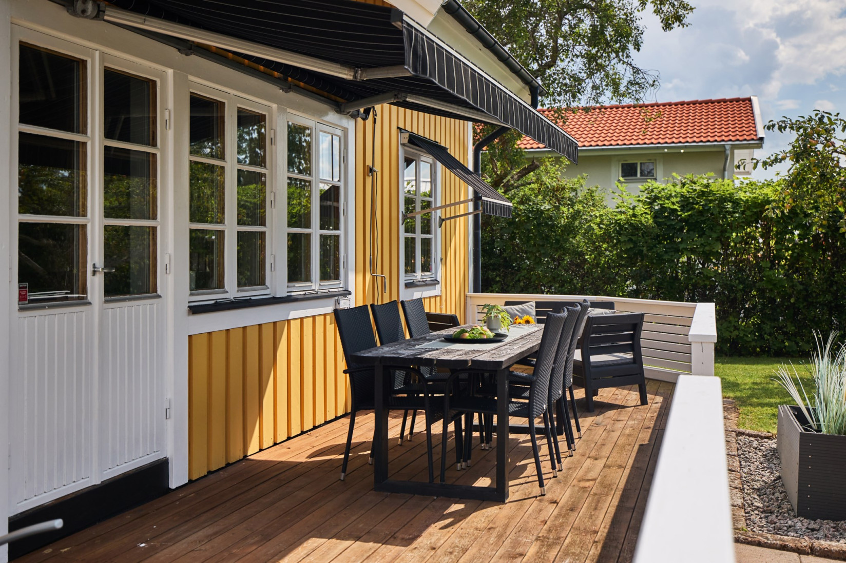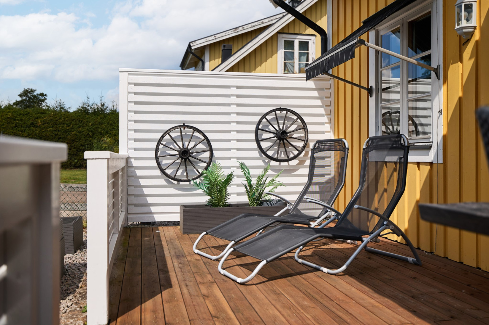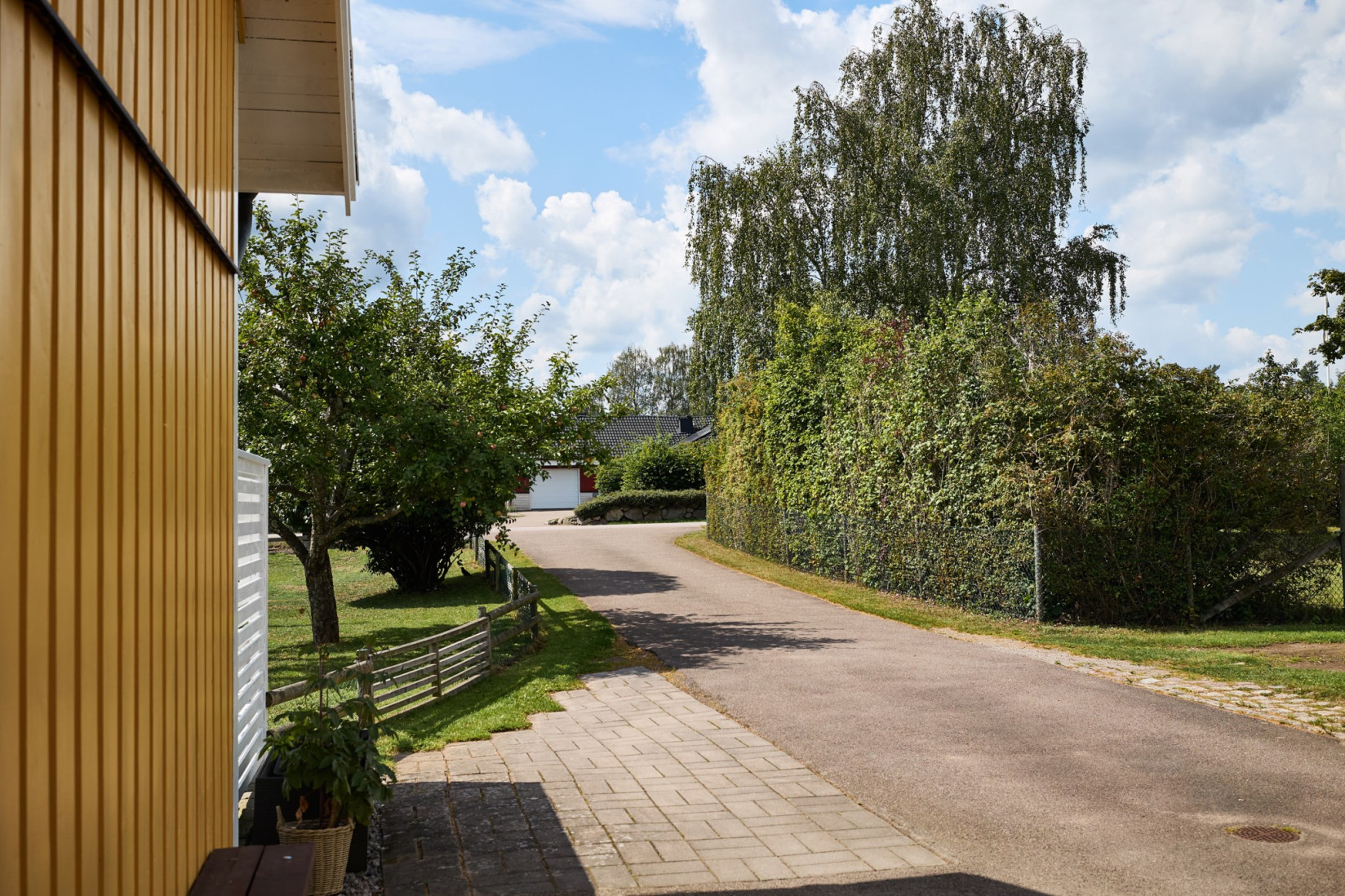 Och så baksidan, husets dolda skatt. Här öppnar sig en plats för både vila och lek: en altan med spabad för sensommarkvällar, ett charmigt gästhus med egen uteplats och en trädgård som tycks oändlig. Här kan barnen springa barfota i gräset, spela fotboll eller utmana varandra i kubb, medan kvällen långsamt sänker sig och syrsorna tar över ljudbilden.