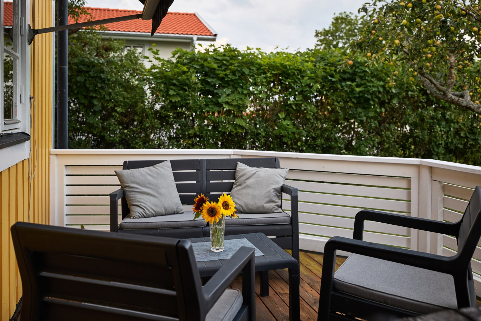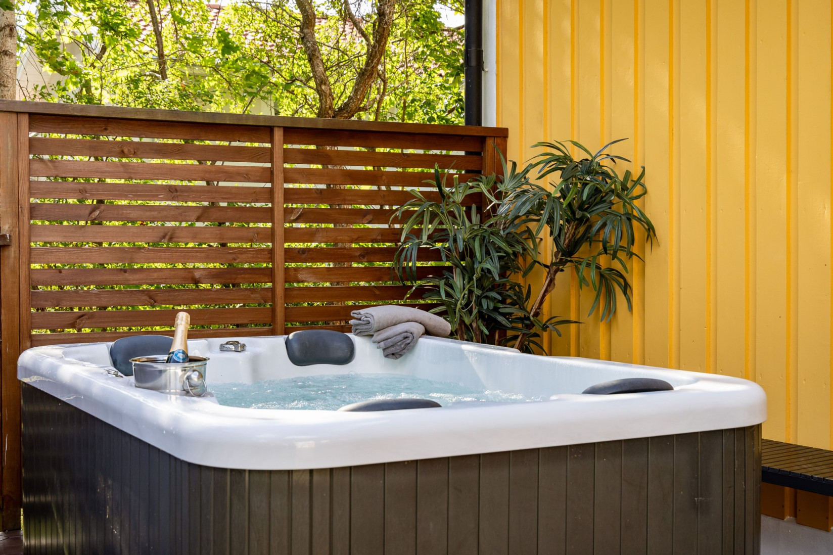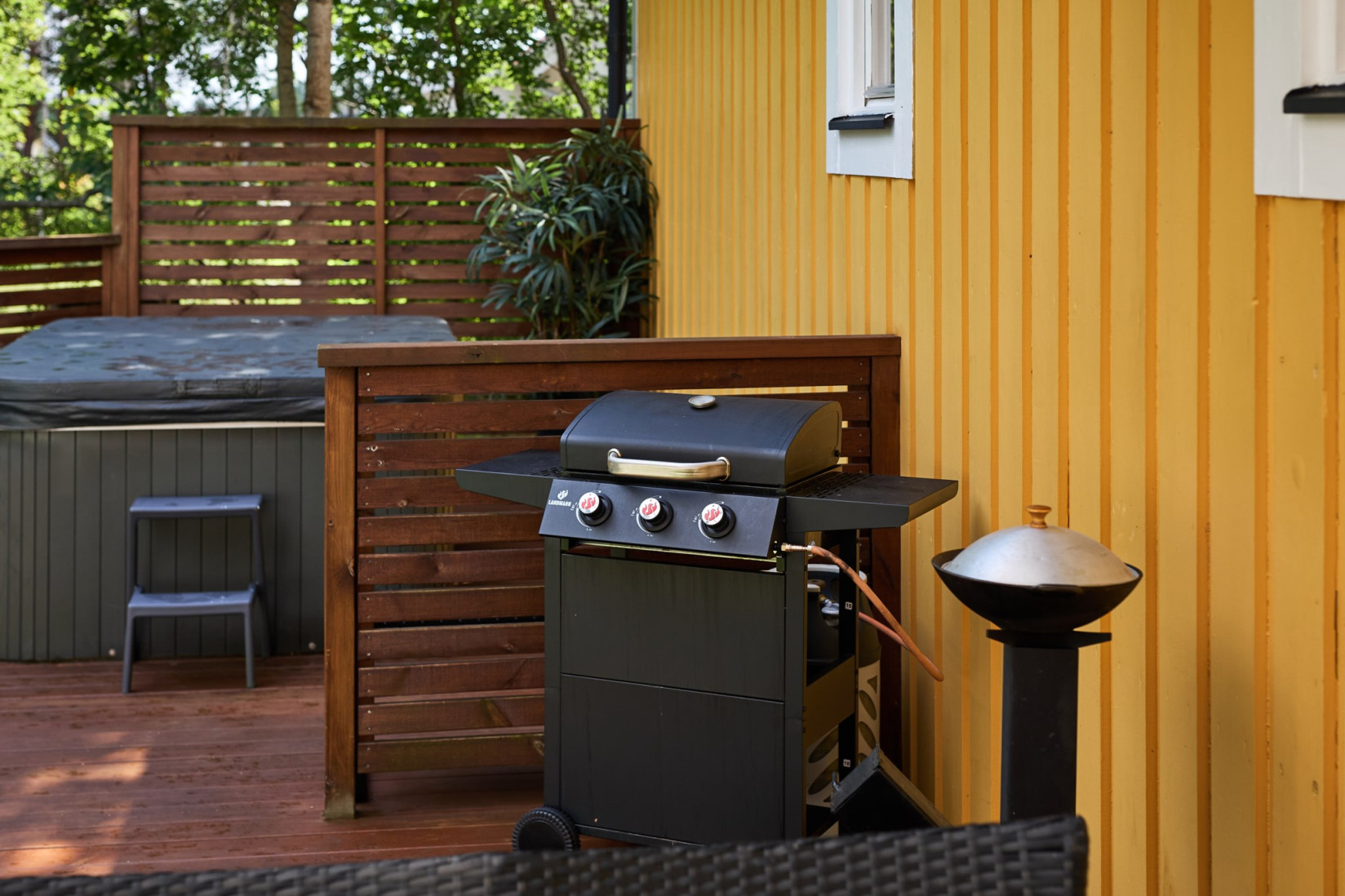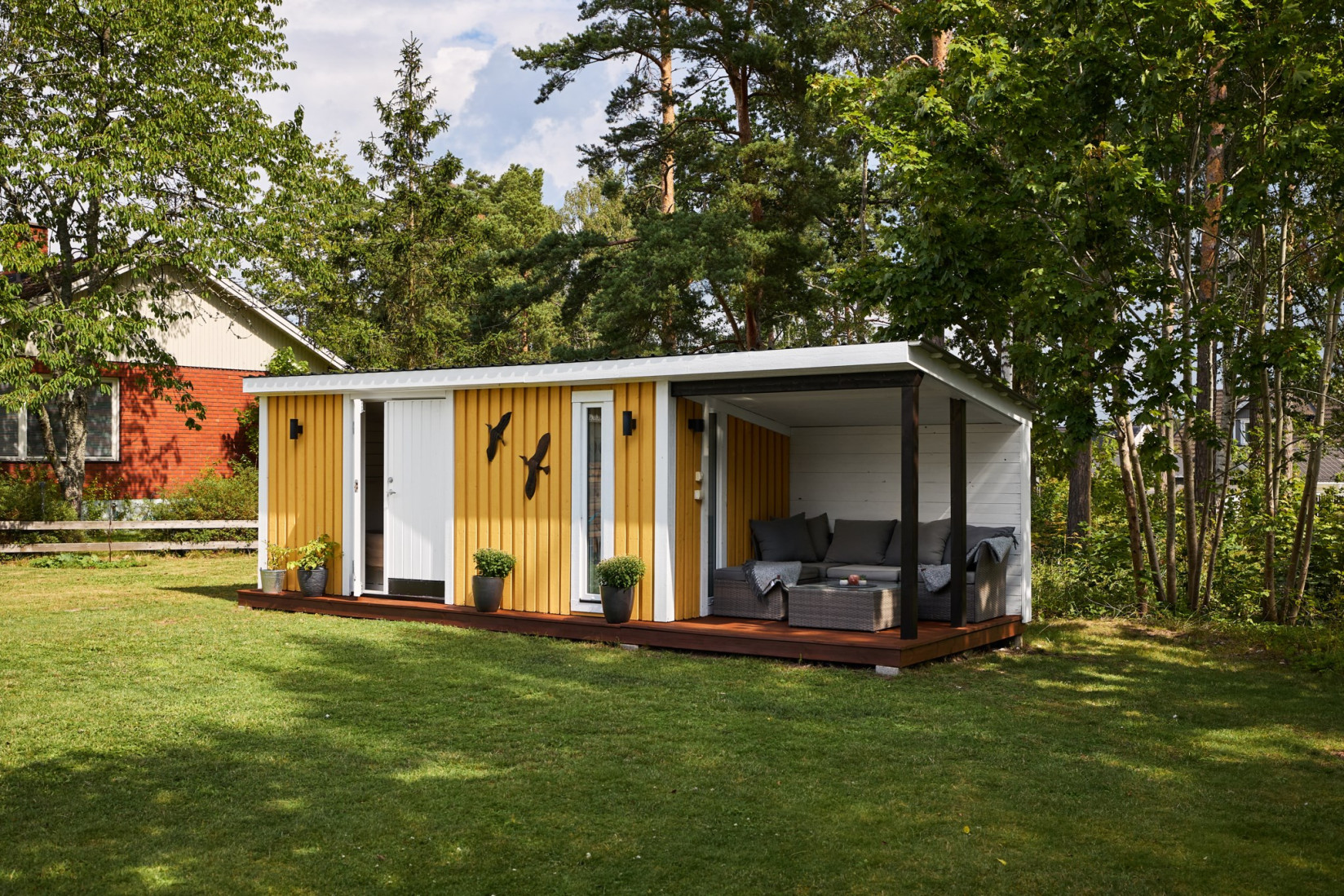 Och så baksidan, husets dolda skatt. Här öppnar sig en plats för både vila och lek: en altan med spabad för sensommarkvällar, ett charmigt gästhus med egen uteplats och en trädgård som tycks oändlig. Här kan barnen springa barfota i gräset, spela fotboll eller utmana varandra i kubb, medan kvällen långsamt sänker sig och syrsorna tar över ljudbilden.