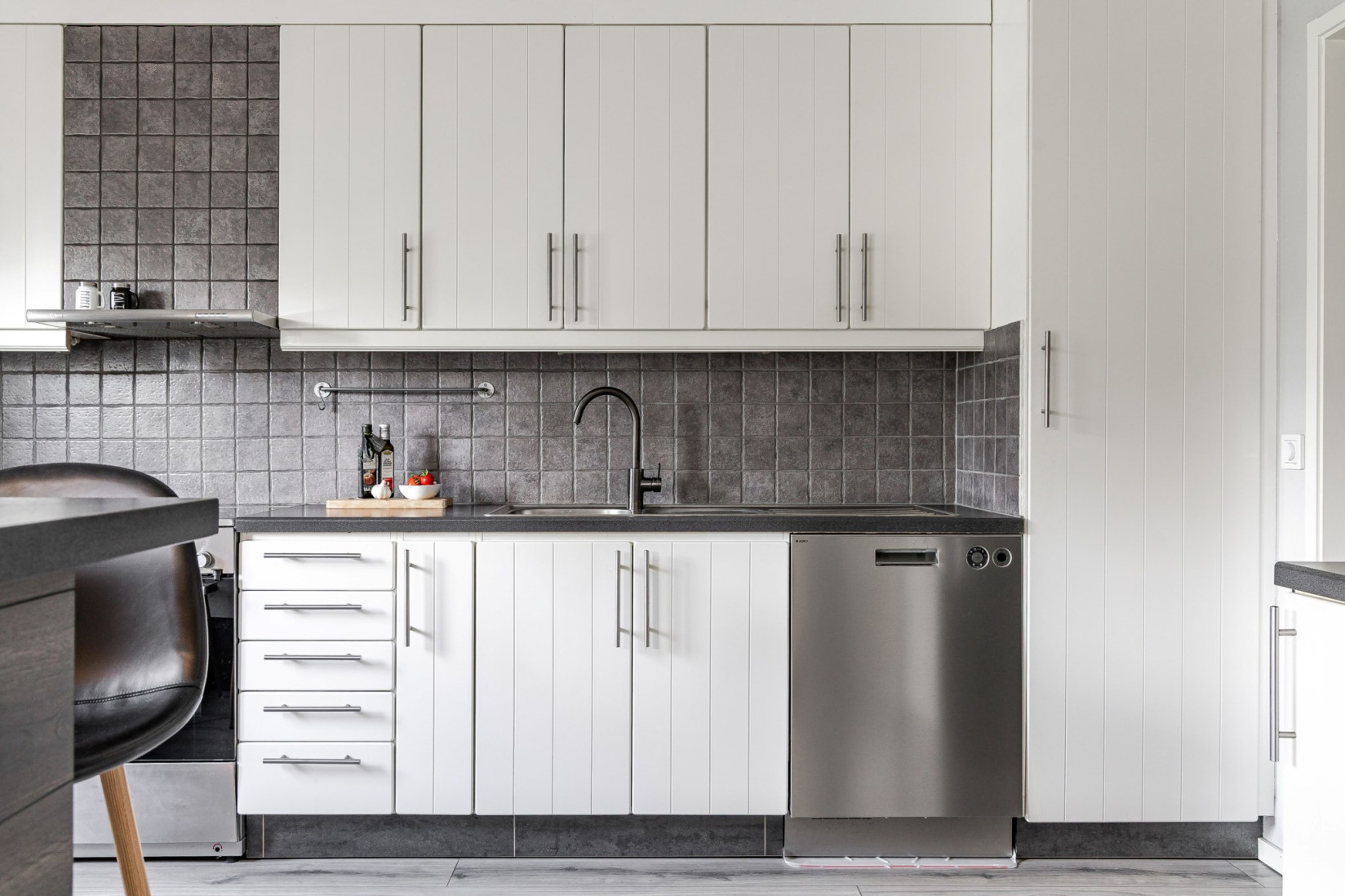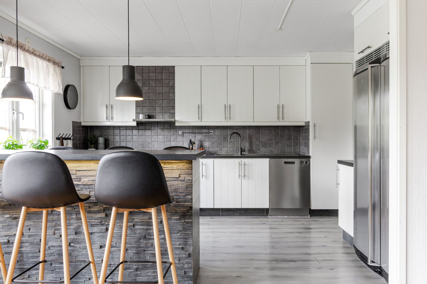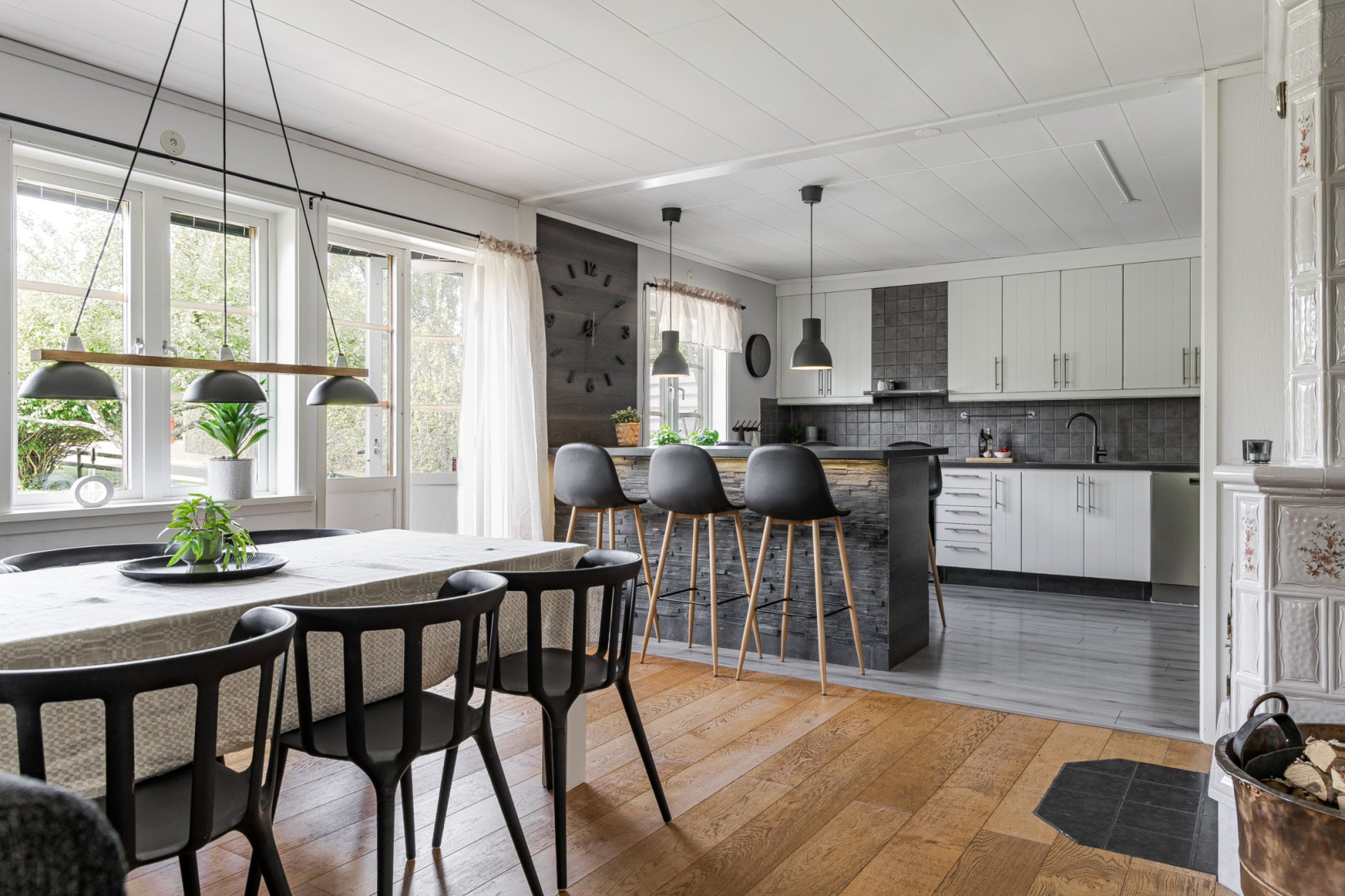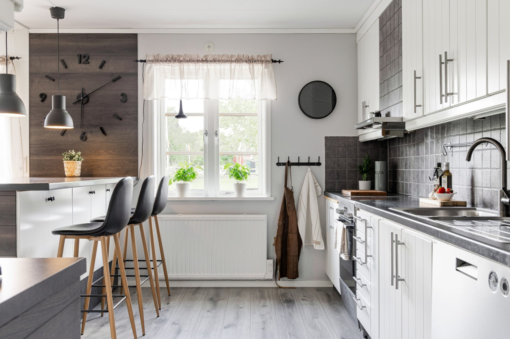 Till höger öppnar sig köket – ett rum för liv, dofter och gemenskap. Rymligt, välplanerat och fyllt av möjligheter. Mittpunkten är köksön, där samtalen kan ta vid medan maten puttrar på spisen. Här ryms frukostar som dröjer länge, skratt som ekar och sena kvällar då ljuset från lamporna blandas med värmen från cronspisen i vardagsrummet intill. Stora fönster leder blicken ut mot trädgården, där äppel- och päronträden blommar, och där sommaren bjuder på bär som spricker av sötma i solen.