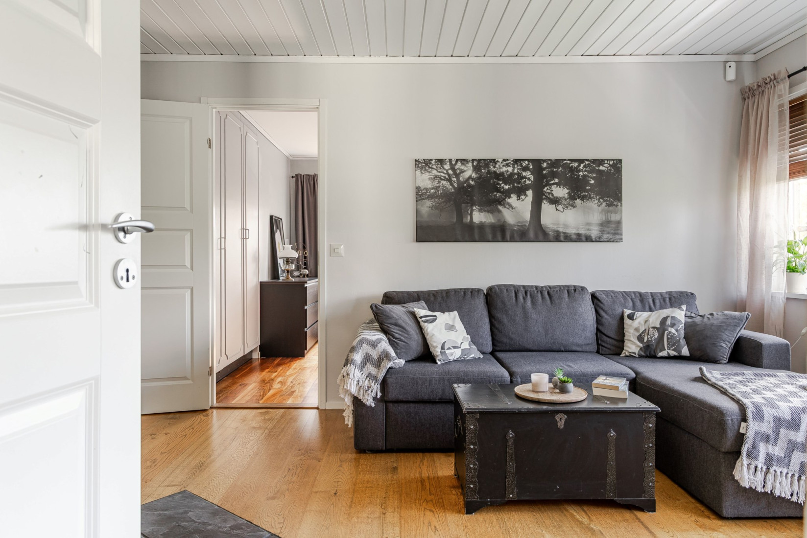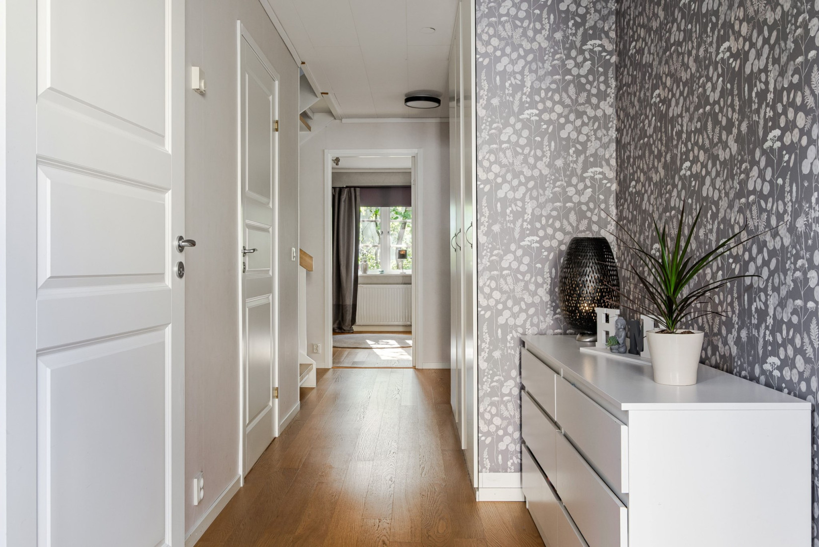 Bilen glider in på den asfalterade uppfarten, och när garagedörren stängs bakom oss känns det som om världen där ute lämnas kvar. Dörren öppnas, och vi stiger in i en ljus hall som välkomnar med stillsam enkelhet. Här är allt på plats, redo att bära både vardag och fest.