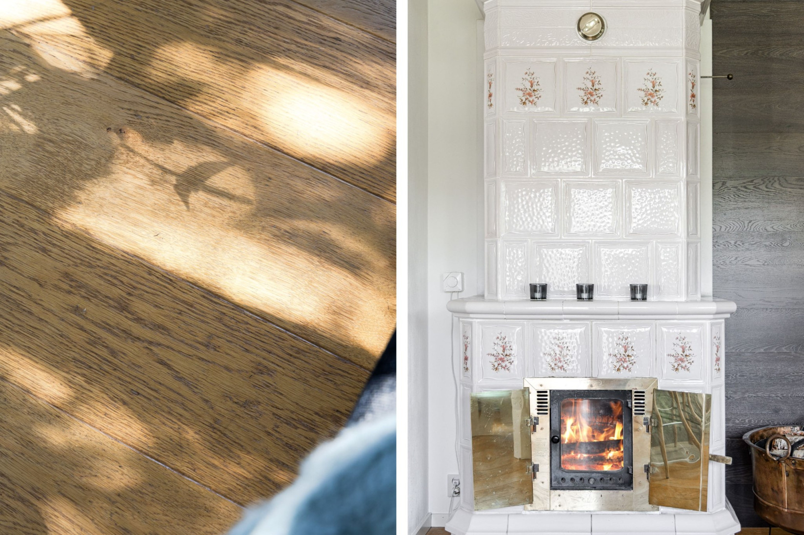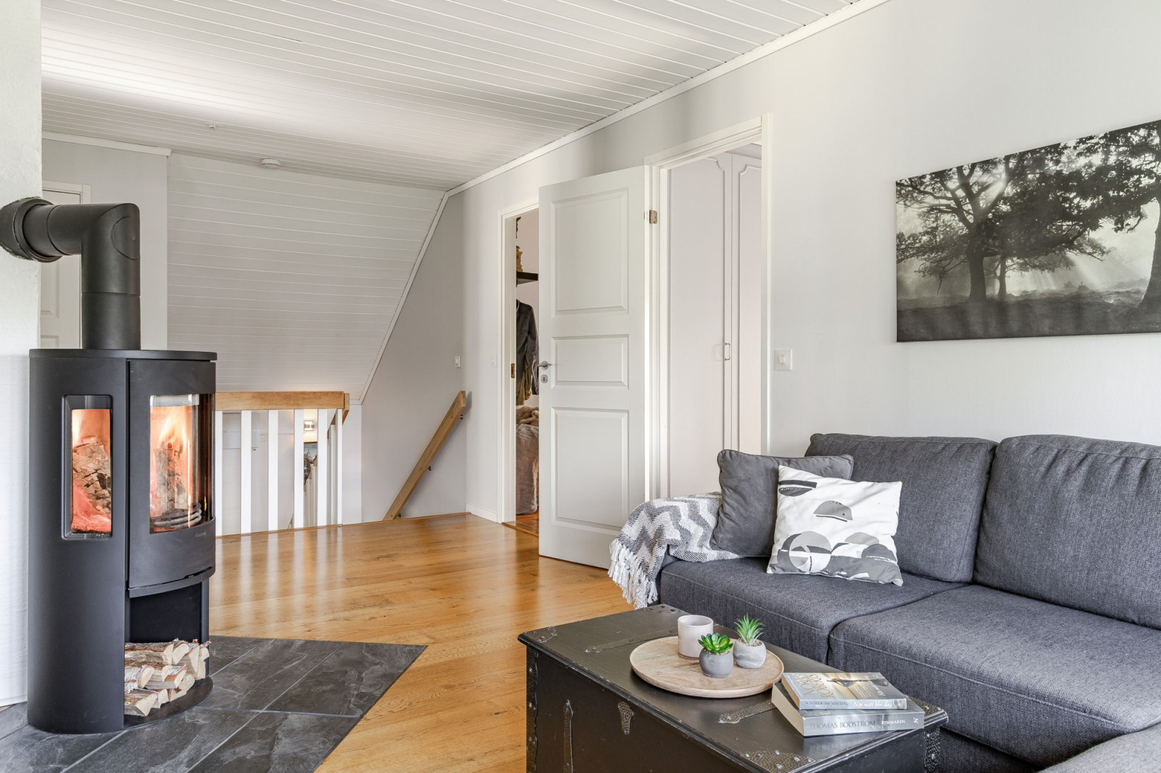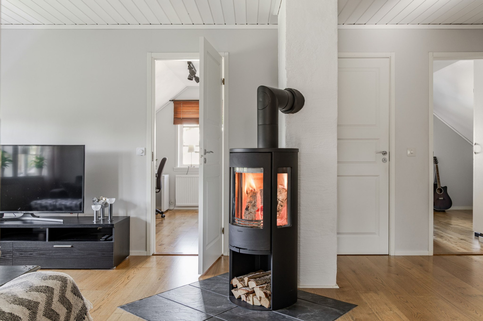 Trappan leder oss uppåt, och där möts vi av ett allrum som badar i ljus. En conturakamin sprakar stilla och sprider värme när hösten knackar på. Här, mellan de stora fönstren, samlas familjen i mjuka soffor, medan fyra rymliga sovrum och ett badrum med både badkar och dusch väntar för ro och avkoppling.