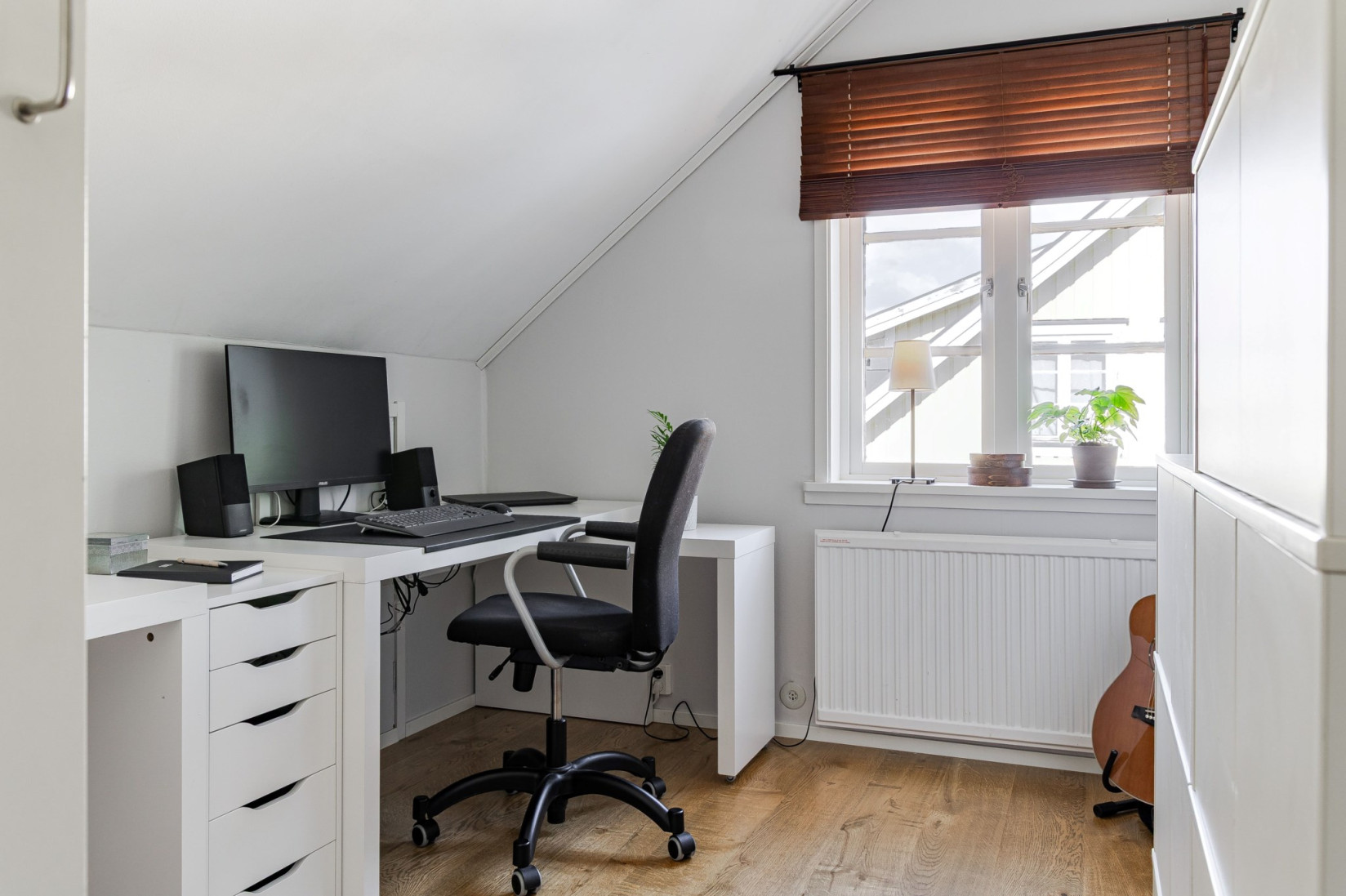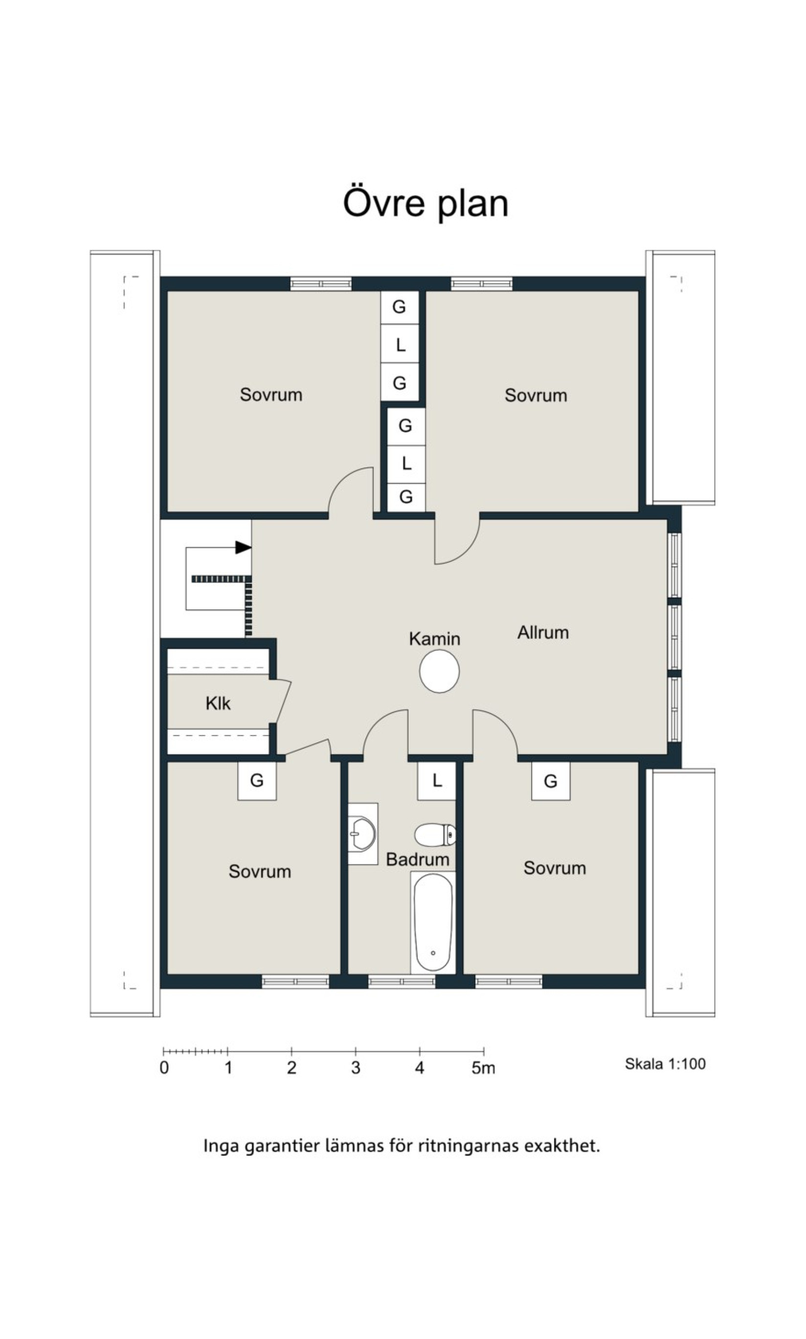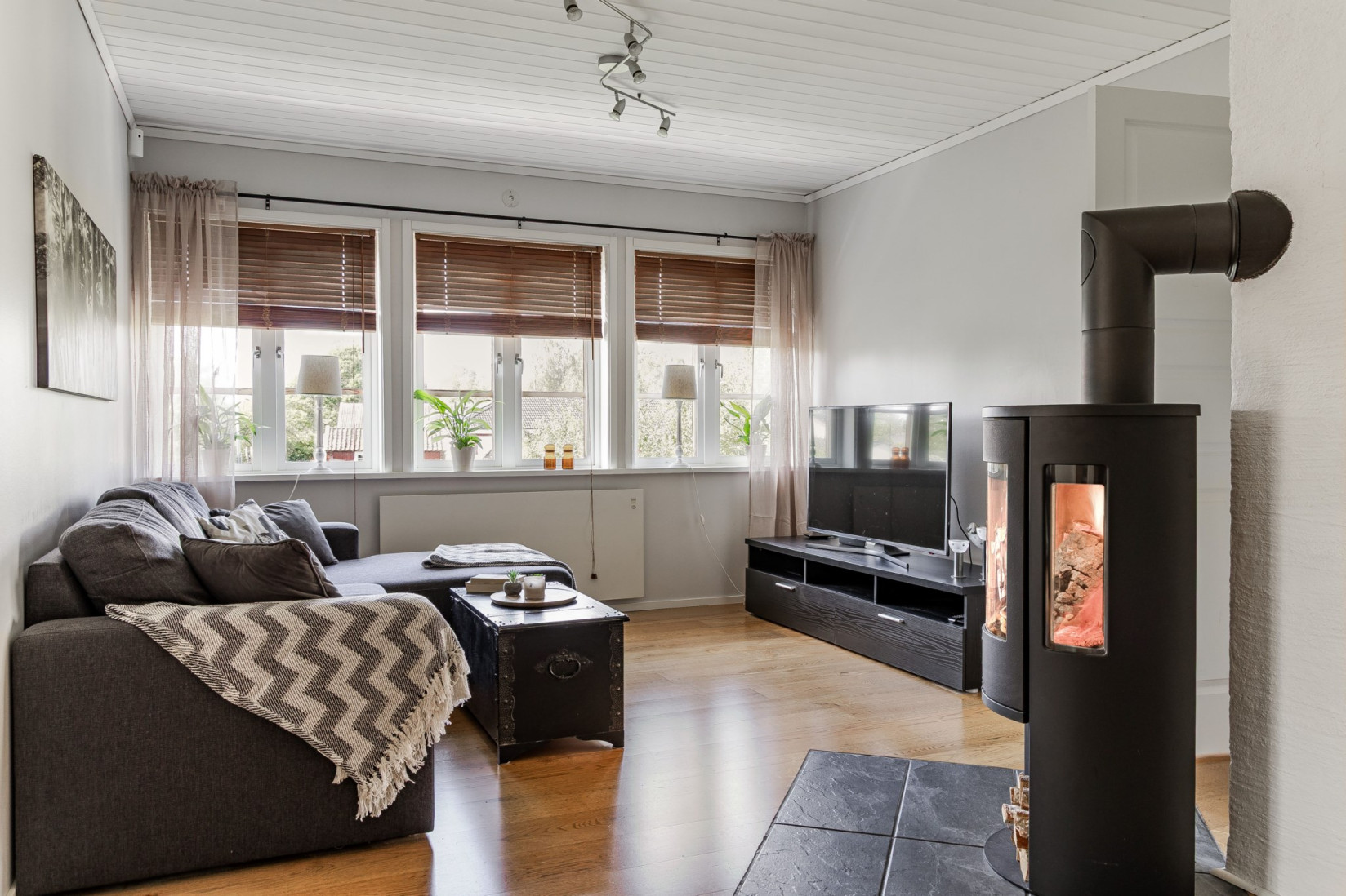 Trappan leder oss uppåt, och där möts vi av ett allrum som badar i ljus. En conturakamin sprakar stilla och sprider värme när hösten knackar på. Här, mellan de stora fönstren, samlas familjen i mjuka soffor, medan fyra rymliga sovrum och ett badrum med både badkar och dusch väntar för ro och avkoppling.