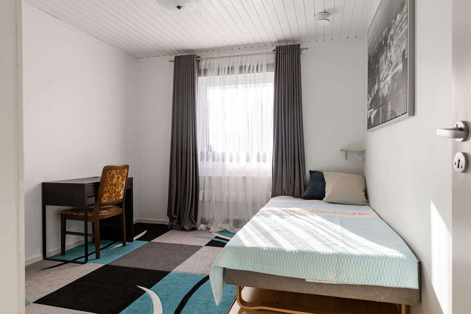 Sovrummet ligger i direkt anslutning till vardagsrummet och har ljusa tapeter och plastmatta på golvet.