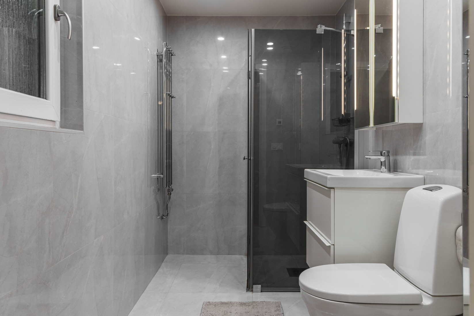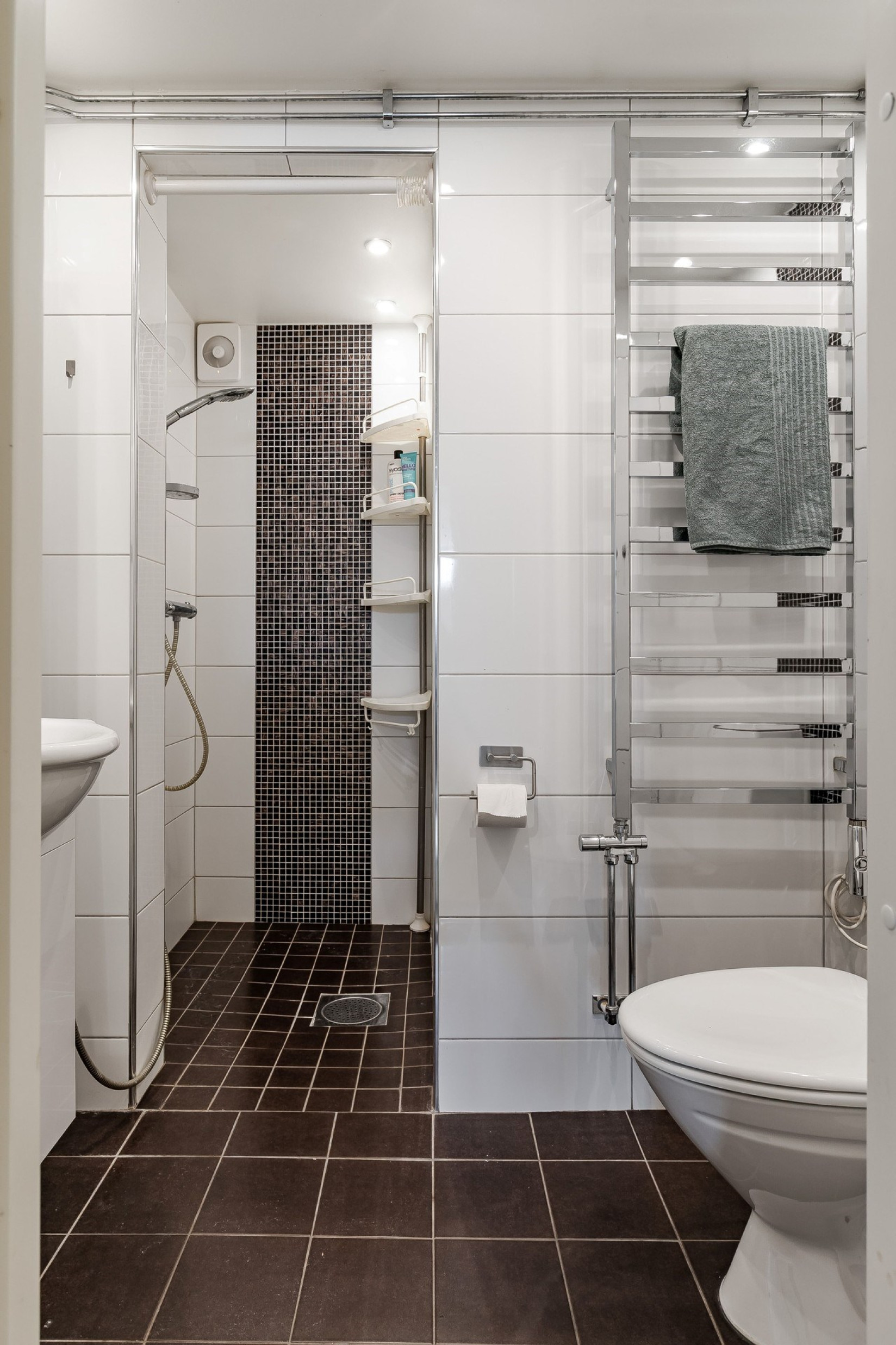Badrummet är både ljust och fräscht, med en modern dusch, toalett och tvättställ. Helrenoverat 2022 med vackert klinker och kakel samt golvvärme för extra komfort. Dessutom har stammarna bytts ut vilket ger en extra trygghet.