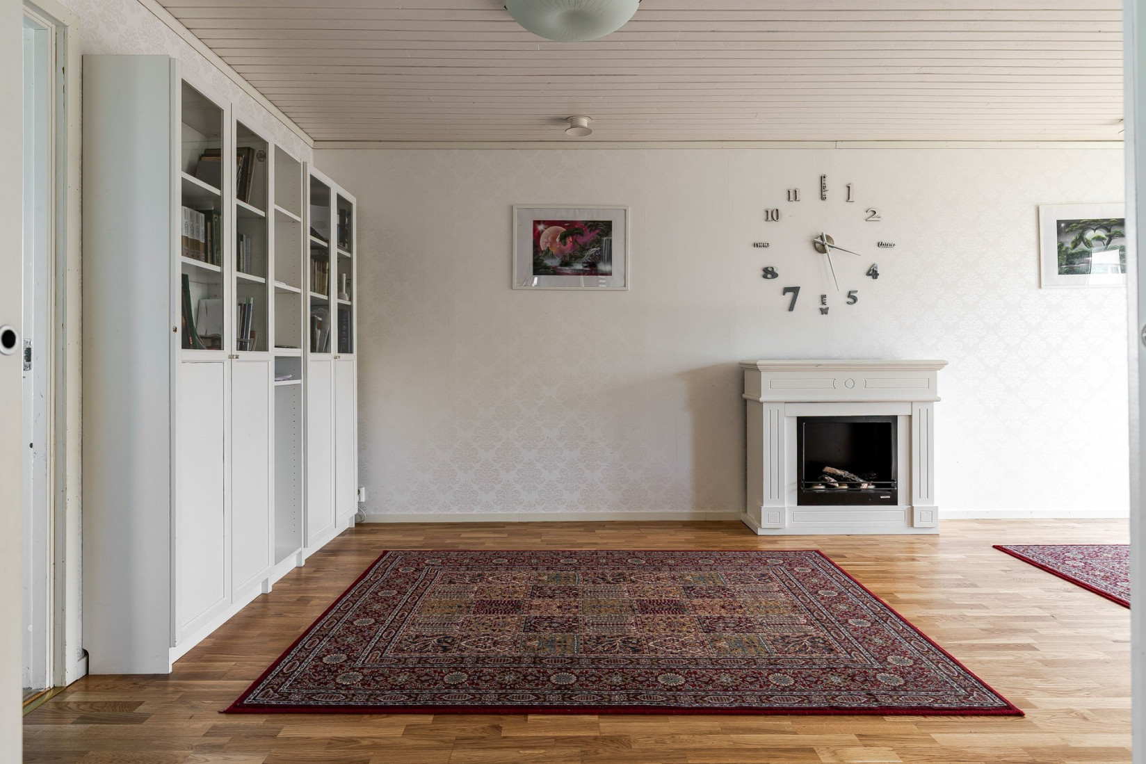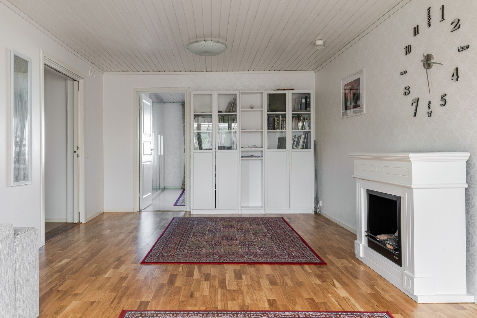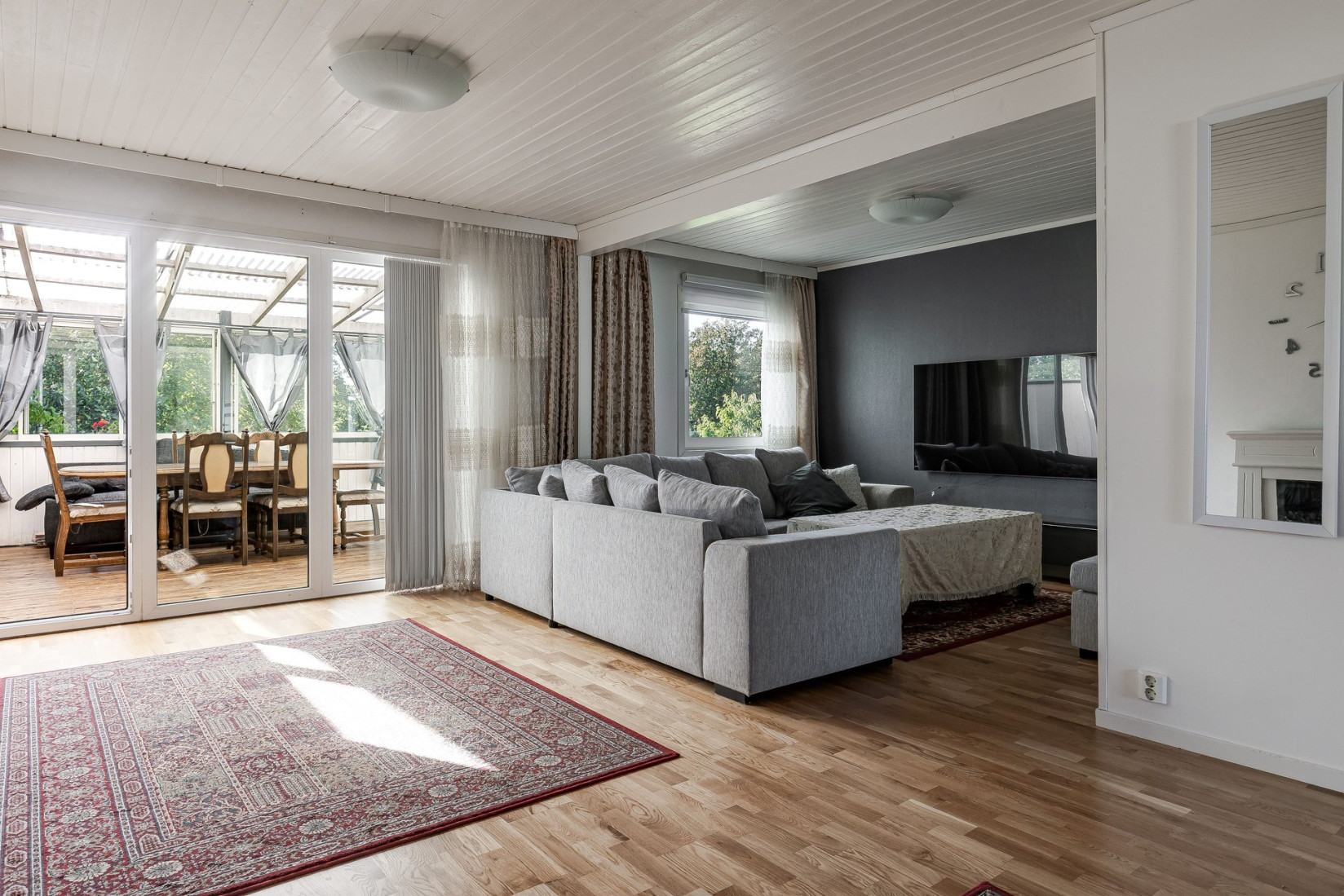 Vardagsrummet är stort och luftigt med ett stiligt parkettgolv och ljusa tapeter. Rummet ligger i vinkel vilket ger en bra känsla av rymd och funktionalitet. Härifrån har du även direkt access till den inglasade altanen på baksidan, vilket gör det enkelt att ta in både ljus och natur direkt in i hemmet.