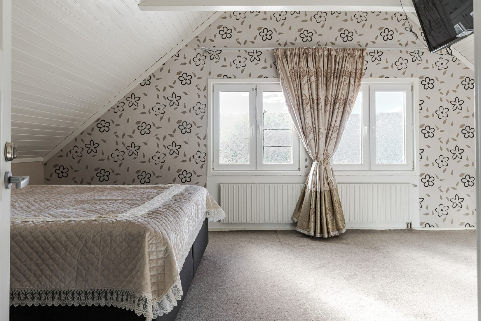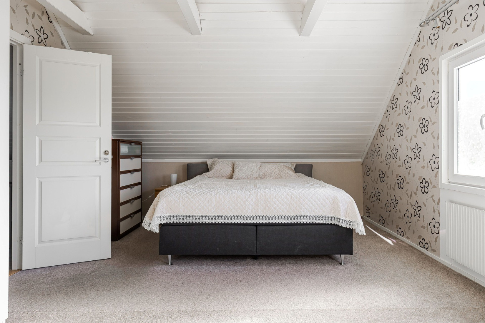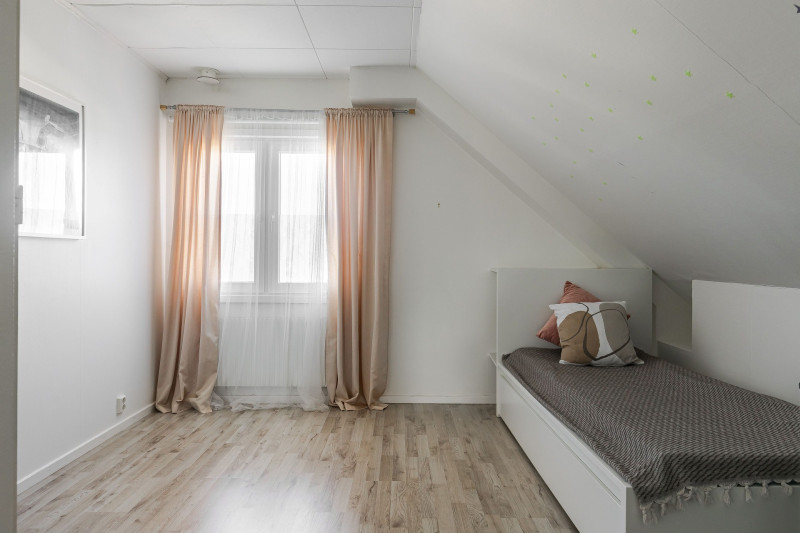 Detta stora och härliga sovrum bjuder på en luftig känsla med öppet upp till nock, vilket ger en fantastisk rymd och på golvet ligger en nyare heltäckningsmatta. De två fönstren på gaveln släpper in rikligt med ljus och ger en härlig utsikt. Båda fönstren är nya och energieffektiva isolerglasfönster, vilket ger både bättre isolering och ett tystare inomhusklimat.