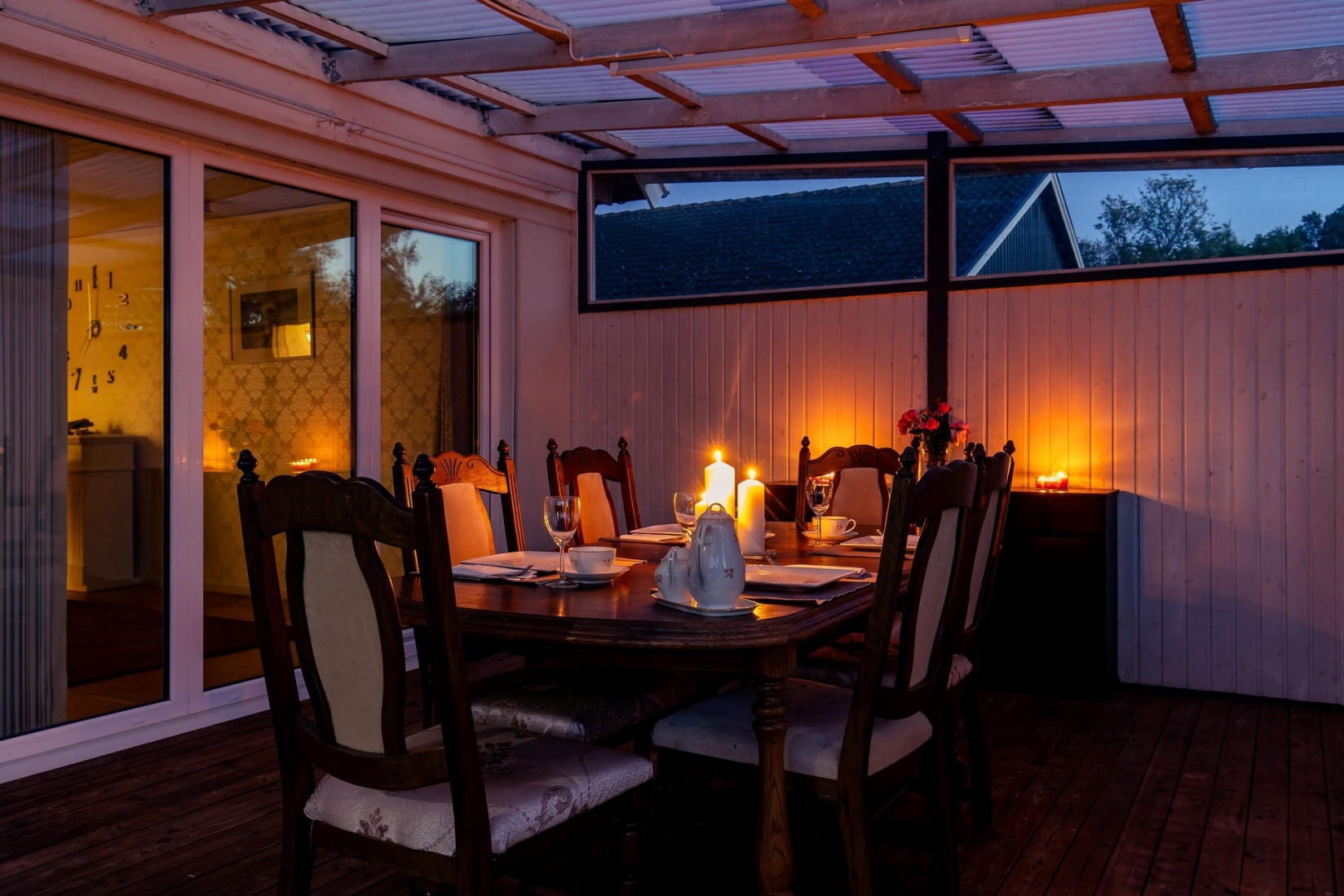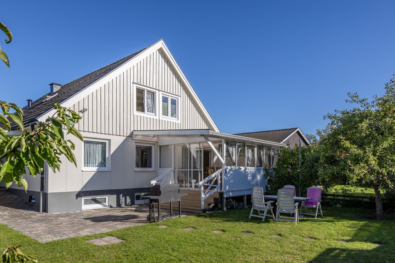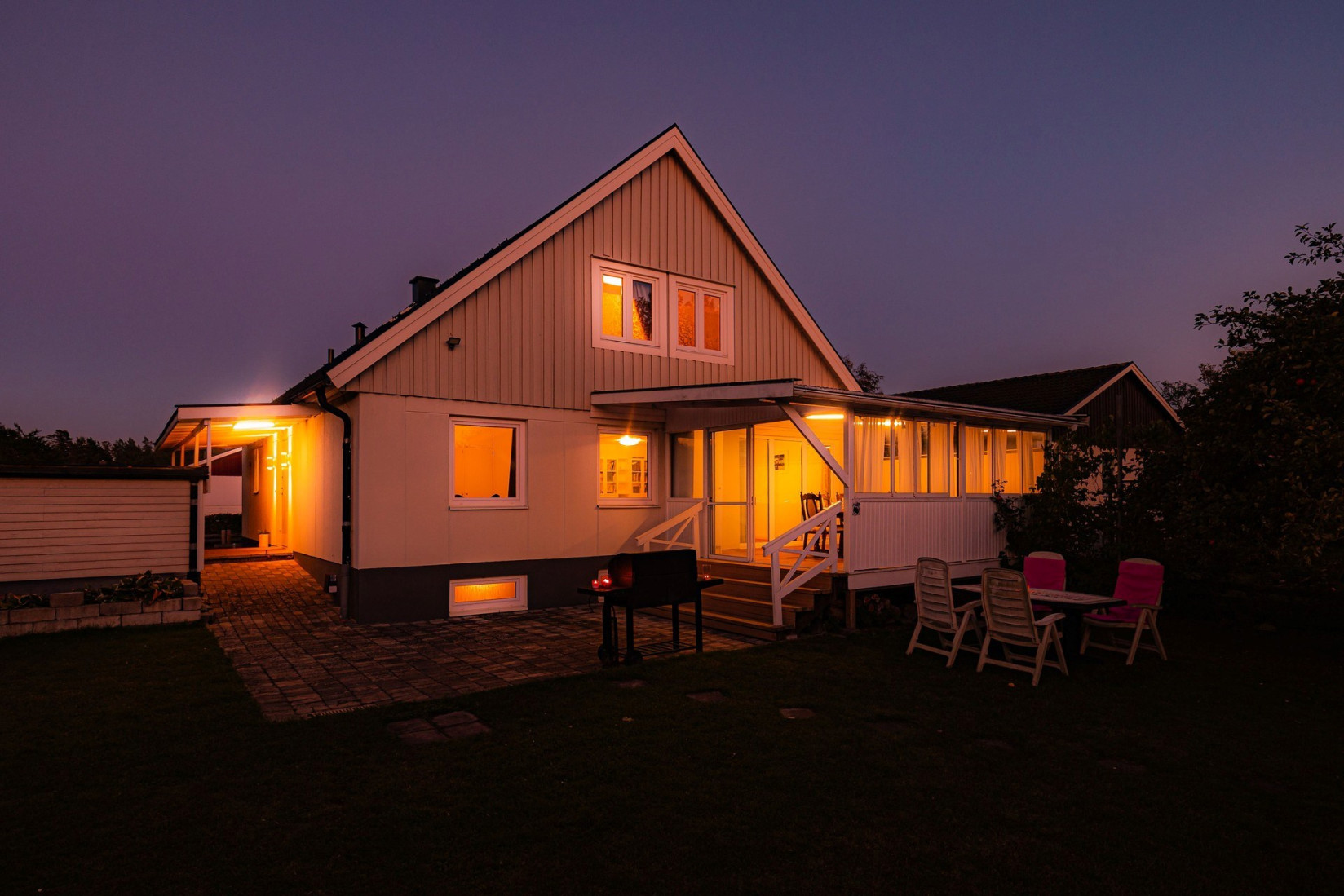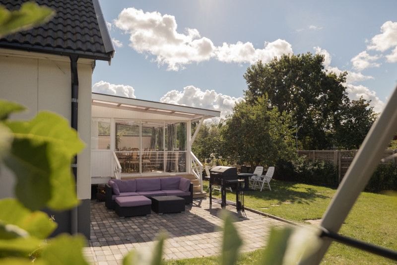 Den inglasade altanen har skjutpartier både som glaspartier och dörrpartier. Här kan du njuta av eftermiddagssolen och en härlig utsikt, oavsett väder. En perfekt plats för både lugna stunder och sociala sammankomster.