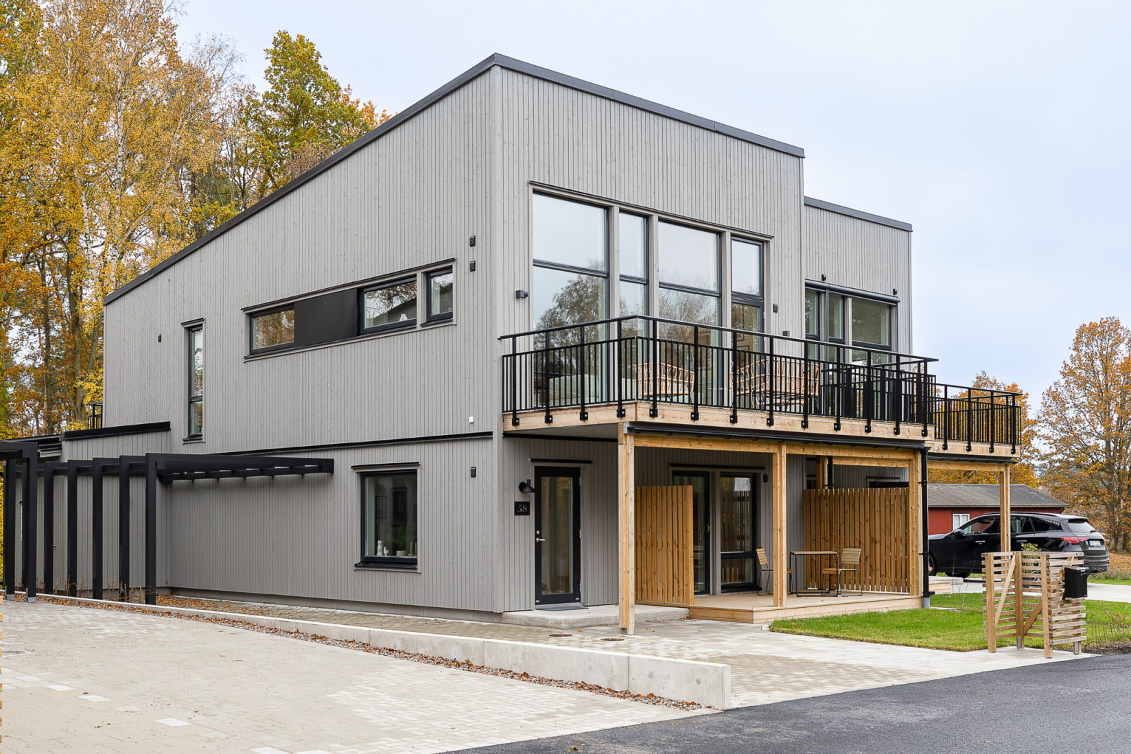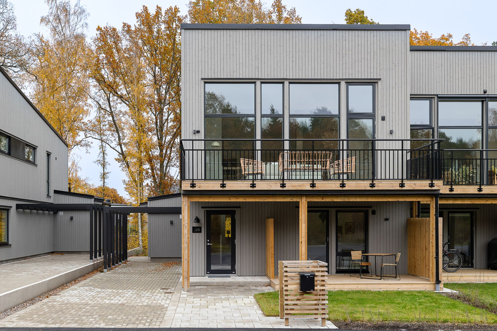Golv: Klinker grå 30x30 cm / Eklamell Kährs Taranto 3-stav vit mattlack.