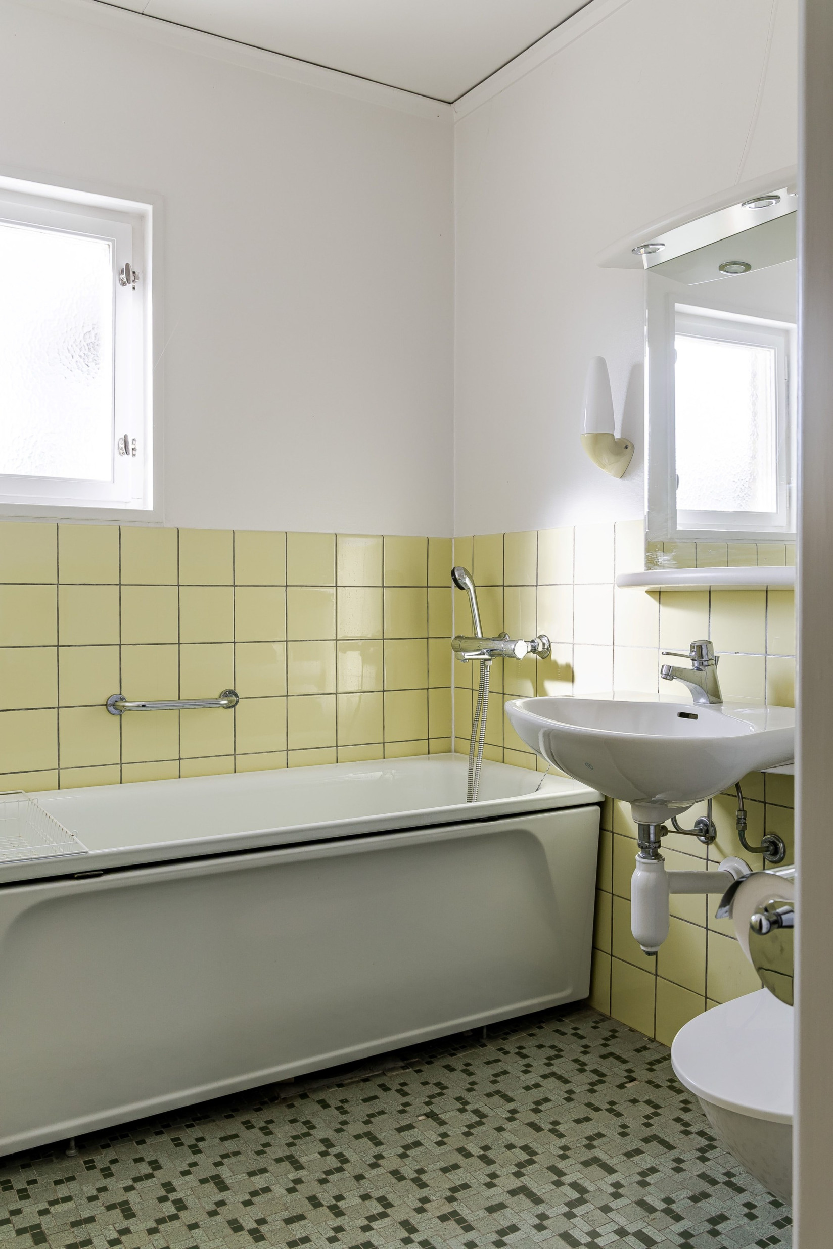 - Äldre BADRUM med keramiskt golv, halvkaklade väggar, WC, handfat samt badkar.
