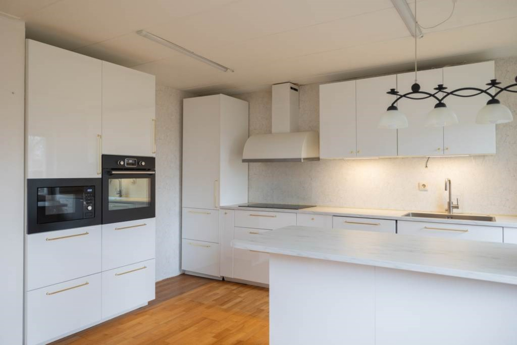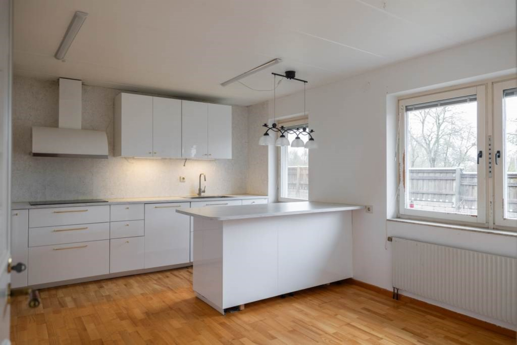 Det ljusa köket, nya stommar från 2023, utrustat med moderna apparater och en separat köksö. Här finns gott om arbetsytor för matlagning och en rymlig matplats med två fönster som vetter mot trädgården.