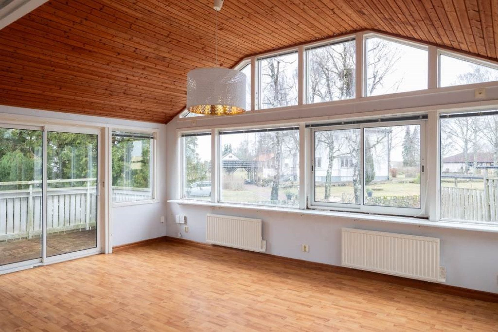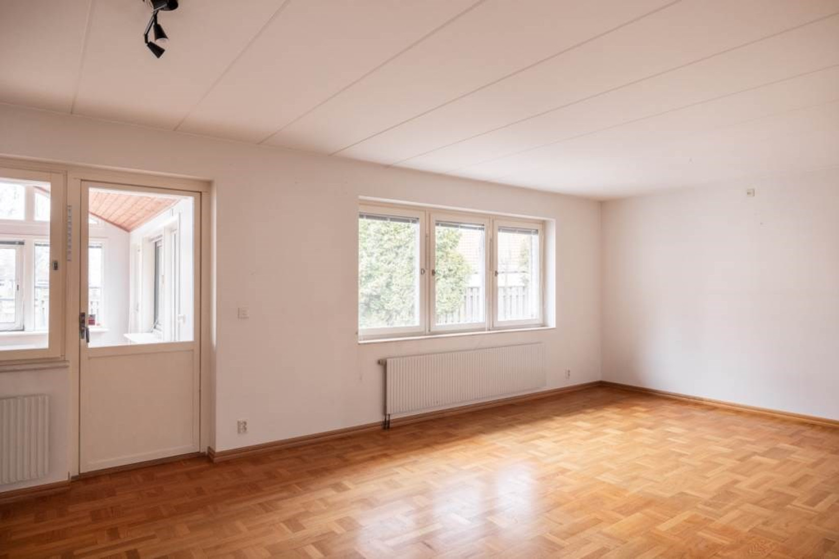 Vardagsrummet pryds av vackert parkettgolv och ljusa ytor som ger en luftig känsla. En dörr leder till det inbjudande uterummet, perfekt för att njuta av naturen från tidig vår till sen höst.