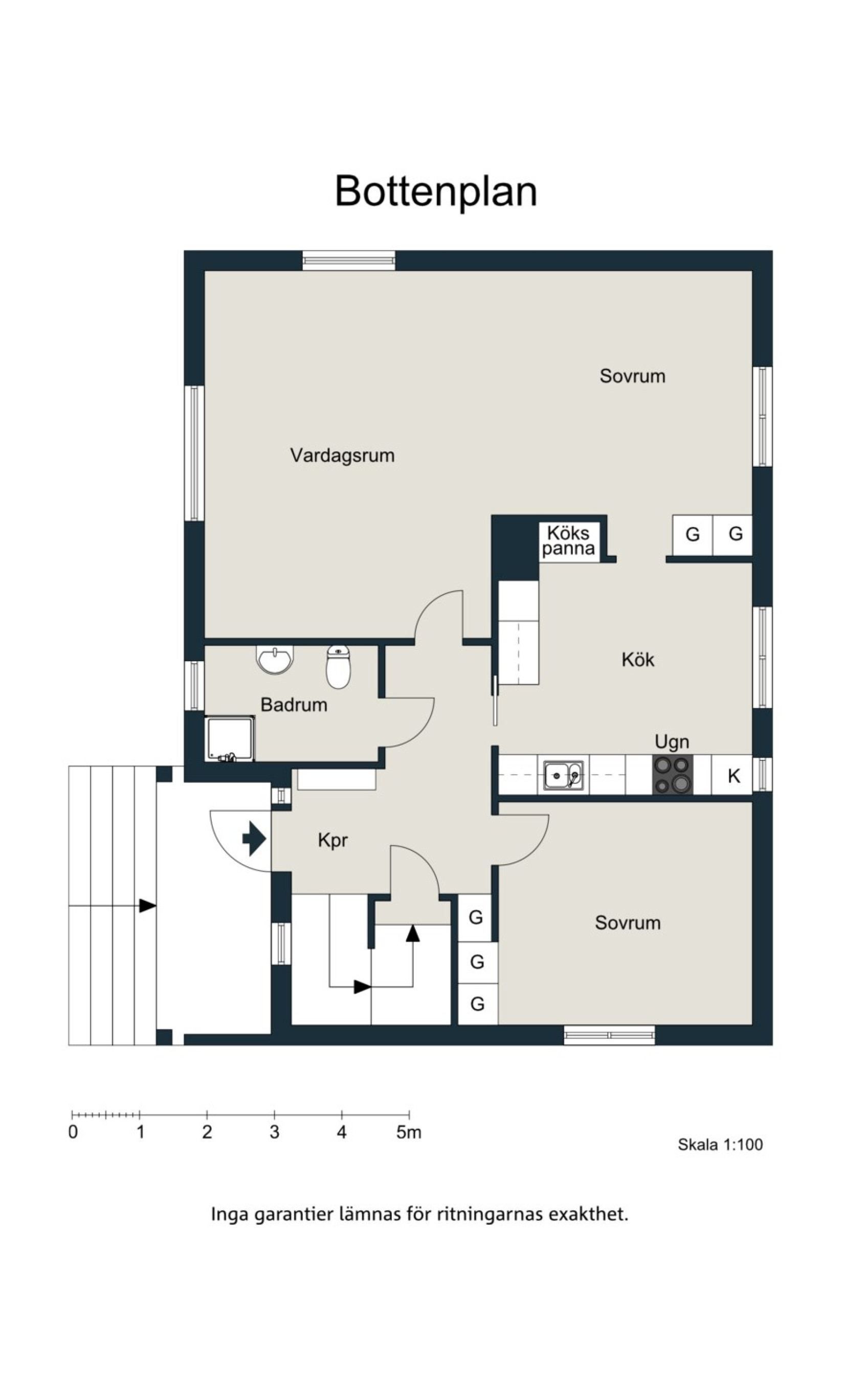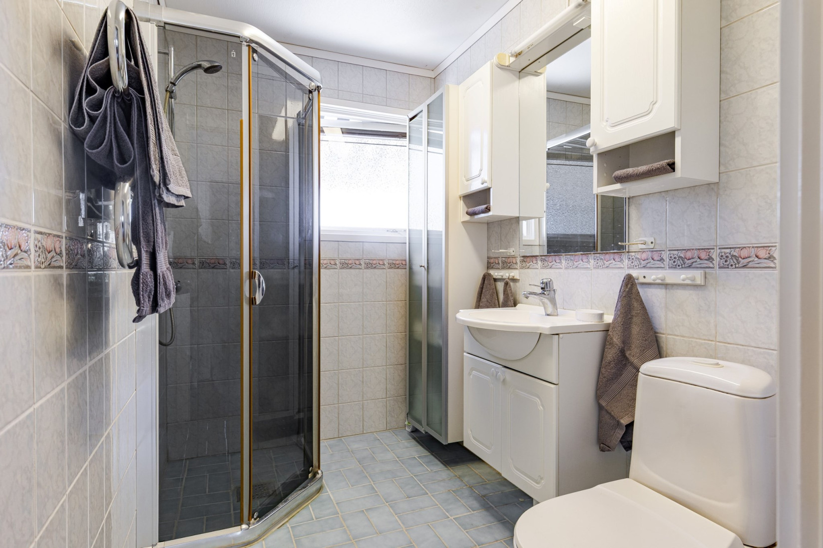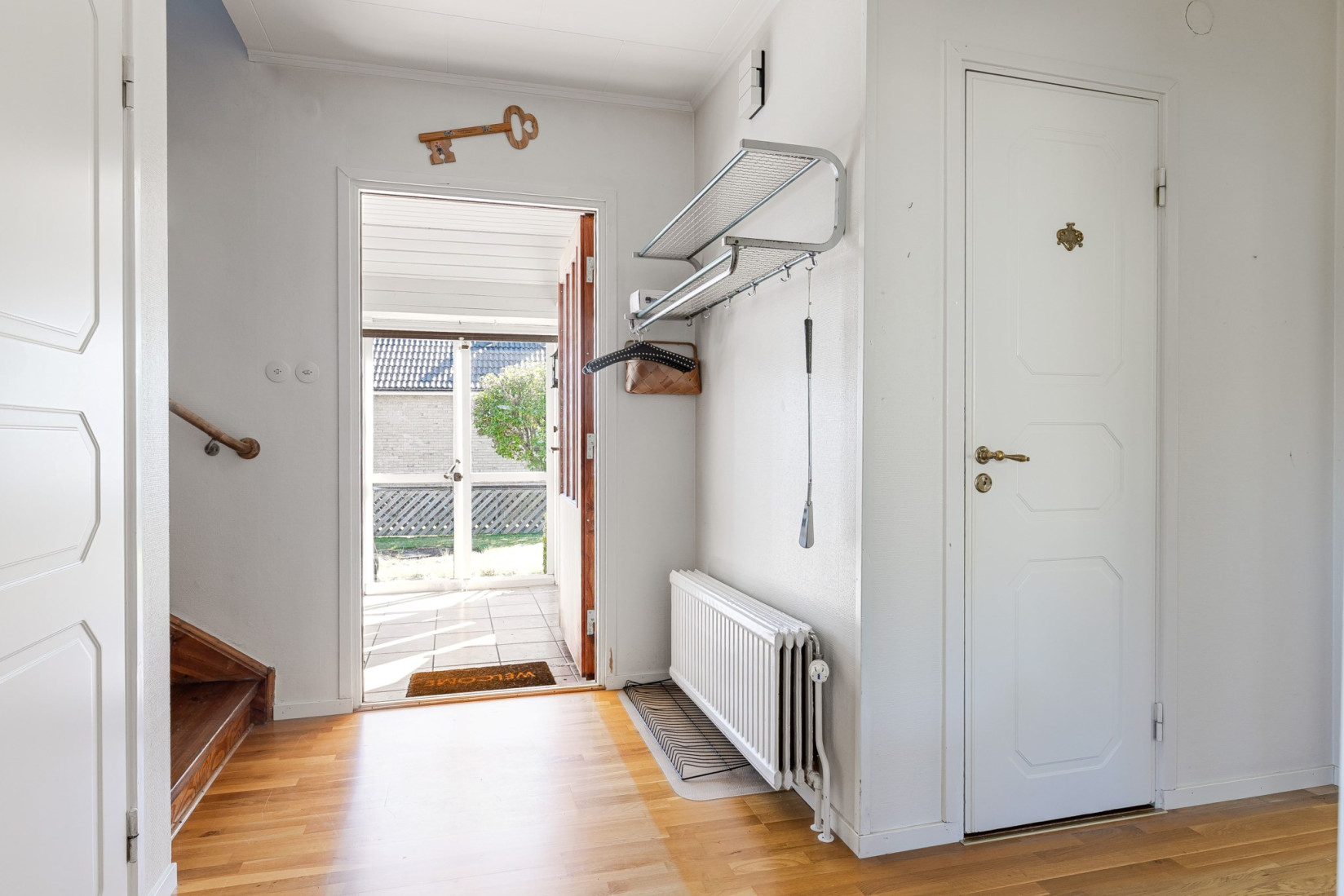 På entréplan finns också ett rofyllt sovrum som lämpar sig utmärkt som föräldrarsovrum, samt ett helkaklat badrum utrustat med dusch, kommod med handfat, toalett, handdukstork och ett öppningsbart fönster som ger både ljus och god ventilation.